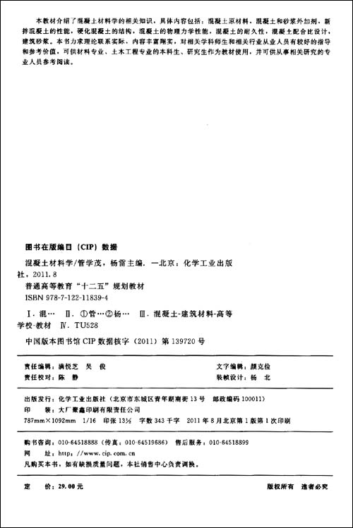 《混凝土材料学》为普通高等教育“十二五”规划教材之一。