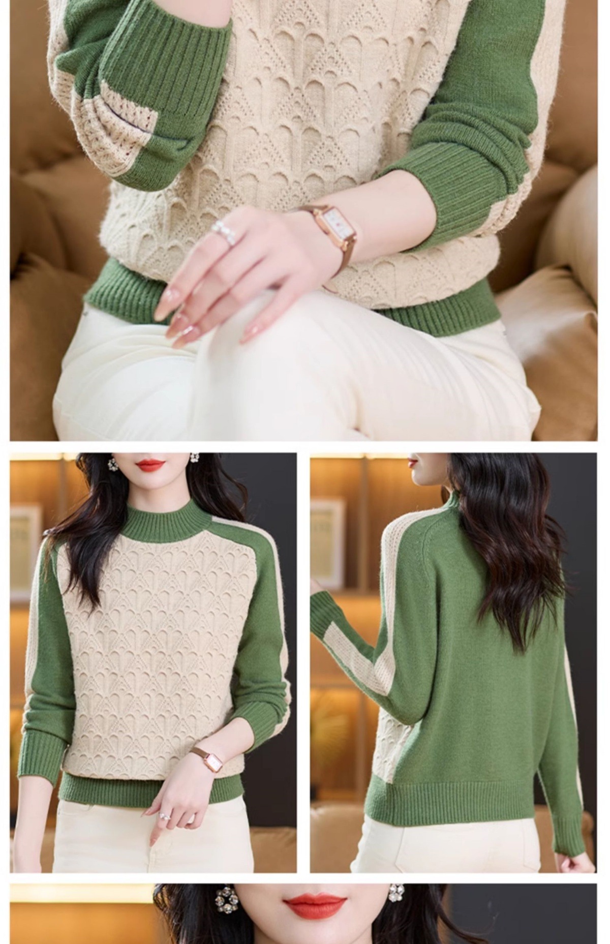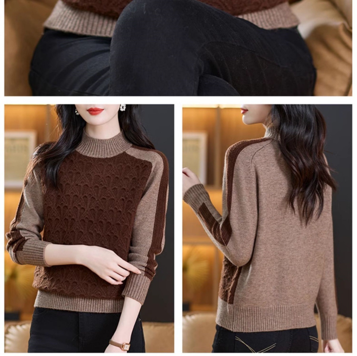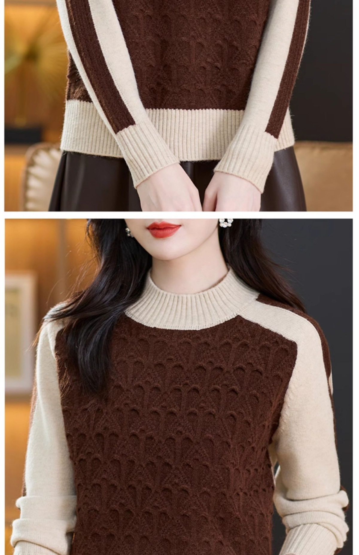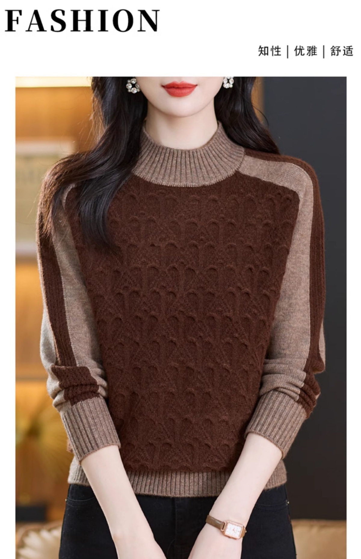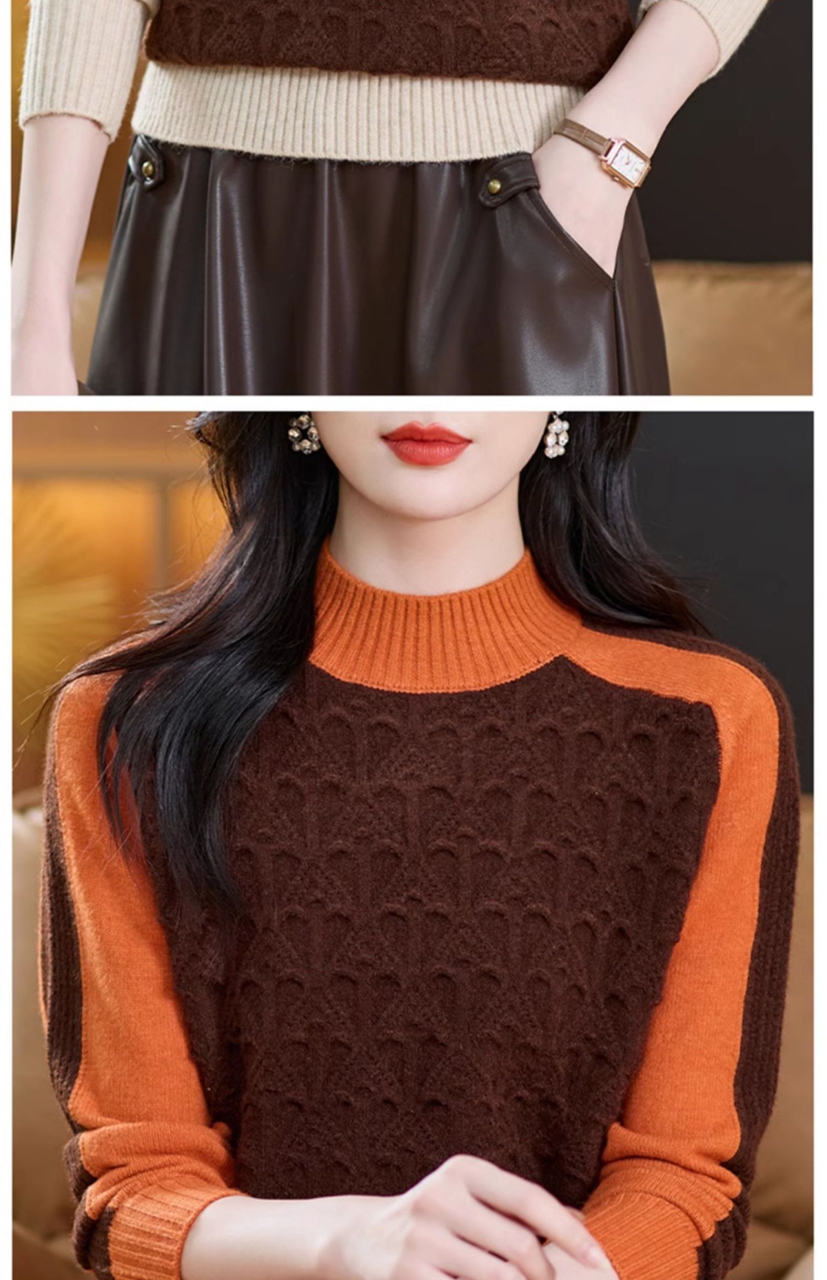 CC-101-689132半高领针织毛衣女秋冬宽松遮肚打底上衣拼色内搭毛衣厚