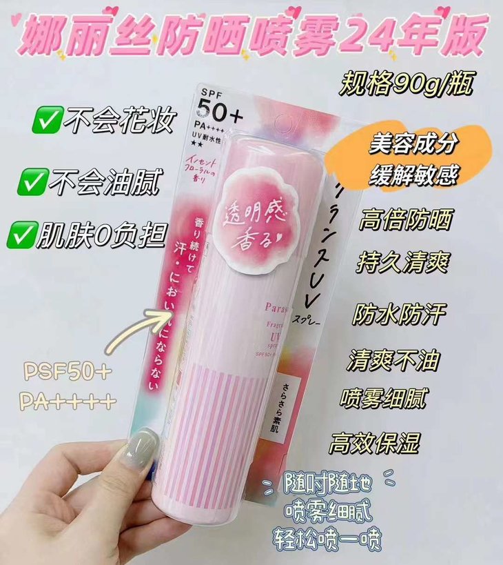 👑娜丽丝防晒喷雾90g 24年版 🔥SPF50+ PA++++ 🙌脸和身体都能用防晒喷雾,喷出来有凉感,会降温, 💦补充肌肤水分,防水抗汗,质地细腻,不油不闷,十分清爽~ 🌹还有一大好处就是它不受妆前妆后的困扰,随时随地喷一喷,不会花妆,而且干净卫生!