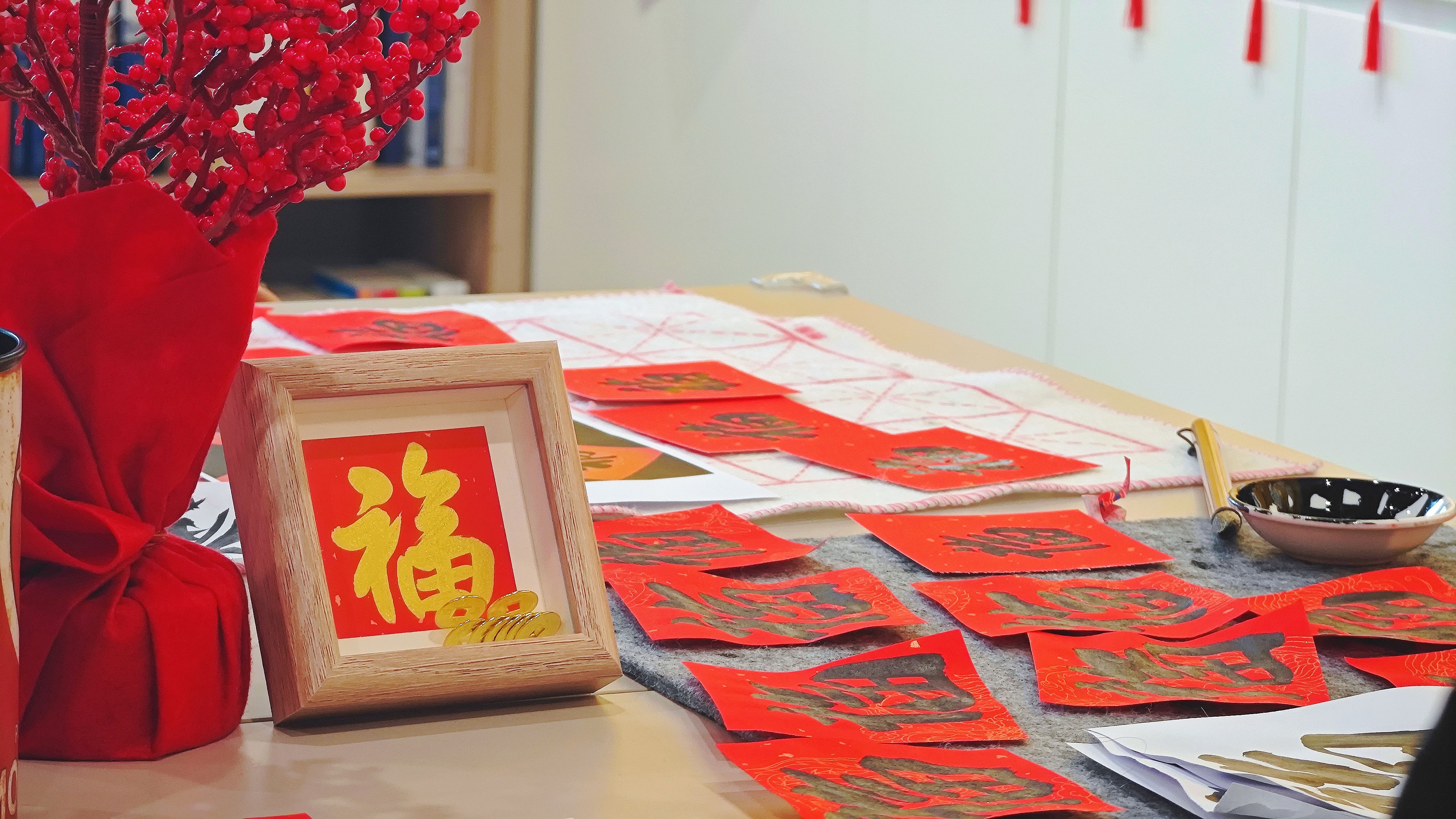巧手装裱:在老师与工作人员的协助下,将墨宝精心装入实木相框,一件高雅的新春摆件即刻呈现。