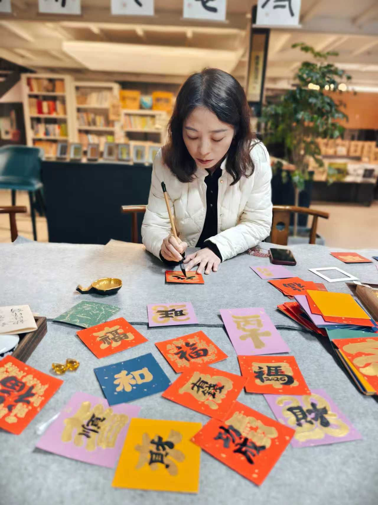 静心书写:在热闹喜庆的环境中,家人齐动手,潜心创作自己的“福”字作品。