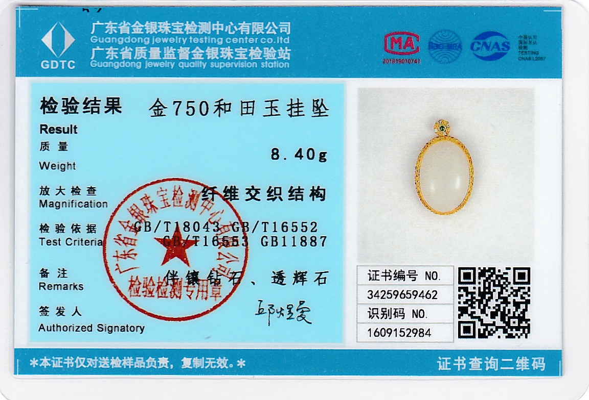 18k古法黄金和田玉(白玉)吊坠