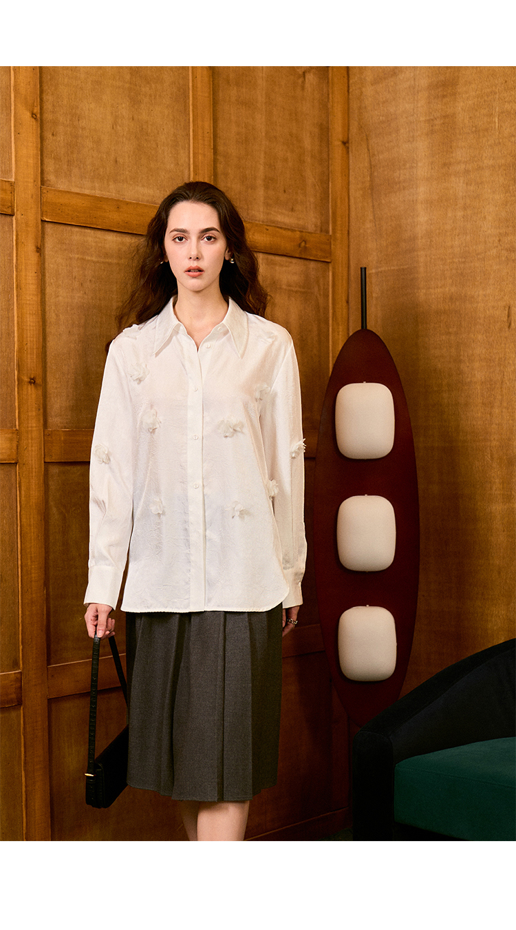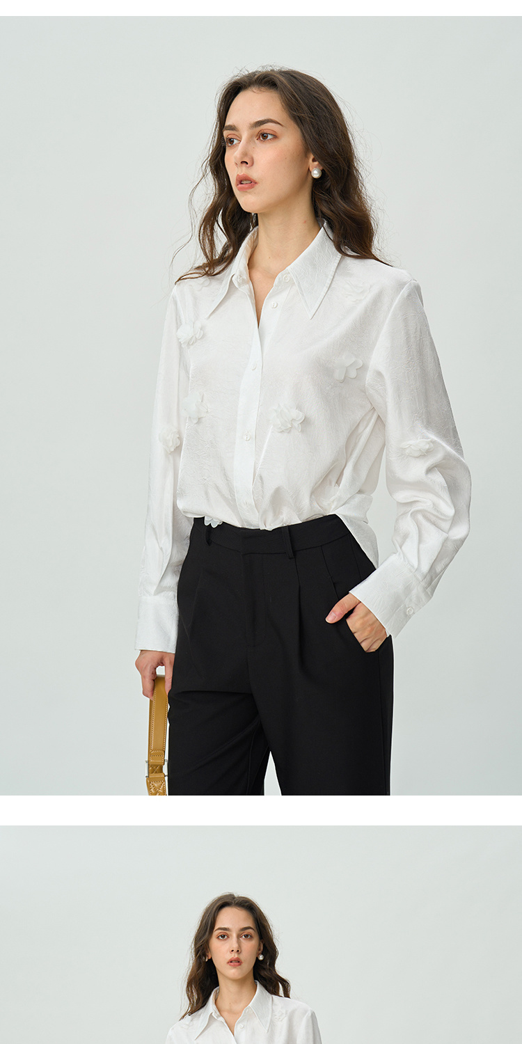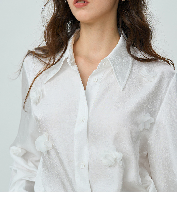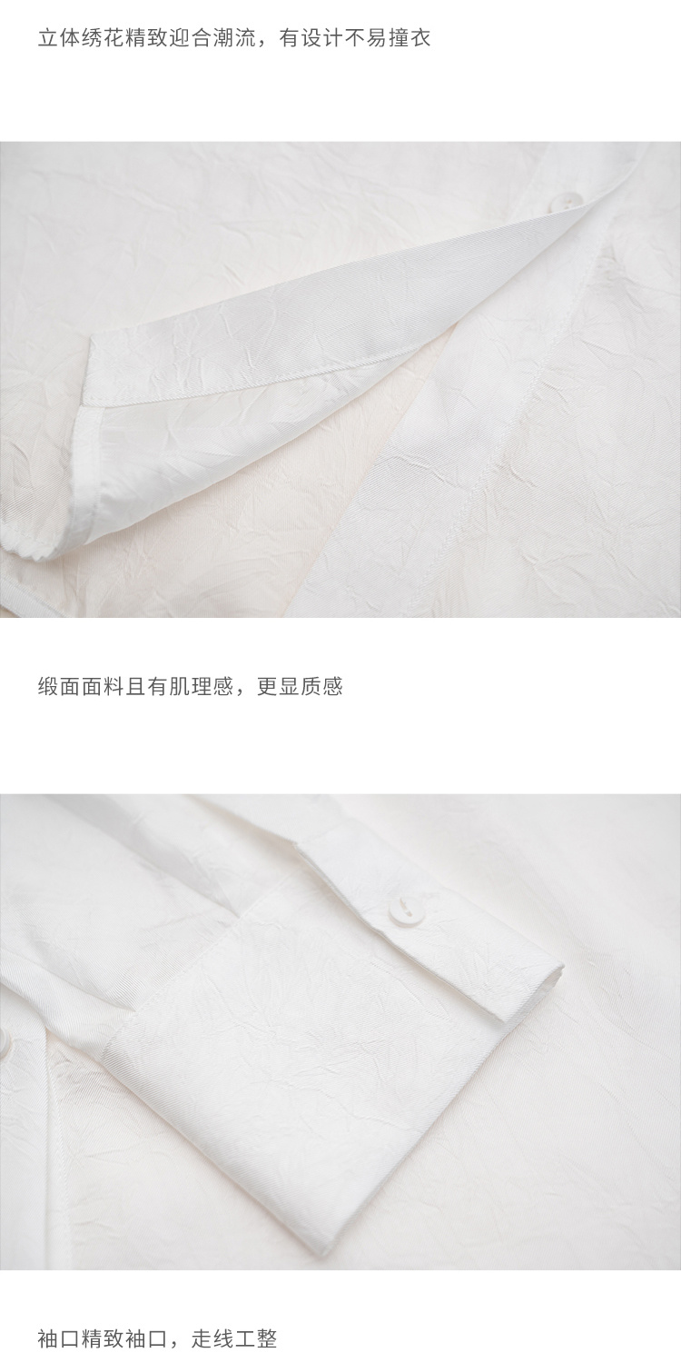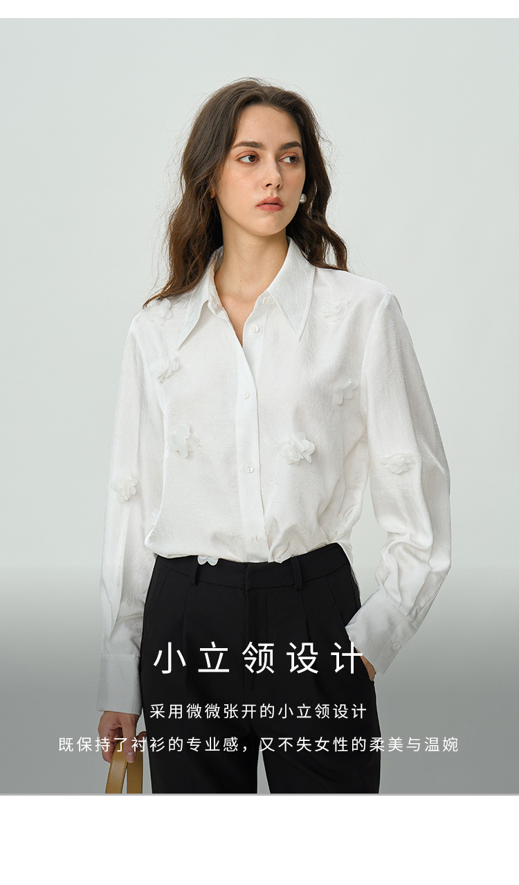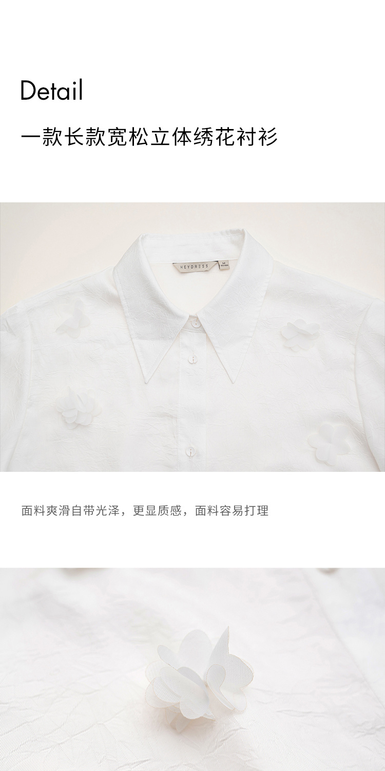 HeyDress立体绣花衬衫女白色缎面设计感通勤优雅气质宽松百搭上衣