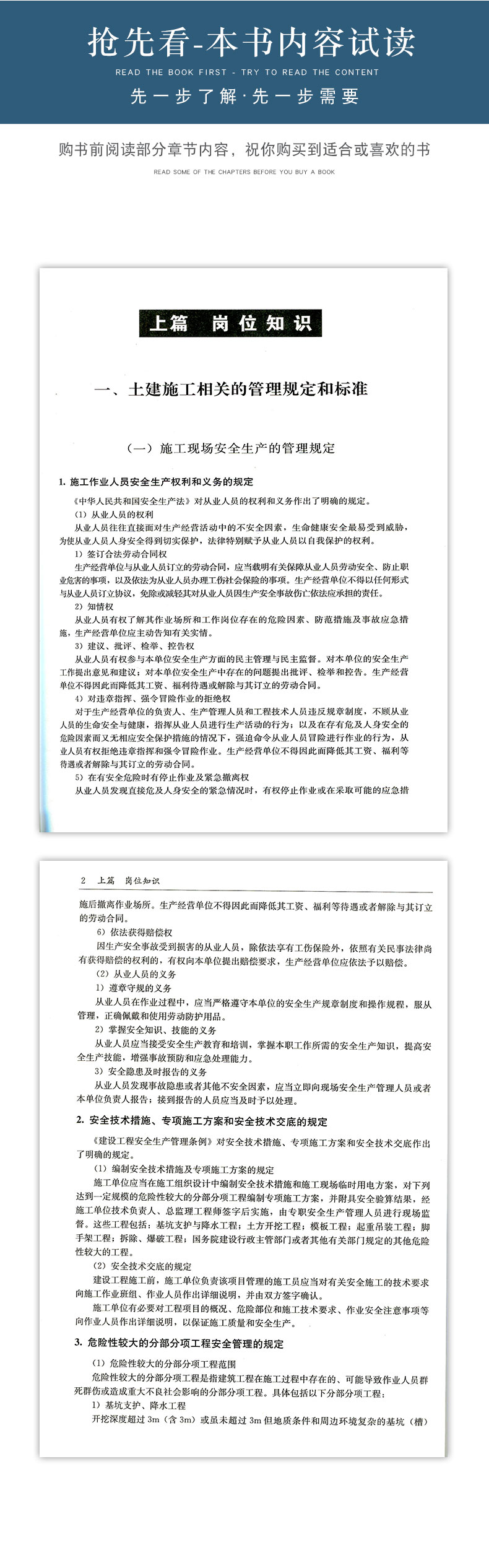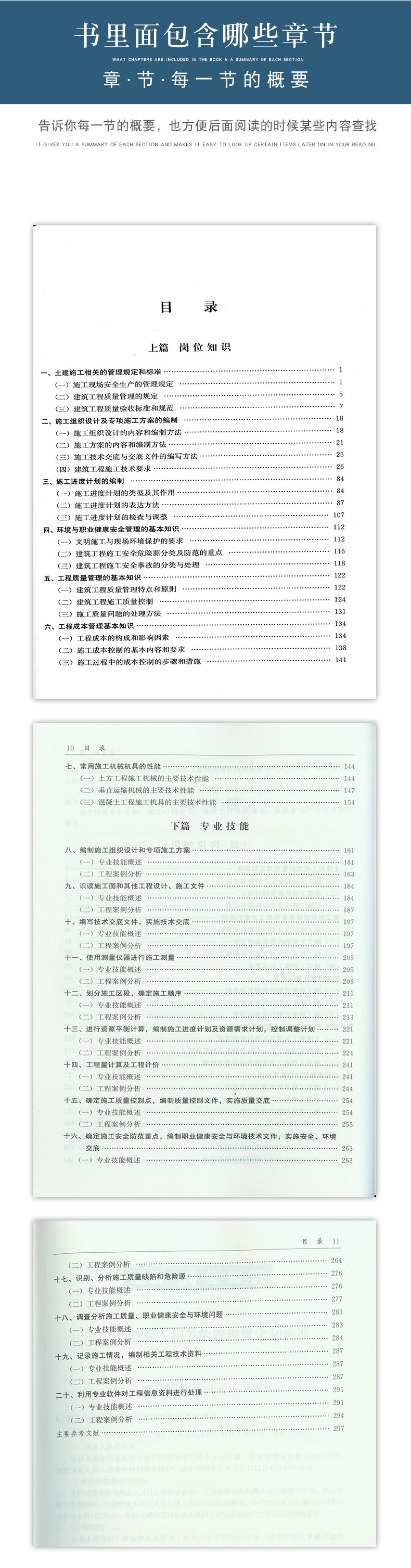 本书是根据中华人民共和国住房和城乡建设部颁布的《建筑与市政工程施工现场专业 人员职业标准》JGJ/T 250-2011和建筑与市政工程施工员(土建方向)考核评价大纲编 写的,与《施工员通用与基础知识》一书配套使用。 本次修订,增加了装配式混凝土结构施工技术、分部分项工程施工案例等方面的内 容,替换了部分废止规范。 本次修订后,主要内容包括:土建施工相关的管理规定和标准;施工组织设计及专项 施工方案的编制,施工进度计划的编制,环境与职业健康安全管理的基本知识,工程质量 管理的基本知识:工程成本管理基本知识:常用施工机械机具的性能,编制施工组织设计 和专项施工方案;识读施工图和其他工程设计、施工文件,编写技术交底文件,实施技术 交底:使用测量仪器进行施工测量,划分施工区段,确定施工顺序;进行资源平衡计算, 编制施工进度计划及资源需求计划,控制调整计划;工程量计算及工程计价,确定施工质 量控制点,编制质量控制文件,实施质量交底;确定施工安全防范重点,编制职业健康安 全与环境技术文件,实施安全、环境交底,识别、分析施工质量缺陷和危险源,调查分析 施工质量、职业健康安全与环境问题,记录施工情况,编制相关工程技术资料,利用专业 软件对工程信息资料进行处理。 本书为土建施工员职业岗位资格考试培训教材,也可供建设行业施工现场工作人员学 习参考。