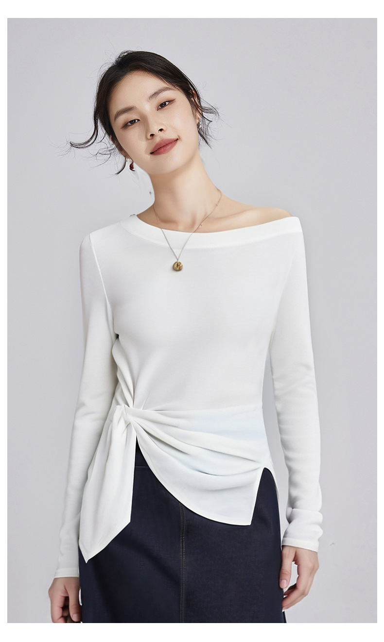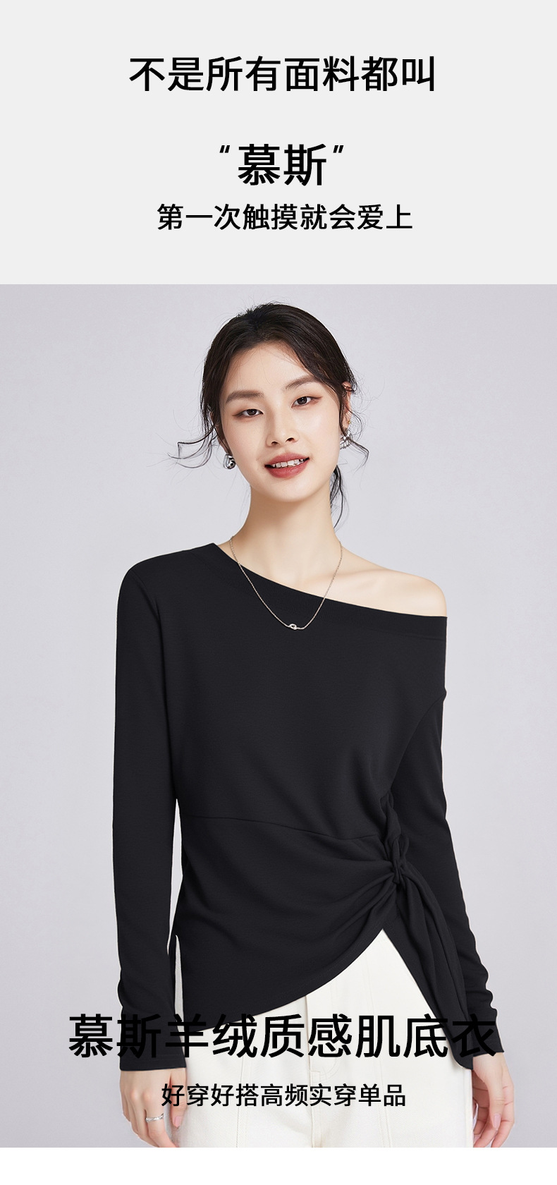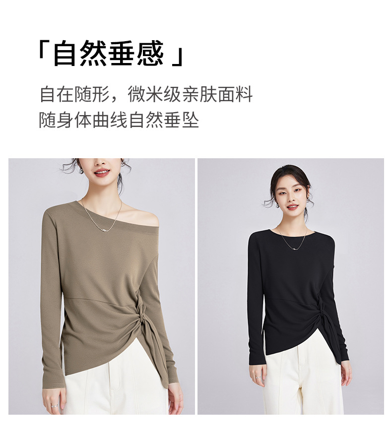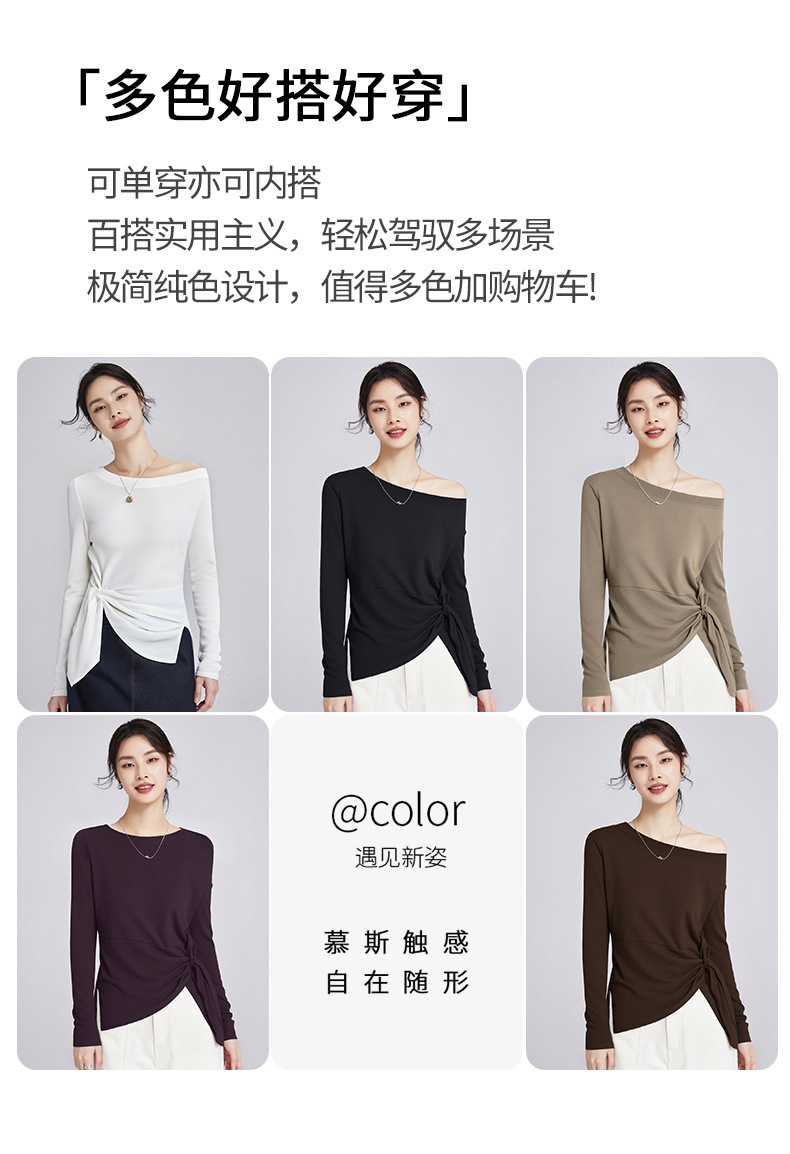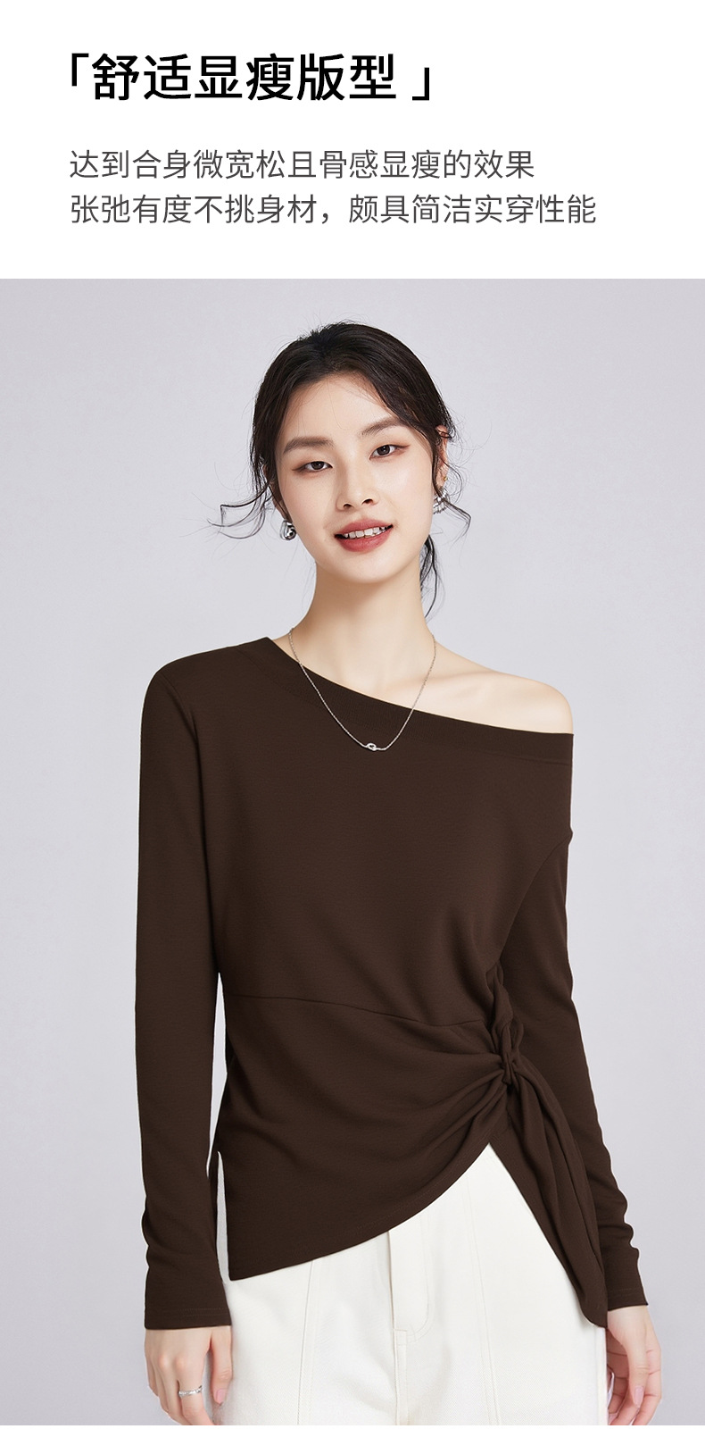 「自j」全新升级【铂金会员119/天猫159/差价40】(45508)洛诗琳一字肩长袖T恤2025秋季不规则开叉收腰打底衫上衣