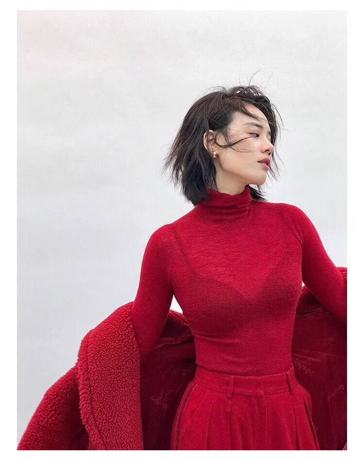 🔺海清身穿米色打底衫亮相品牌活法,内搭打底衫尽显温柔气质。纯色高领打底衫!