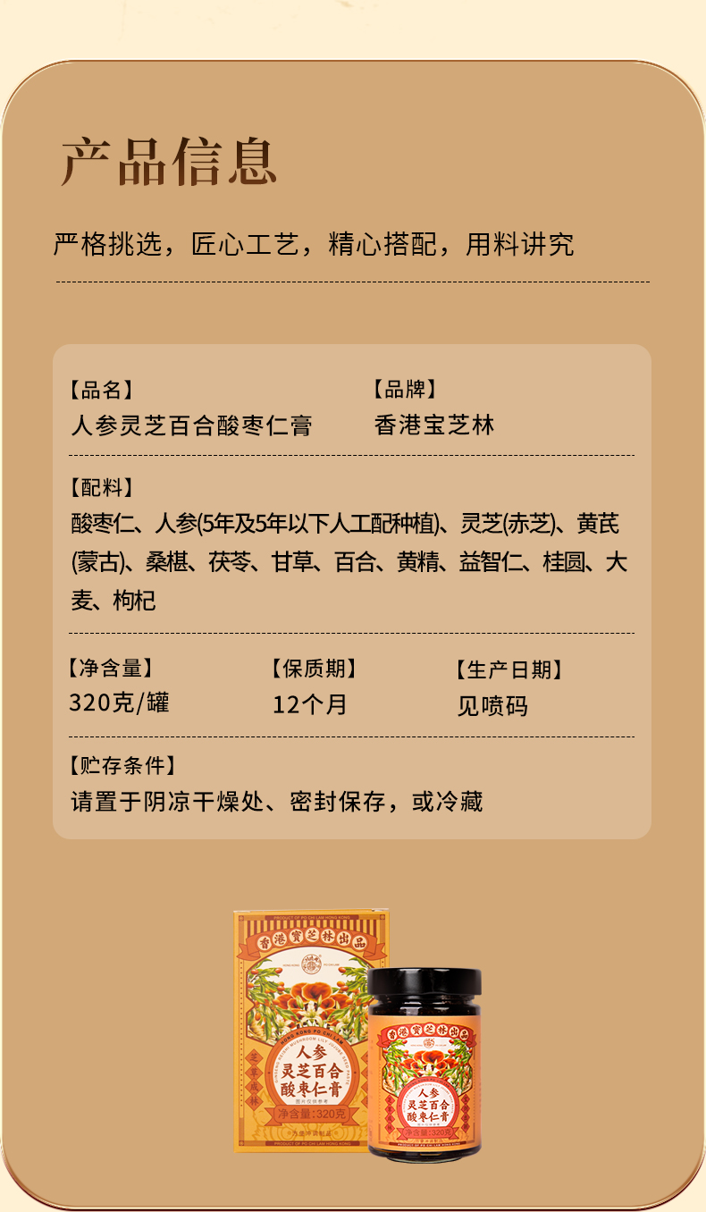【品名】香港宝芝林人参灵芝百合酸枣仁膏 【规格】320g/罐 【保质期】12个月 【储存方法】请置于阴凉干燥处,密封保存或冷藏 【发货地】安徽 【发货快递】三通一达 【不发货区域】新疆、西藏、港澳台地区不发 【补邮费地区】内蒙、甘肃、青海、宁夏+15元 【发货时效】48-72小时,节假日顺延 |