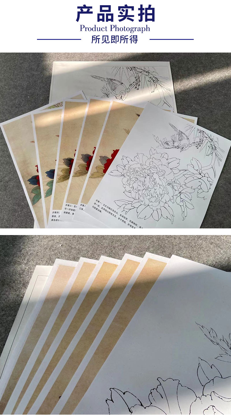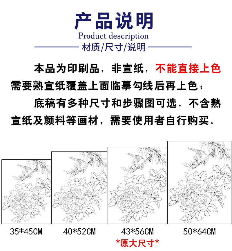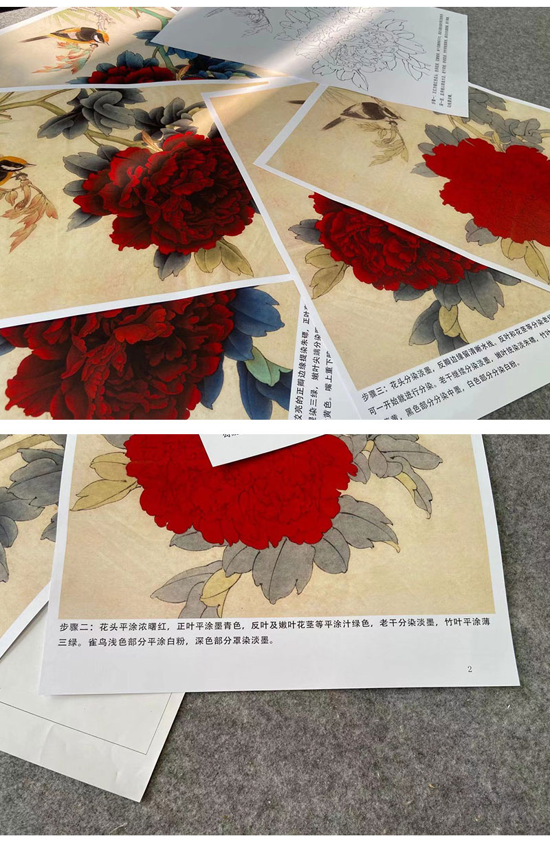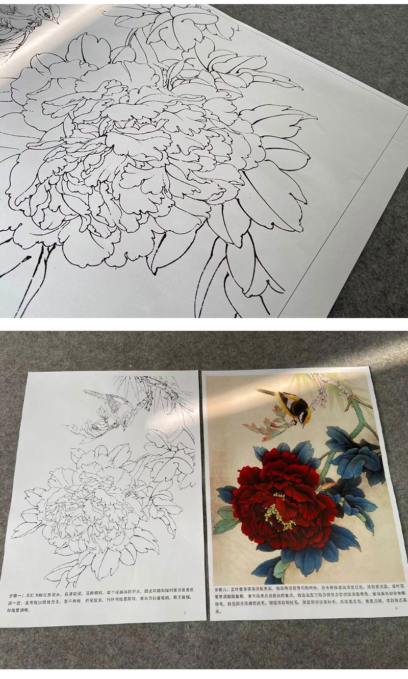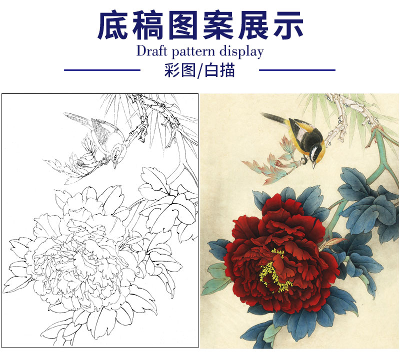 【有步骤、大彩图】李晓明工笔画白描底稿《五月王红》牡丹雀鸟初学者临摹花鸟线稿KD15