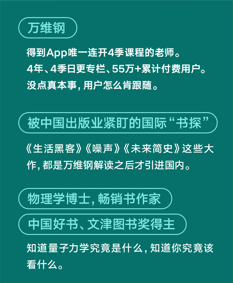 ● 你可能听过不同版本的量子力学讲解,有侧重计算的学院版、讲故事的历史版、可爱的卡通版,还有霸道总裁假装学过版。量子力学已经是一种文化,每个人都可以有自己的体验角度。 但万维钢老师的这本《量子力学究竟是什么》,无疑是非常另类又令人着迷的一个版本。因为它选择了一个与众不同的角度: 量子力学的诡秘。 日常世界里的你,此时此刻不能既在北京又在哈尔滨。但是在微观世界里,电子可以同时出现在所有的地方——它不但能既在这里又在那里,而且能同时沿着好几条不同的路线前进。 日常世界的桌子上不会突然凭空冒出一个苹果和一个橘子。但是在微观世界里,真空之中,就可以突然凭空冒出一个电子和一个正电子。 正是因为微观世界的这些“不正常”,才有了日常世界的“正常”。 量子力学是这个世界的底层逻辑,哺育了几乎所有的现代先进科技。 读完这本书,你可以了解量子力学的前世今生,了解它的发展史上那些星辰一样的人物,了解量子力学的基本概念和前沿理论,比如:全同粒子、波函数、量子隧穿、超距作用、反物质、自旋、EPR佯谬、薛定谔的猫、量子纠缠…… 但你更要了解,这些诡秘之后还藏着更大的秘密。 有人看到时,粒子才决定自己的状态?光子可以同时走过两条路径?现在能改变过去吗?平行宇宙是否存在?薛定谔的猫到底是死还是活?……通过探索微观世界中的这些不确定性,你将抓住现实世界的确定。