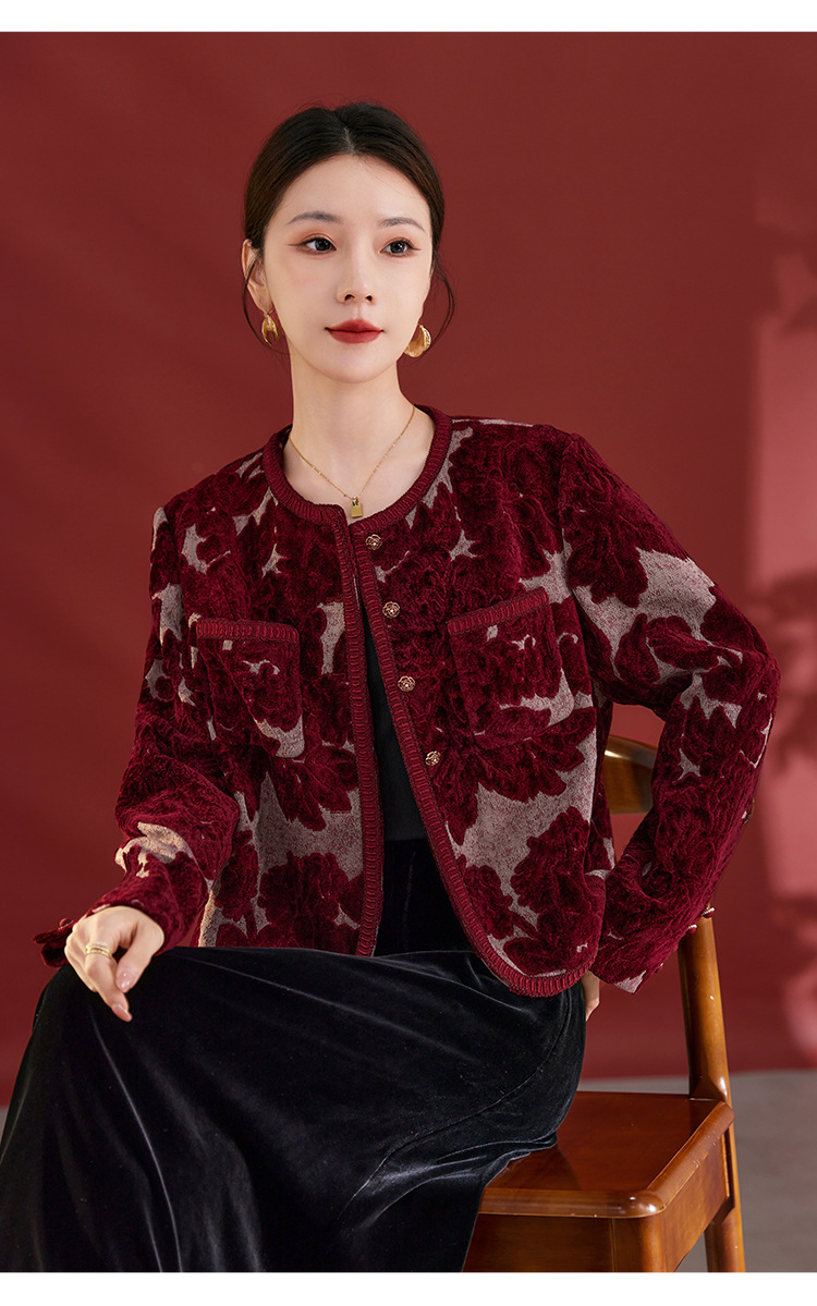QS喜婆婆高品质秋冬新款上衣外套女舒适通勤气质休闲圆领印花1291