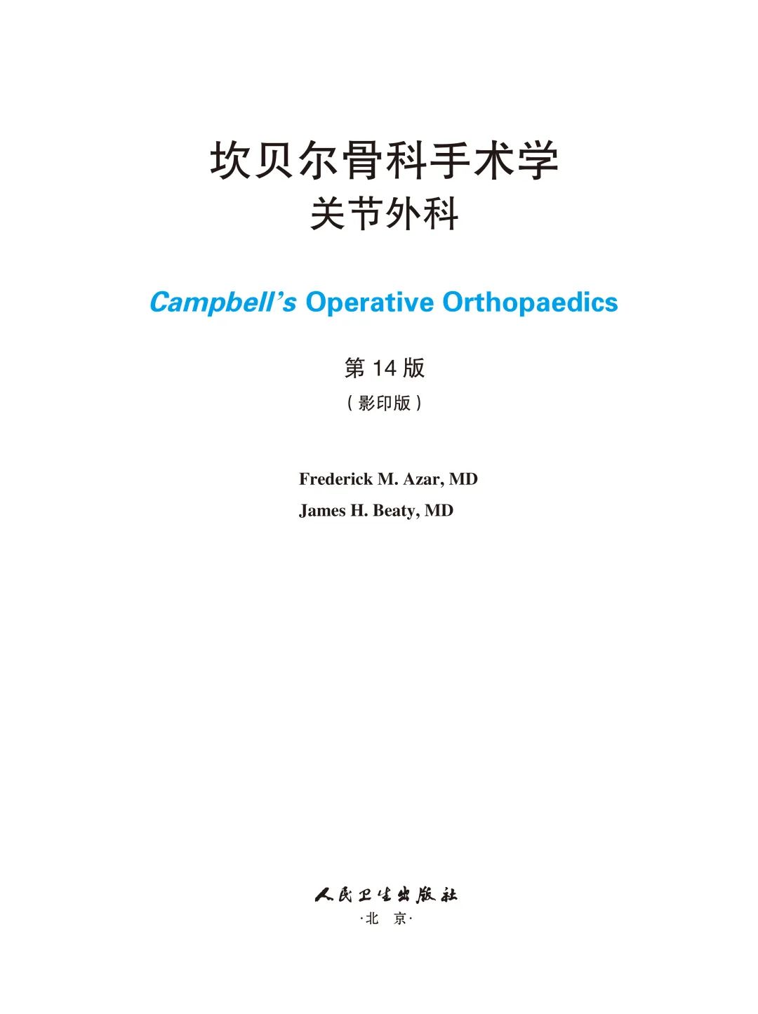 本书两位主编:Frederick M Azar博士为美国田纳西大学附属坎贝尔医院首席专家,骨科学与生物医学工程专业教授,美国骨科医学会(AAOS)名誉主席;James H. Beaty博士为美国田纳西大学附属坎贝尔医院骨科学与生物医学工程系主任、Harold B. Boyd荣誉教授。