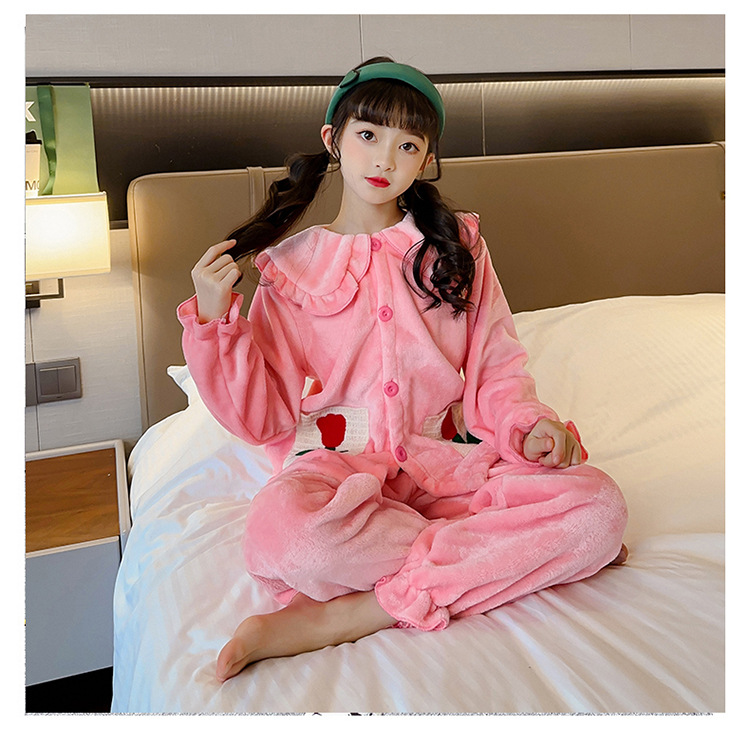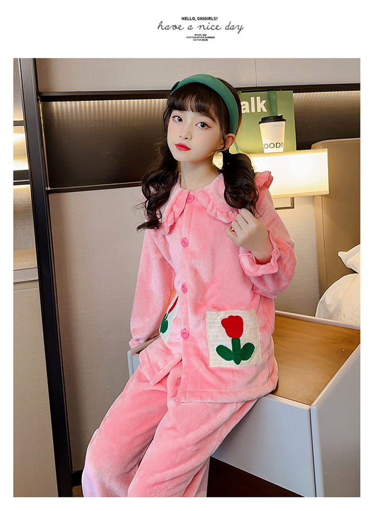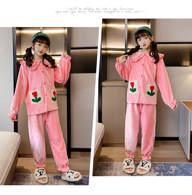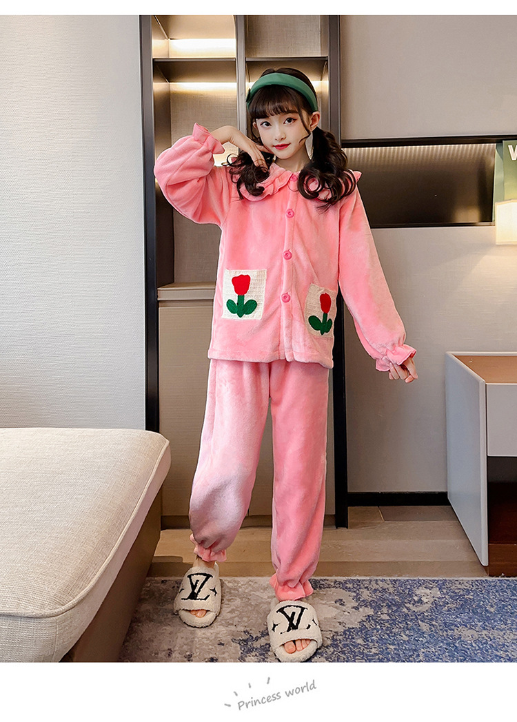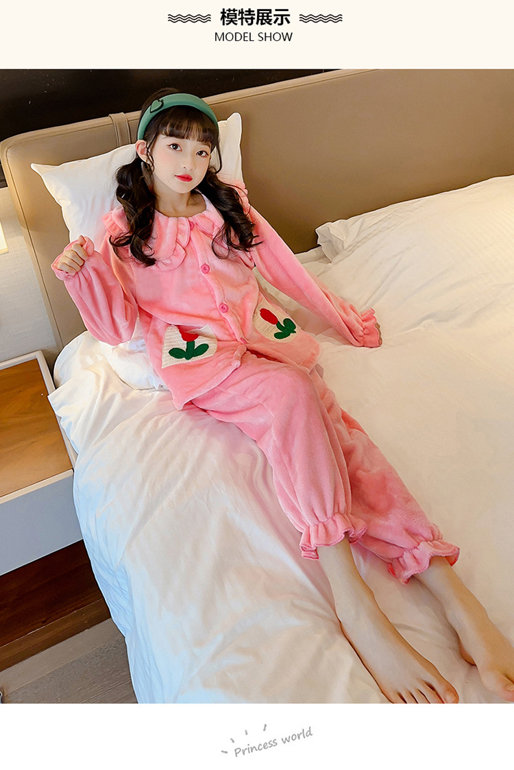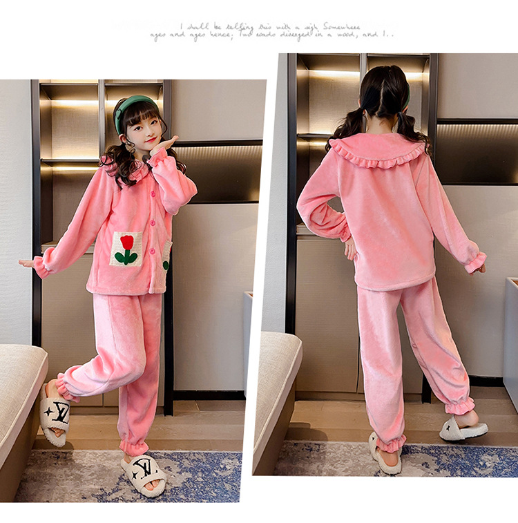 秋冬粉色法兰绒舒适睡衣,女童加绒款宝宝小孩子保暖家居服两件套童PJX-DX3943