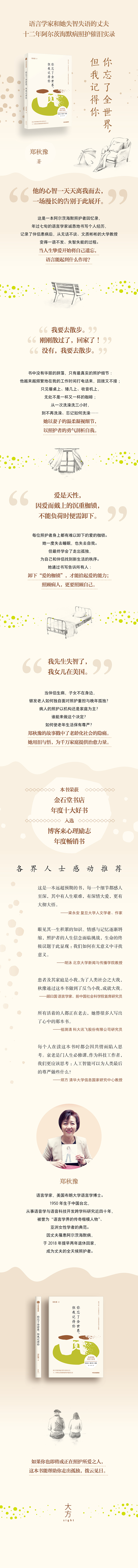 这是一本阿尔茨海默照护者回忆录,年过七旬的语言学家诚恳地书写个人经历,记录了伴侣患病后,从无话不谈、文质彬彬的大学教授变得一语不发、失智失能的过程。作为二十四小时的贴身照护者,她在被爱人遗忘和照护重担的双重打击下,一度失去睡眠,也失去自我。从“不敢生病”到“接纳脆弱”,作者通过洞察自己和病人的处境,并从亲人、朋友和社会机构方面获得支持,终走出孤独,为自己和伴侣找到了新生活的秩序。她希望借由这本书,与每一位正在或即将照护所爱之人的读者分享自己的感悟:卸下爱的枷锁,才能拾起爱的能力;照顾病人,更要照顾自己。