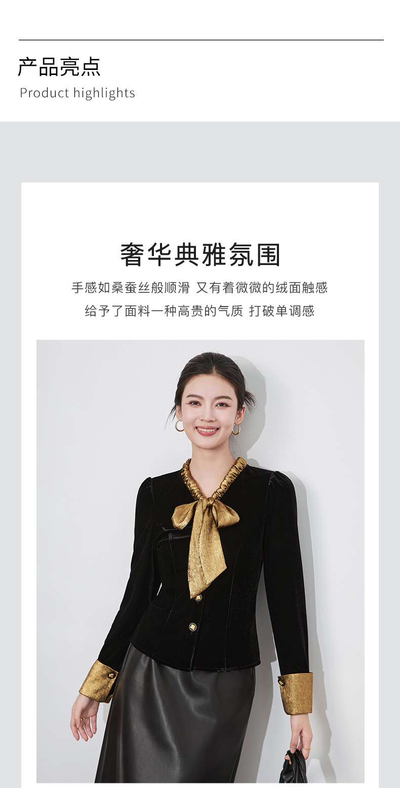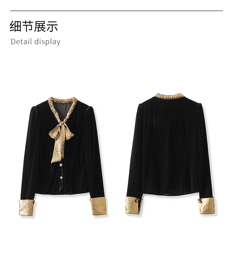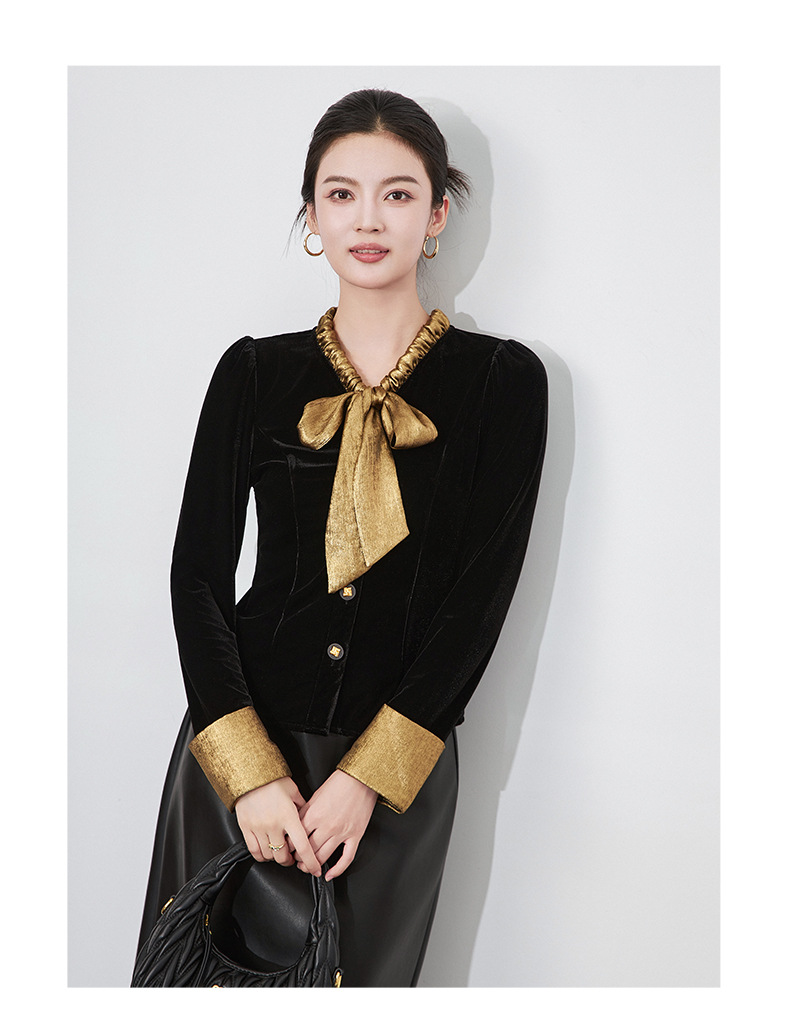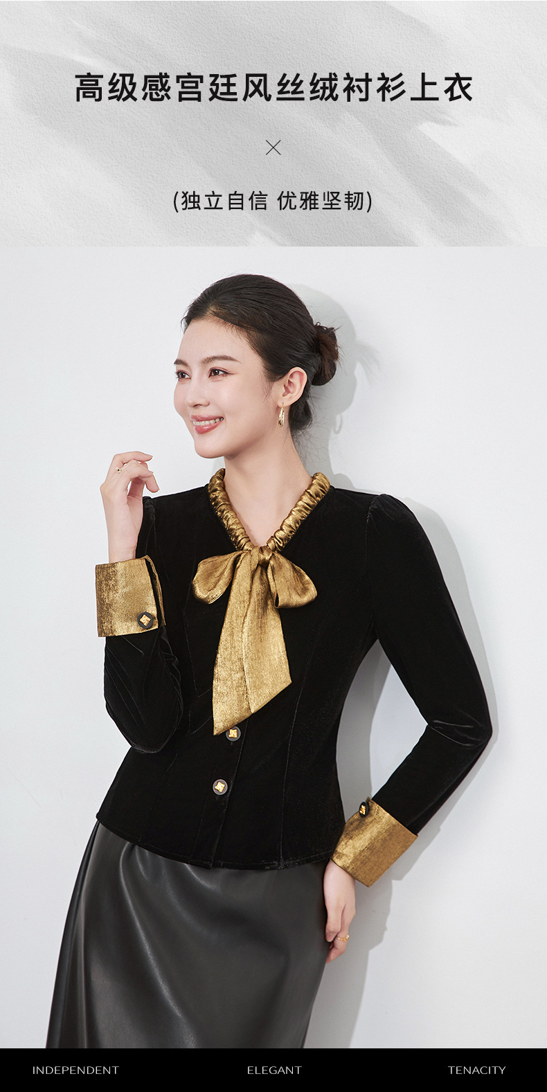 【高货wl】全新升级【铂金会员266/天猫359/差价93】(81643) 洛诗琳秋冬法式蝴蝶结系带洋气拼色收腰显瘦上衣丝绒衬衫