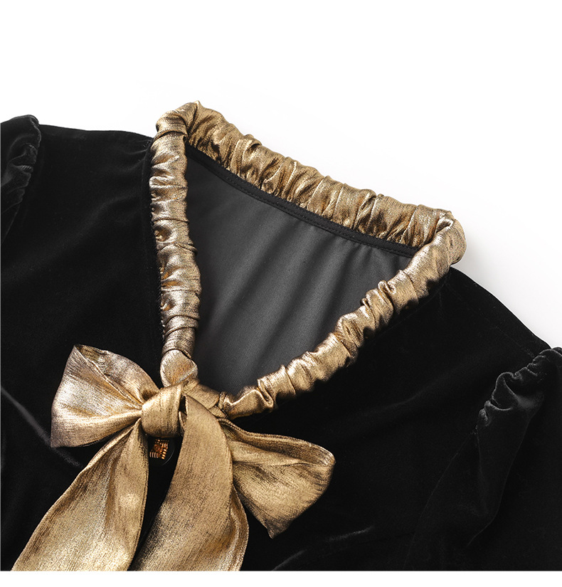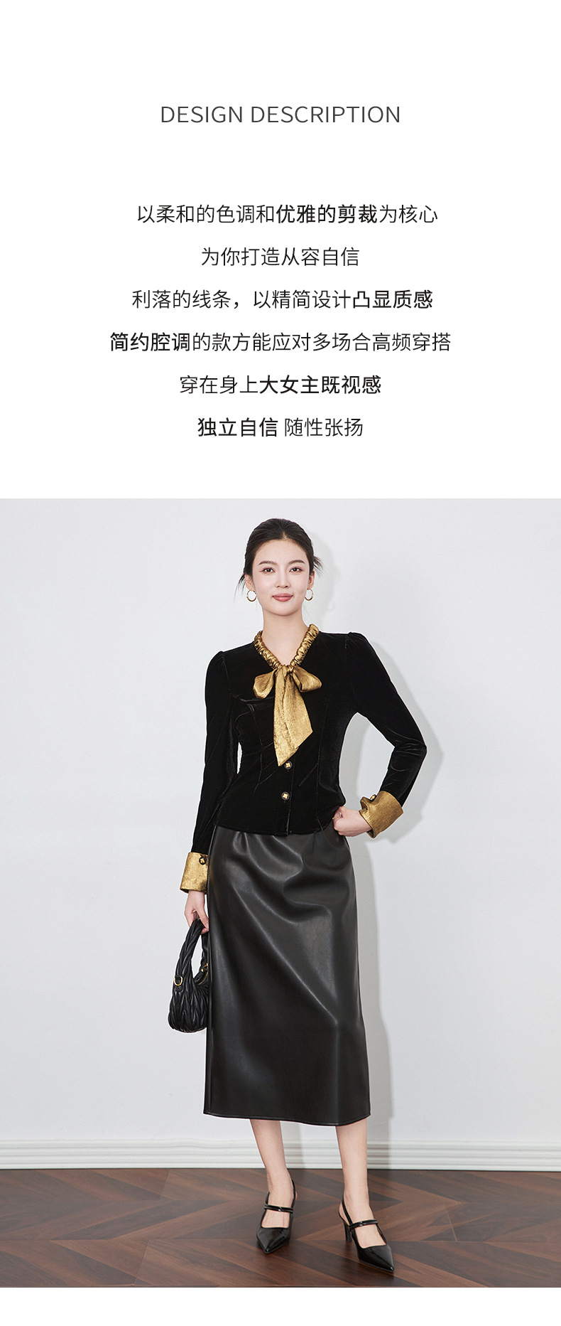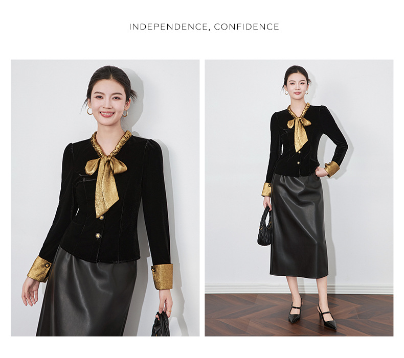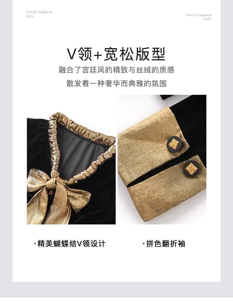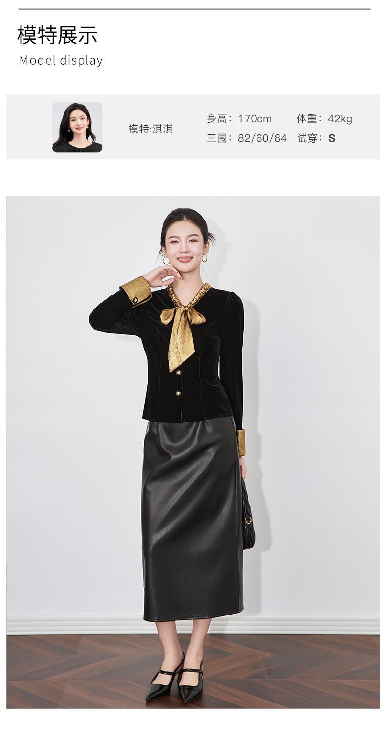 【高货wl】全新升级【铂金会员266/天猫359/差价93】(81643) 洛诗琳秋冬法式蝴蝶结系带洋气拼色收腰显瘦上衣丝绒衬衫