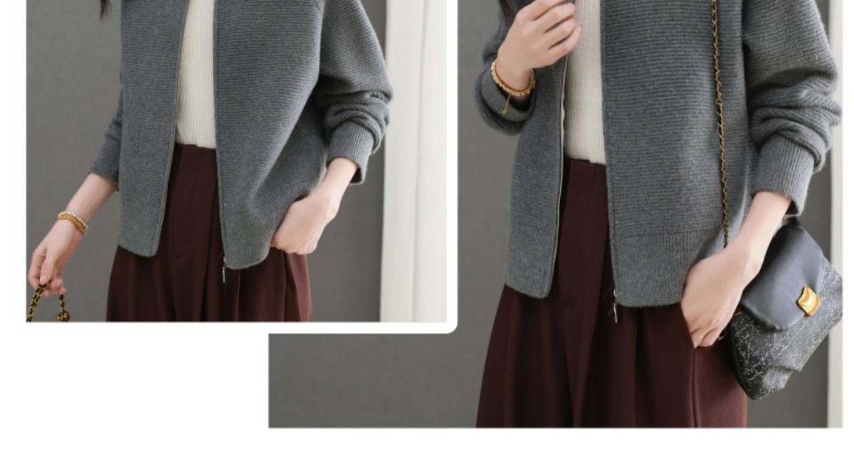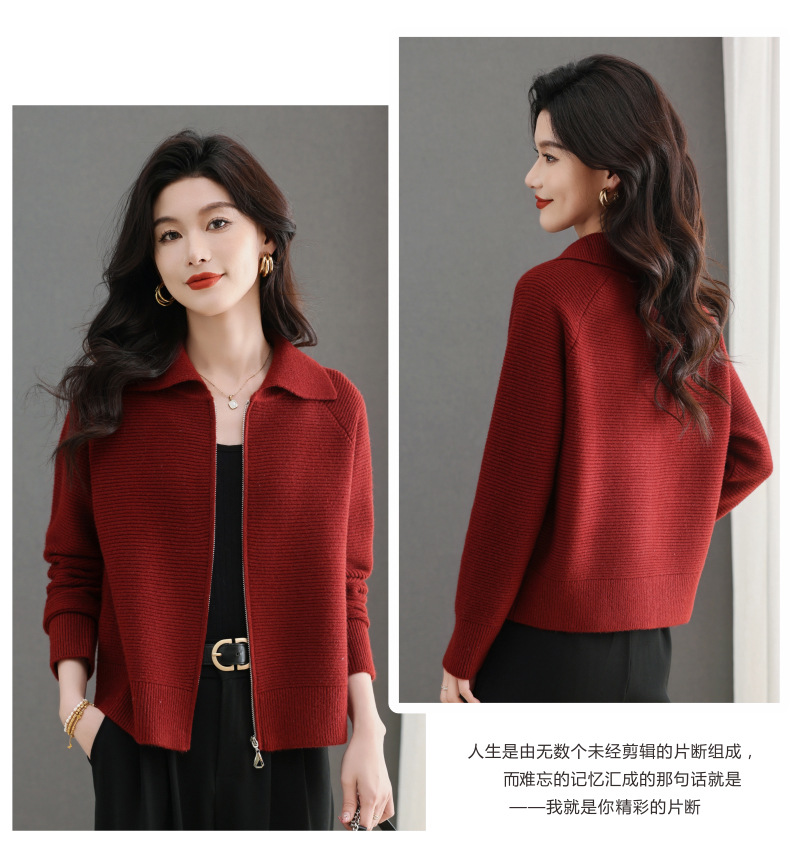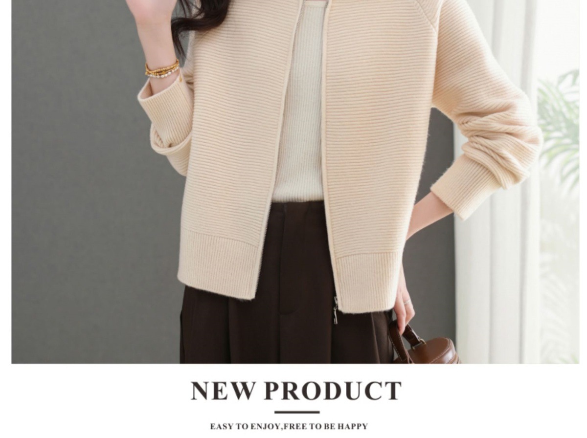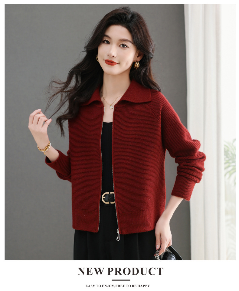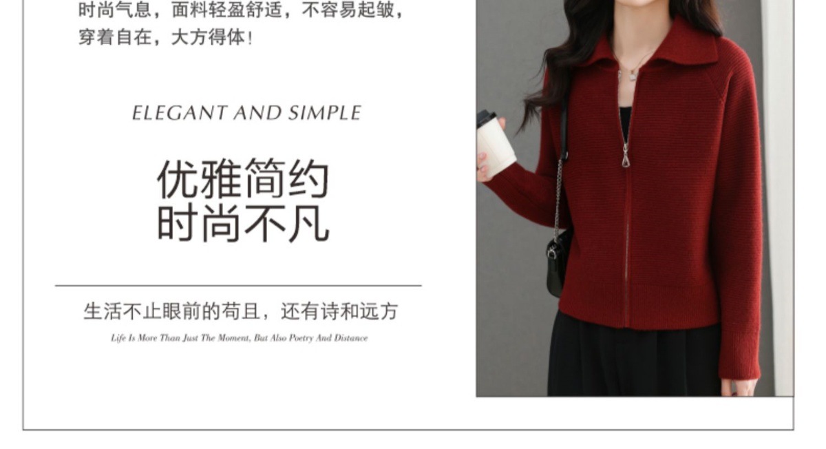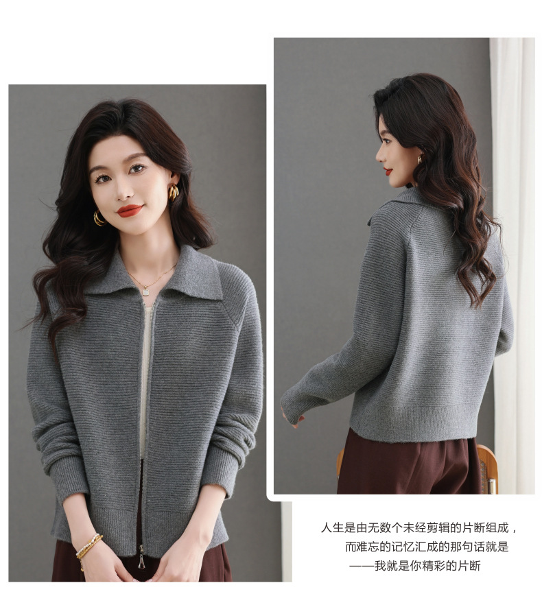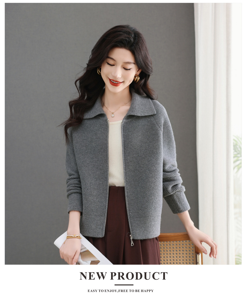 CC-5-6317纯色拉链翻领优雅气质温柔短款针织开衫2025年春秋季新款外套上衣