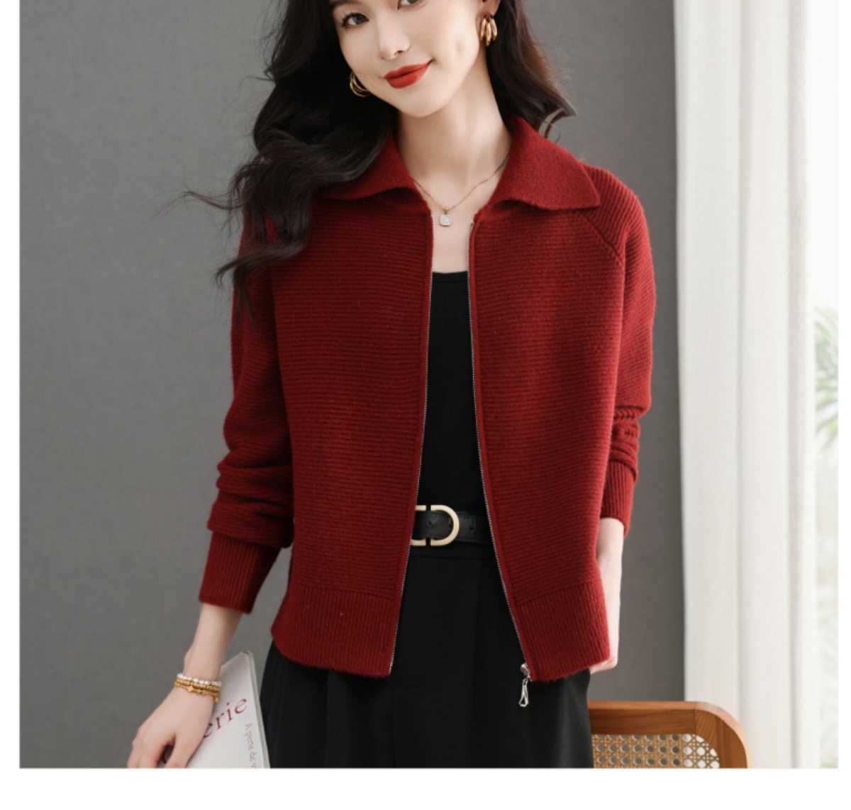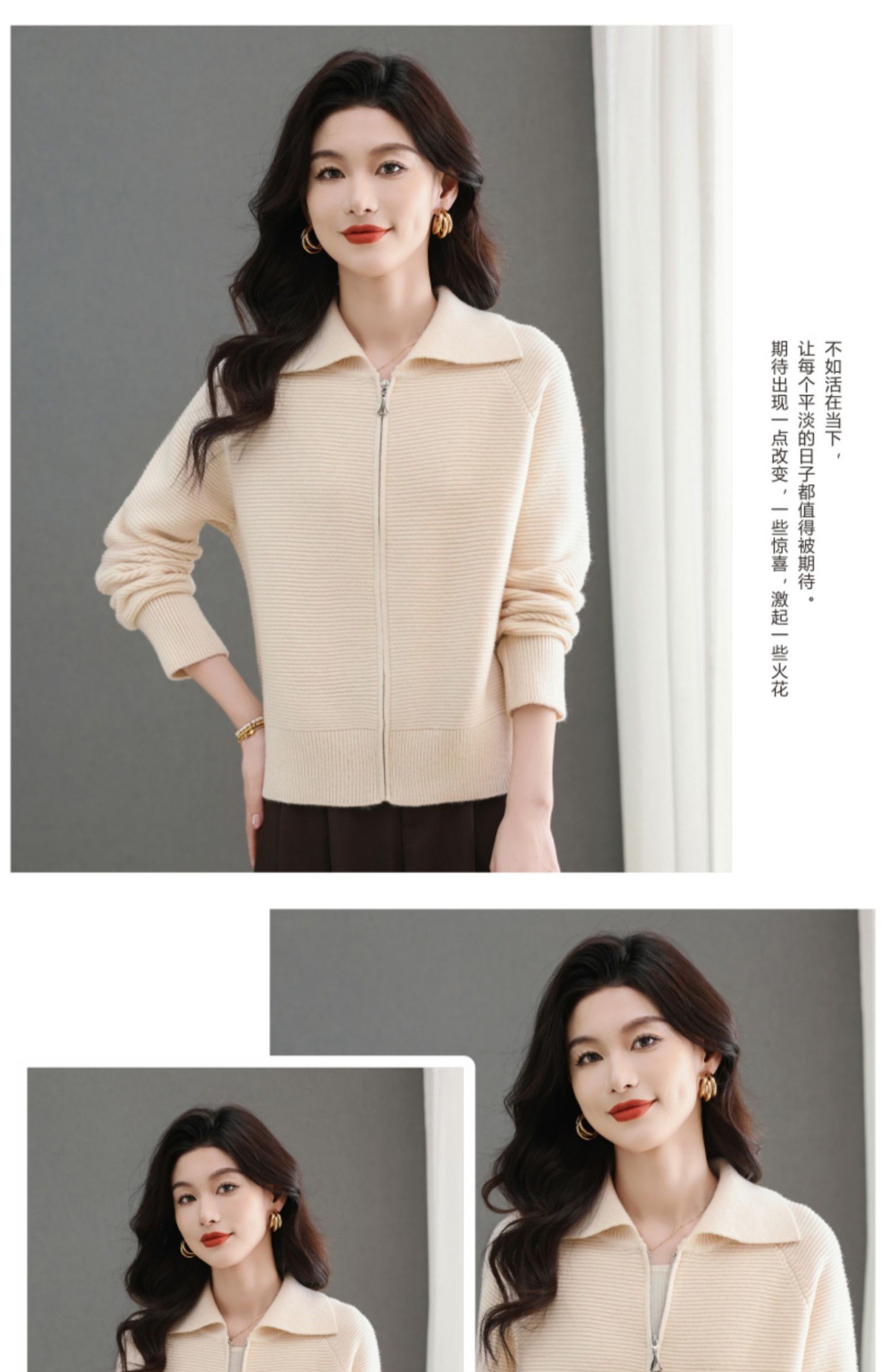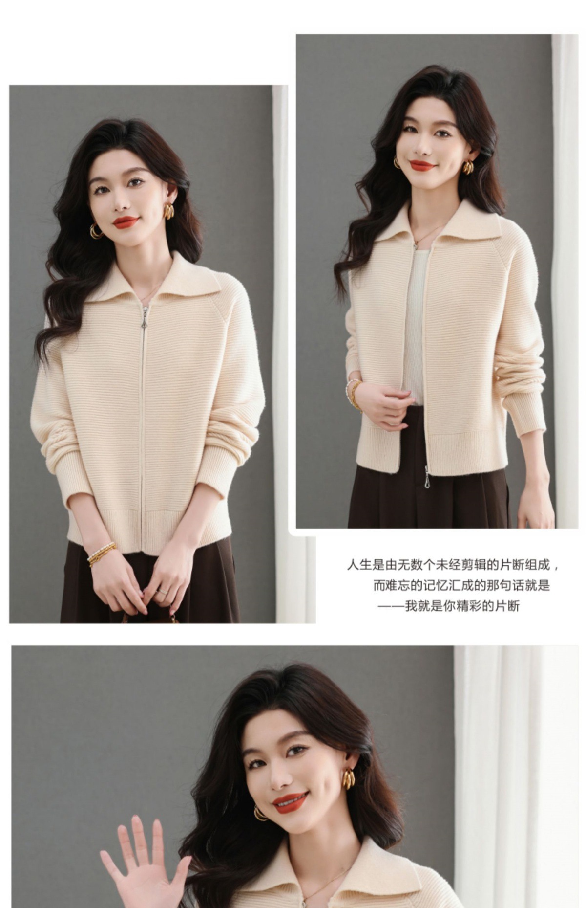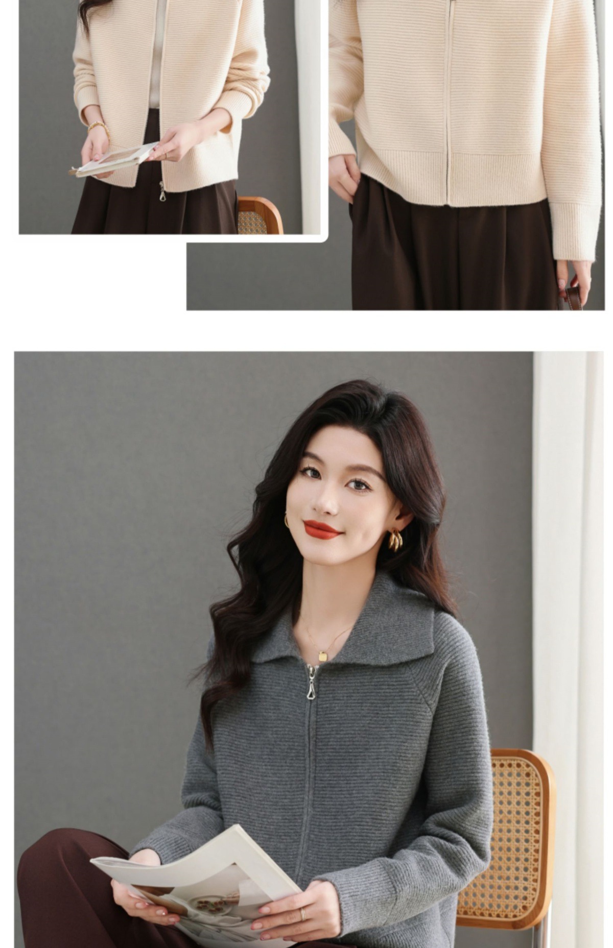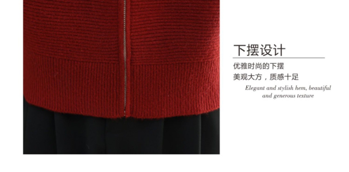 CC-5-6317纯色拉链翻领优雅气质温柔短款针织开衫2025年春秋季新款外套上衣