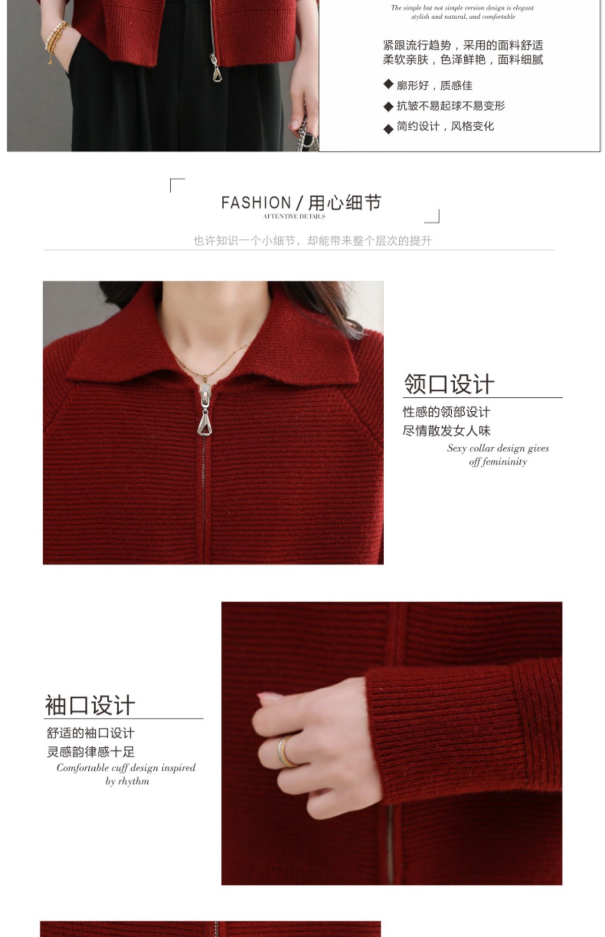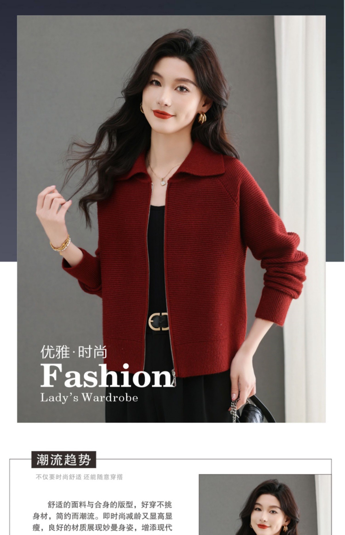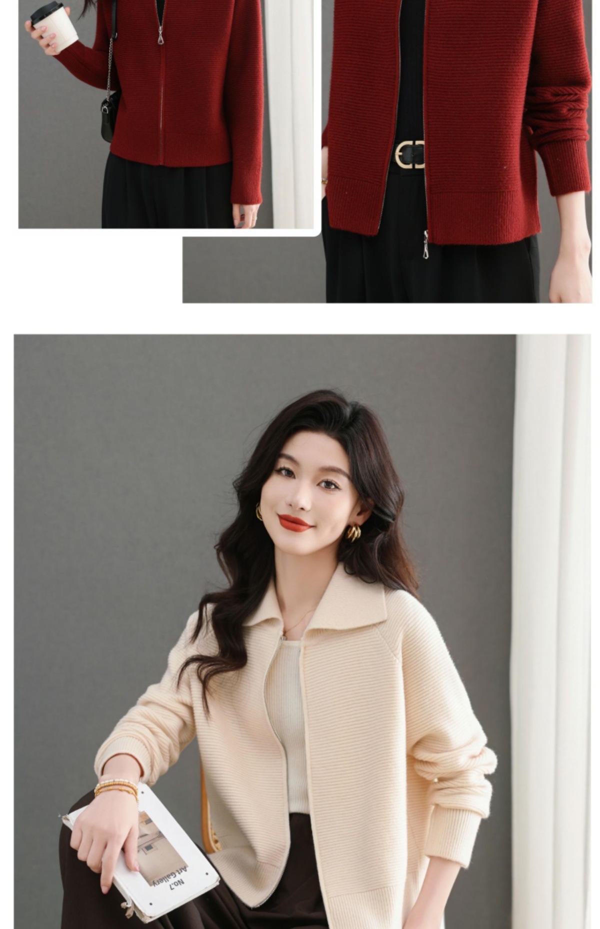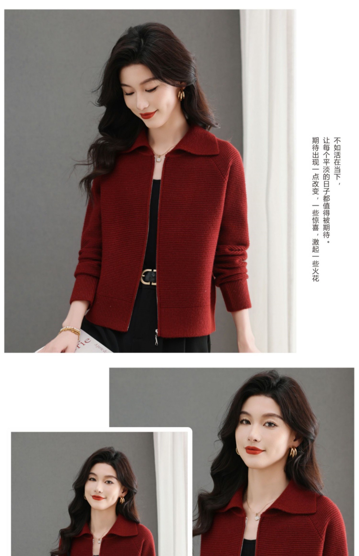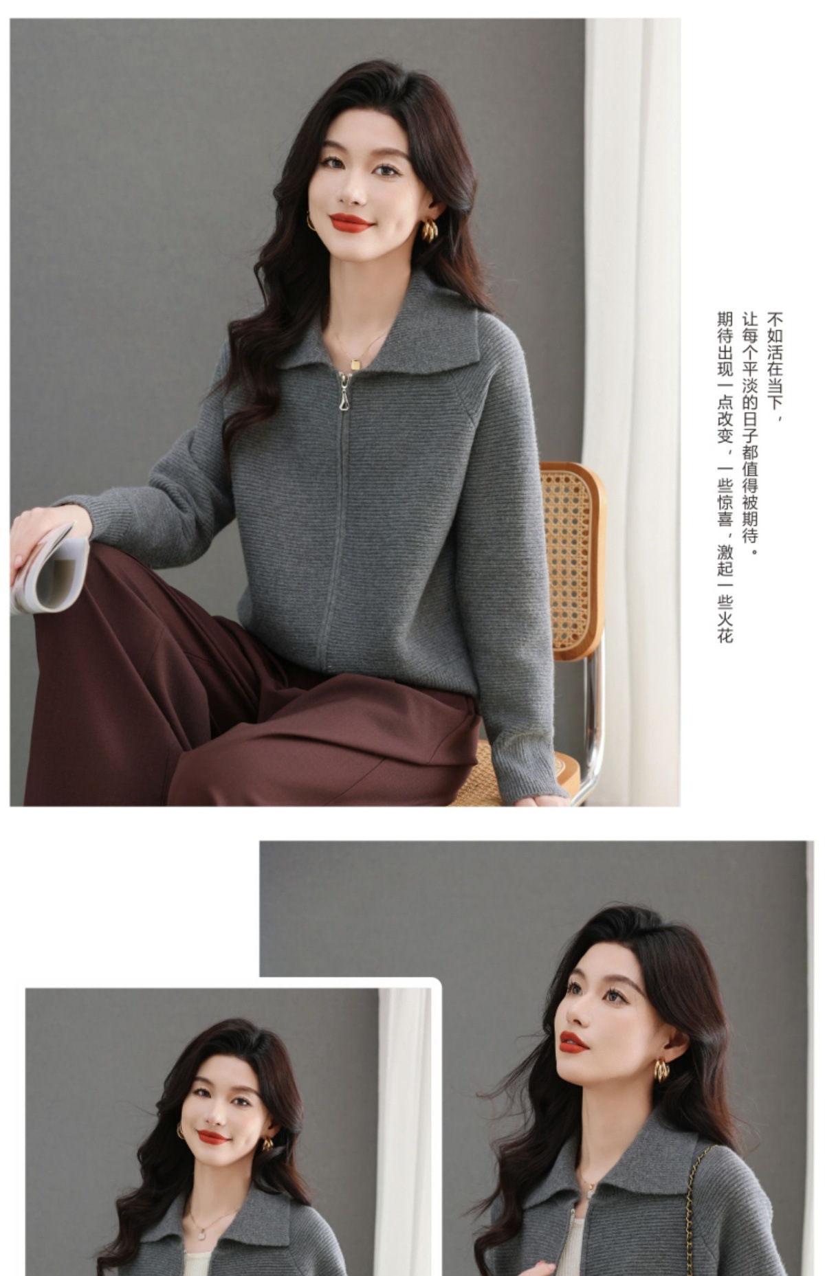 CC-5-6317纯色拉链翻领优雅气质温柔短款针织开衫2025年春秋季新款外套上衣