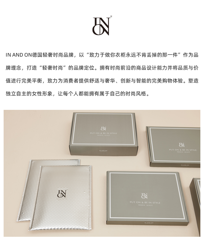 - IN AND ON—轻奢时尚品牌,以“致力于做你衣柜永远不肯丢掉的那一件”作为品牌理念,打造“轻奢时尚”的品牌定位。拥有时尚前沿的商品设计能力并将品质与价值进行完美平衡,致力为消费者提供舒适与奢华、创新与智能的完美购物体验。塑造独立自主的女性形象,让每个人都能拥有属于自己的时尚风格。