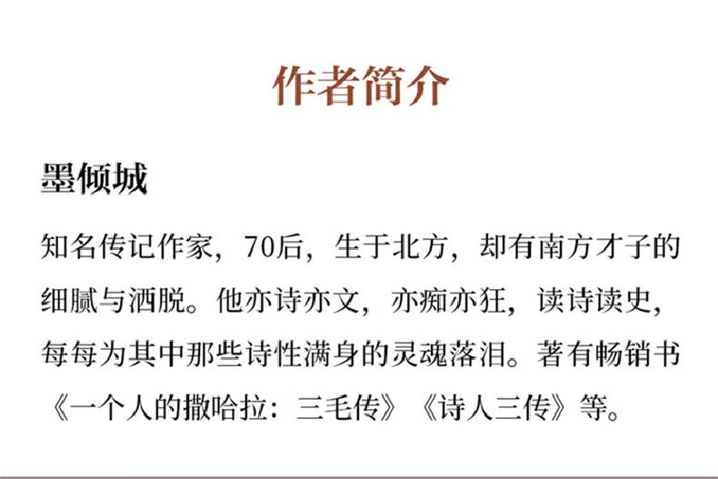墨倾城:知名传记作家,70后,生于北方,却有南方才子的细腻与洒脱。他亦诗亦文,亦痴亦狂,读诗读史,每每为其中那些诗性满身的灵魂落泪。著有畅销书《一个人的撒哈拉:三毛传》《诗人三传》等。