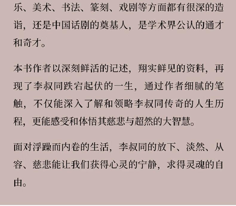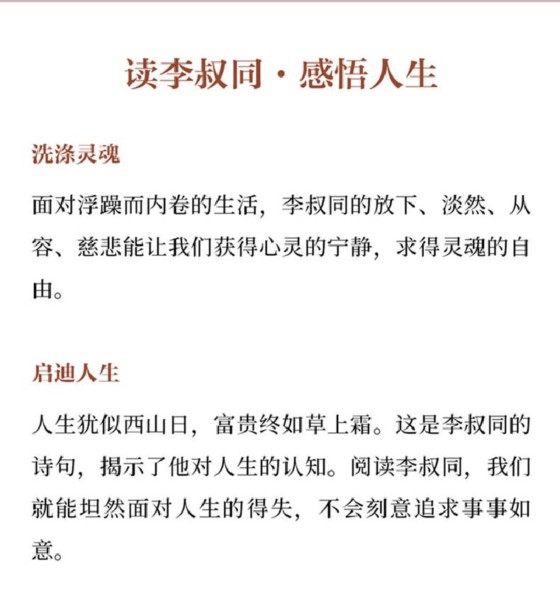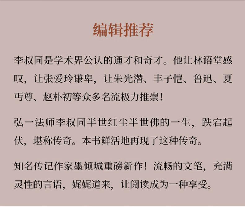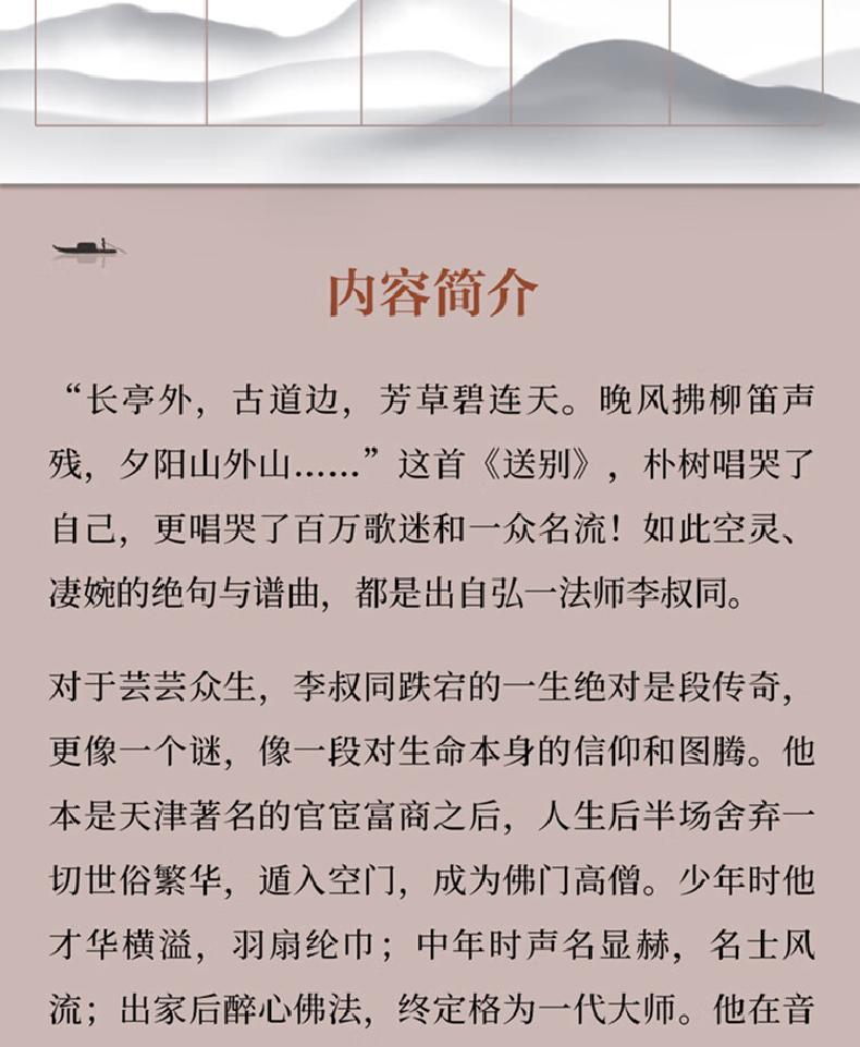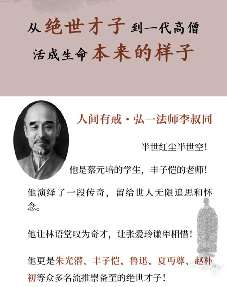 本书作者以深刻鲜活的记述,翔实鲜见的资料,再现了李叔同跌宕起伏的一生,通过作者细腻的笔触,不仅能深入了解和领略李叔同传奇的人生历程,更能感受和体悟其慈悲与超然的大智慧。
