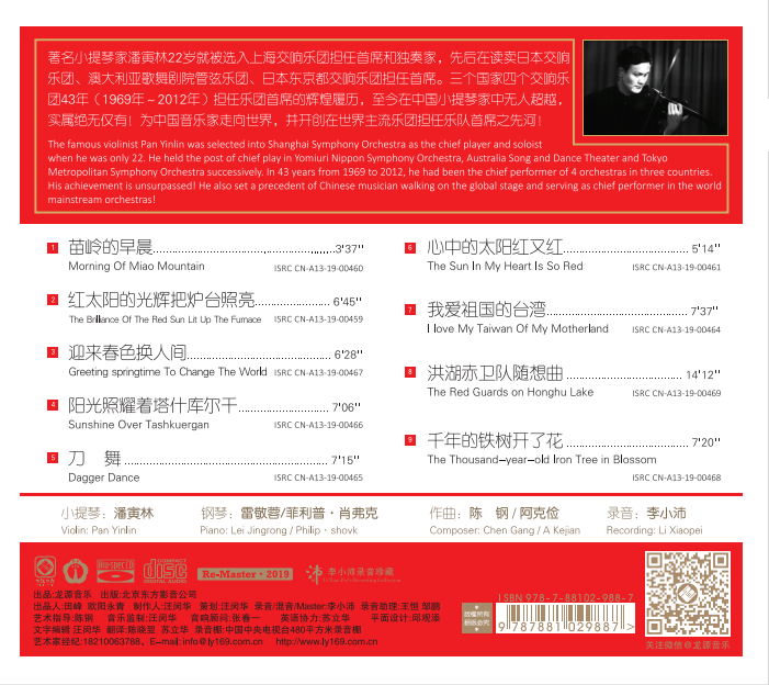 本唱片由著名小提琴家潘寅林倾情演奏,其精湛的演奏技巧与对音乐作品的独到诠释,被说成是“小提琴的代名词”也不为过,他传奇的经历与辉煌的履历,至今无人超越;他的演奏以优美音色所著称,高音明亮富有穿透力,低音浑厚温暖,各个音区衔接流畅,令人无法不沉醉其中。
