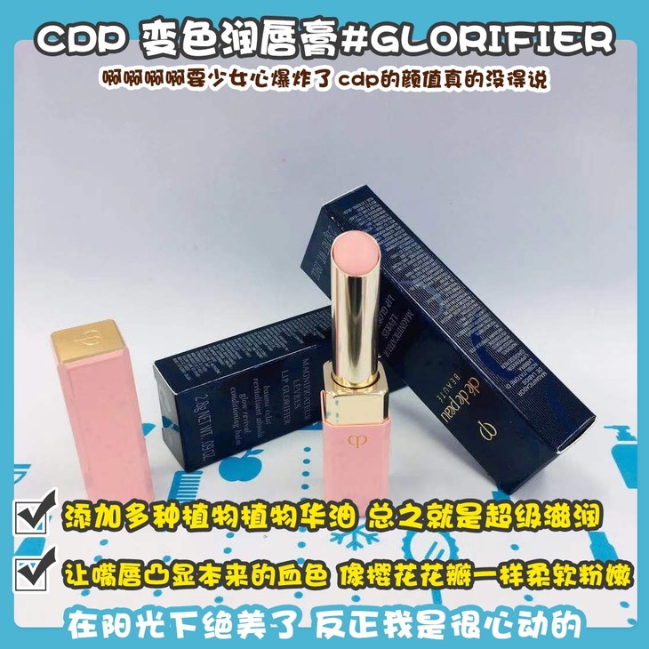 CDP 变色润唇膏#GLORIFIER👍啊啊啊啊要少女心爆炸了😱,cdp的颜值真的没得说💓!添加多种植物植物华油,总之就是超级滋润💦!让嘴唇凸显本来的血色,像樱花花瓣一样柔软粉嫩🌸,遮盖唇纹、调理干燥唇部、上唇有点薄荷的微凉🍃!唇膏外面的金属壳,也不是单纯的粉色,上面有金色的细闪✨,在阳光下绝美了!反正我是很心动的😍...