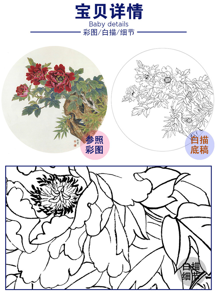 【大彩图】李晓明横幅工笔画白描底稿《群芳谱》牡丹临摹勾线花鸟线稿KA25