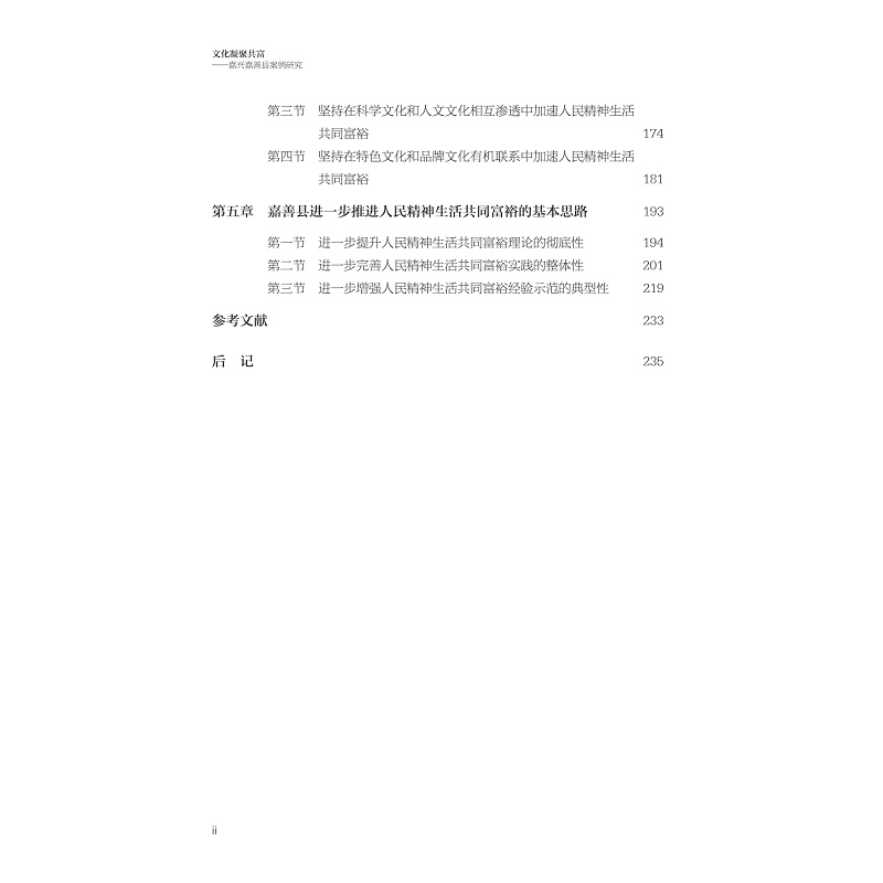 “共同富裕的探索与实践——浙江案例研究”丛书之一。本书阐述和分析了嘉善共同富裕的精神富有探索与实践的历史进程及其基本特点、丰硕成果及其形成原因、基本经验及其重要启示、推进思路及其未来空间。本书重点描绘了满城荡漾善文化、千年嘉扬善精神、共富之路善为魂的嘉善独特文化景象,总结了嘉善坚持在共同富裕实践中精神富有适度超前引领、在精神共富探索中突出善文化地域品牌、在精神文化建设中全面把握科学体系结构的主要方略,嘉善在精神共同富裕示范中仍在继续勇立潮头跃升境界。
