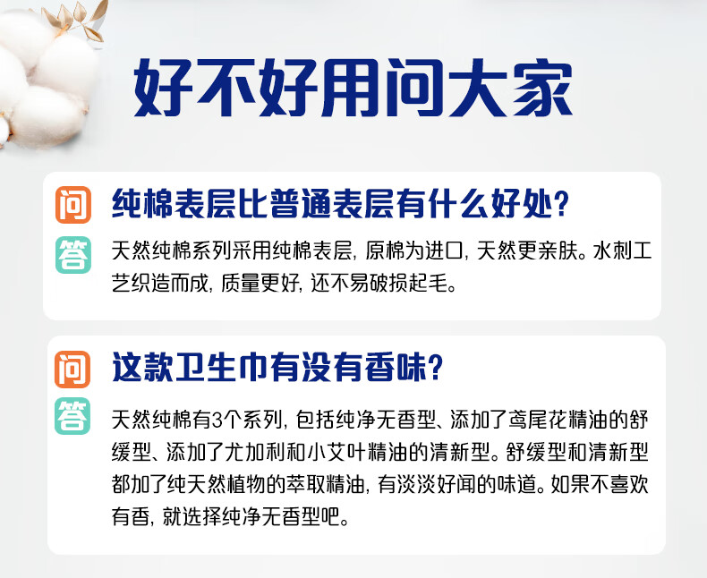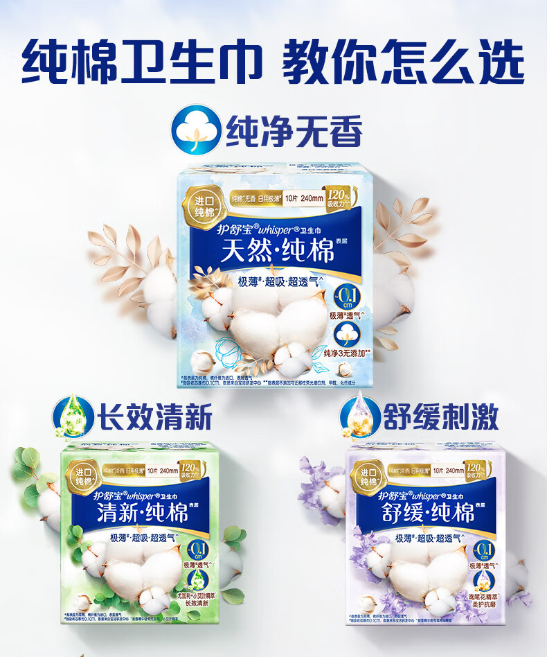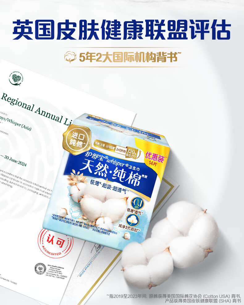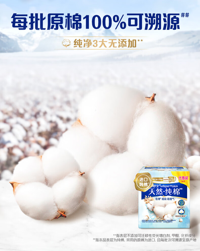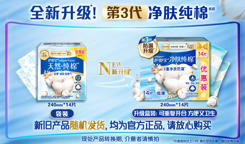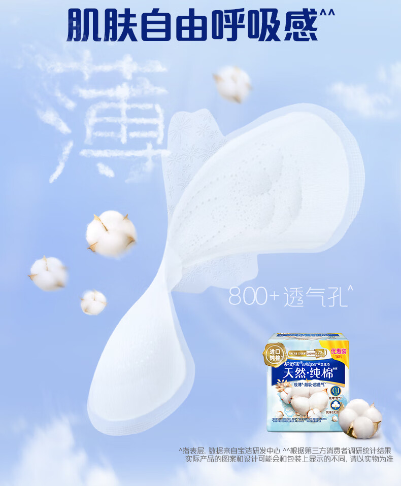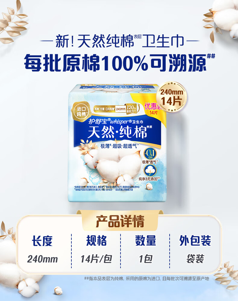 护舒宝净肤纯棉卫生巾日用240mm14片姨妈巾极薄透气
