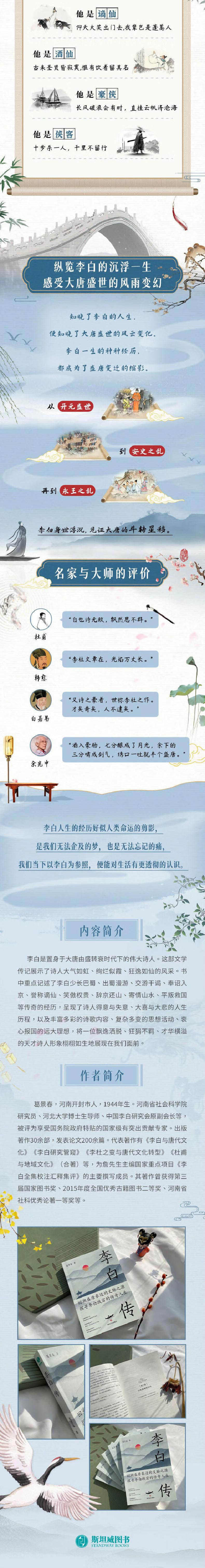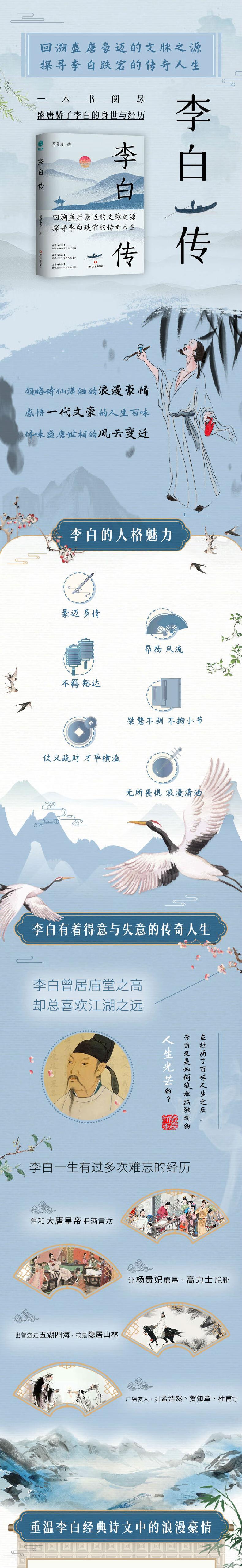 知晓了李白的人生,便知晓了大唐的世相变迁。李白生逢大唐盛世,却在晚年遭遇安史之乱。与李白同时代的众多历史人物,如唐玄宗、杨贵妃、高力士、贺知章、杜甫等,都影响着李白的人生轨迹。李白一生的种种经历,都成为了盛唐变迁的缩影,他笔下的诗文,亦都见证了盛唐的斗转星移。