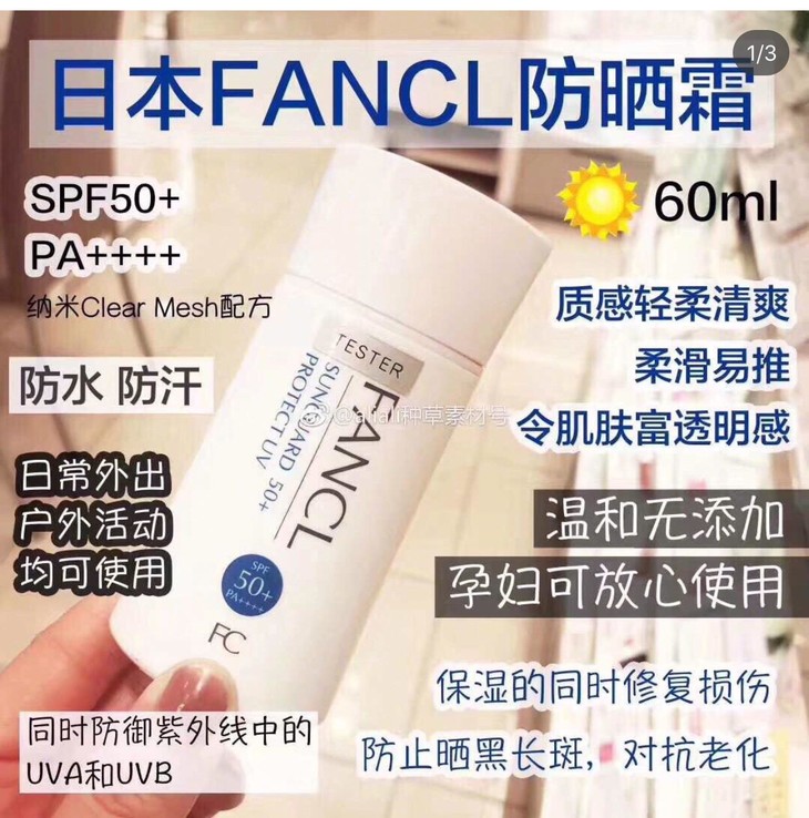 👑FANCL无添加物理防晒霜60ml 🍇SPF50+~PA++++,孕妇可用的防晒,全面隔绝紫外线 💓采用:纳米技术的物理性防晒,同时:抑制光老化以及油脂氧化,全面抗老抗黄。 ㊙️配合清爽配方,不油腻,可放心涂于眼部周围的幼嫩肌肤 👀为肌肤补湿的同时兼具修护功能 💦防水防汗,适合上街或进行户外活动时使用!