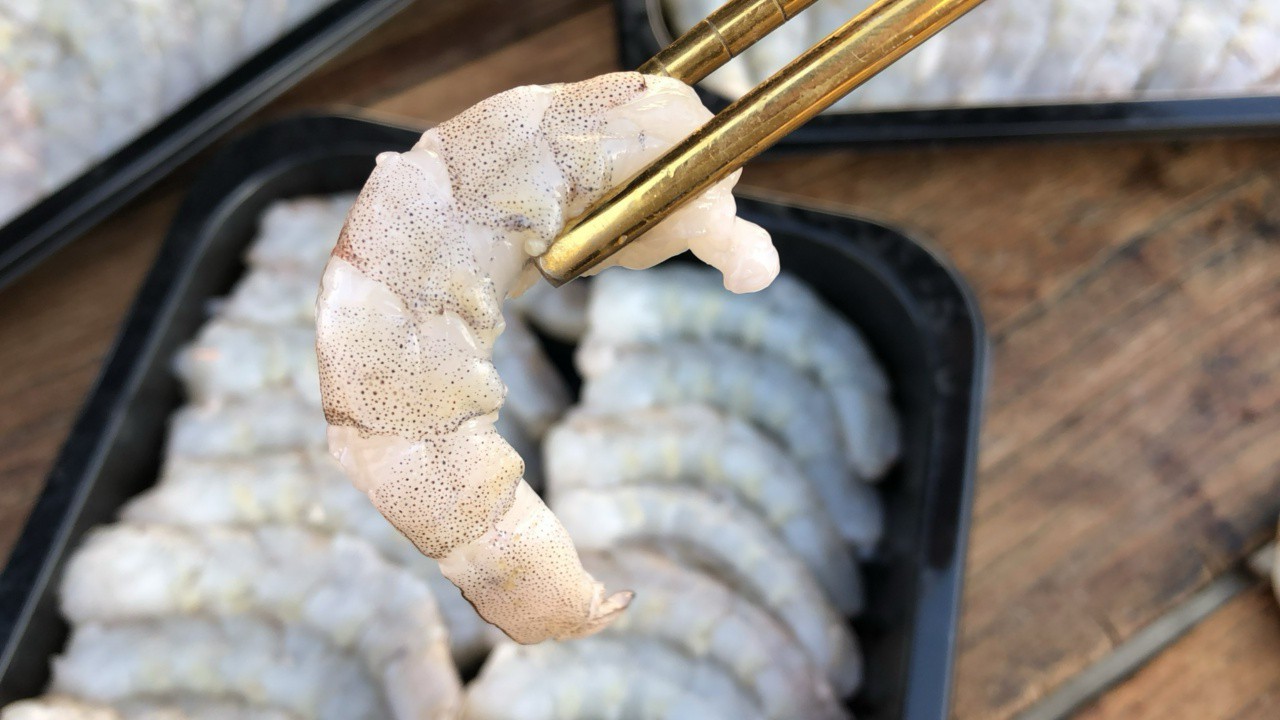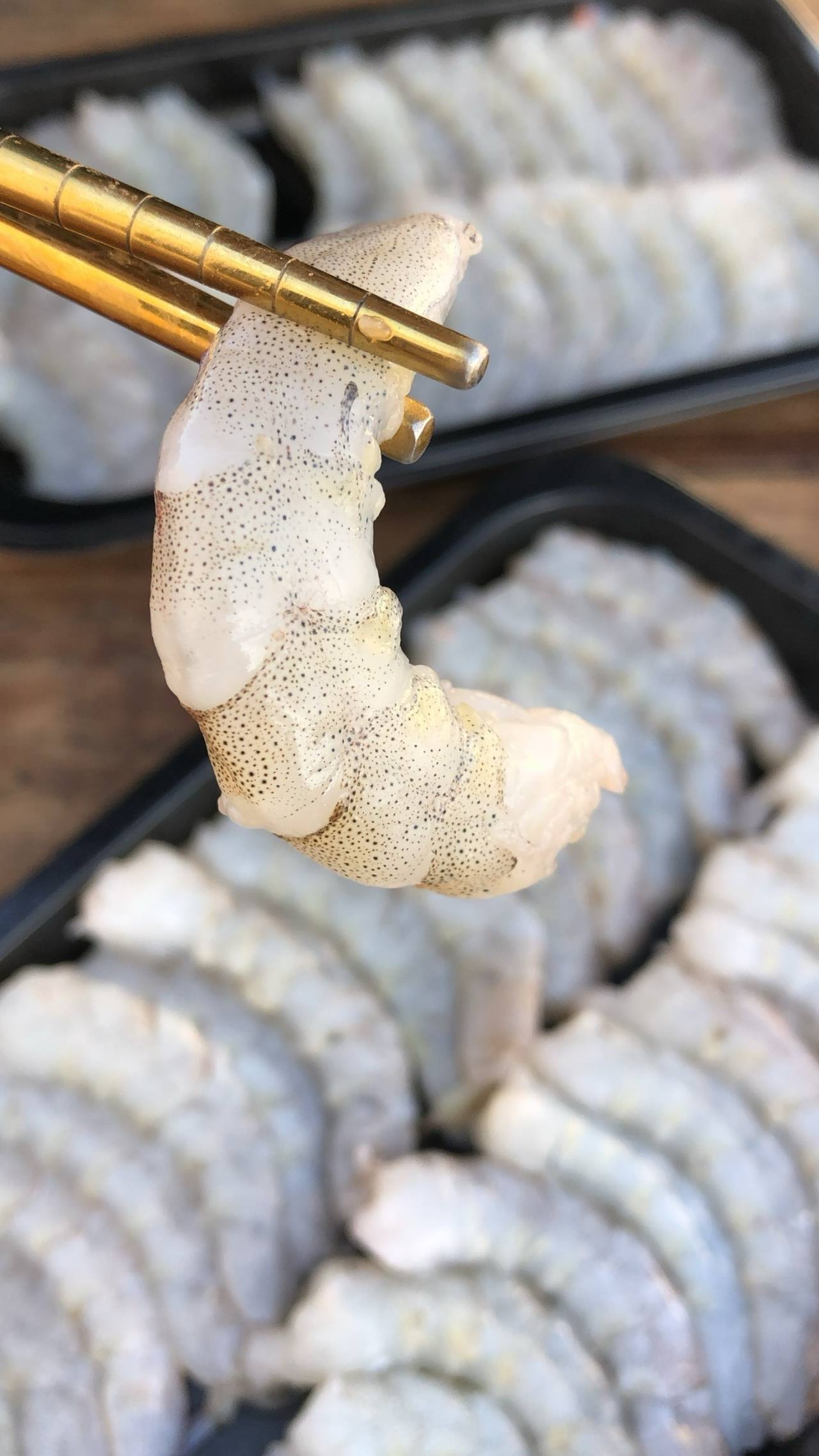 这是我们的原浆虾仁,因为每只虾的虾青素与氧气氧化的程度不同,所以虾膜的纹理颜色不同,一只虾一个纹理,一只虾一个颜色! 保水后漂白会让虾仁的颜色统一!