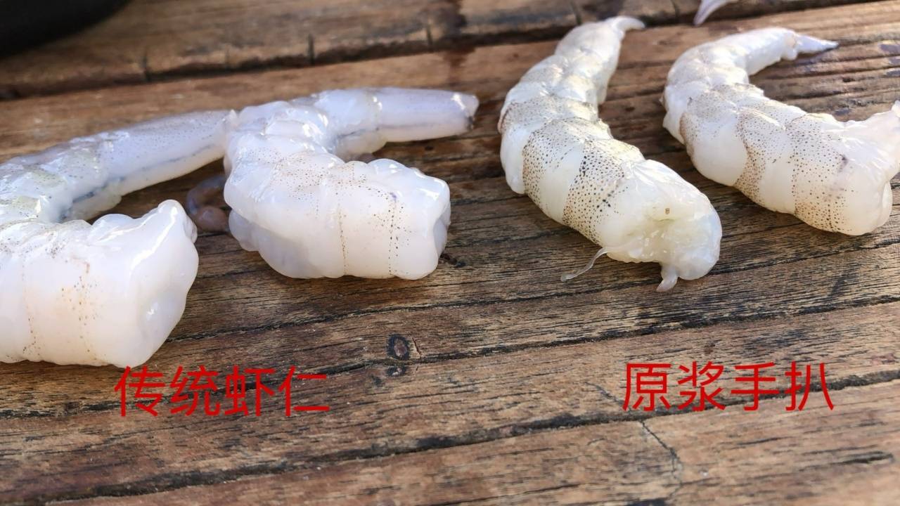 传统的虾仁和原浆手扒虾仁 ,放在一起对比很明显,那个保水那个没有保水一目了然!