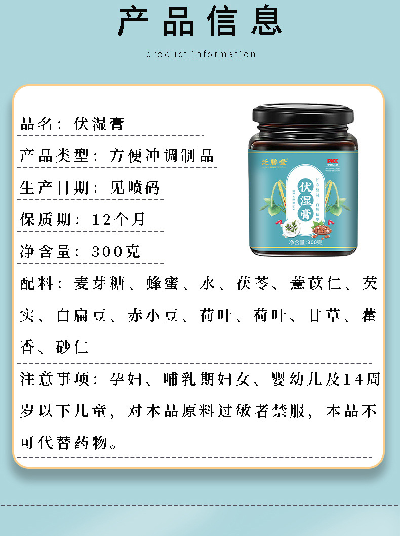配料:麦芽糖、蜂蜜、水、茯苓、薏苡仁、芡实、白扁豆、赤小豆、荷叶、荷叶、甘草、藿香、砂仁