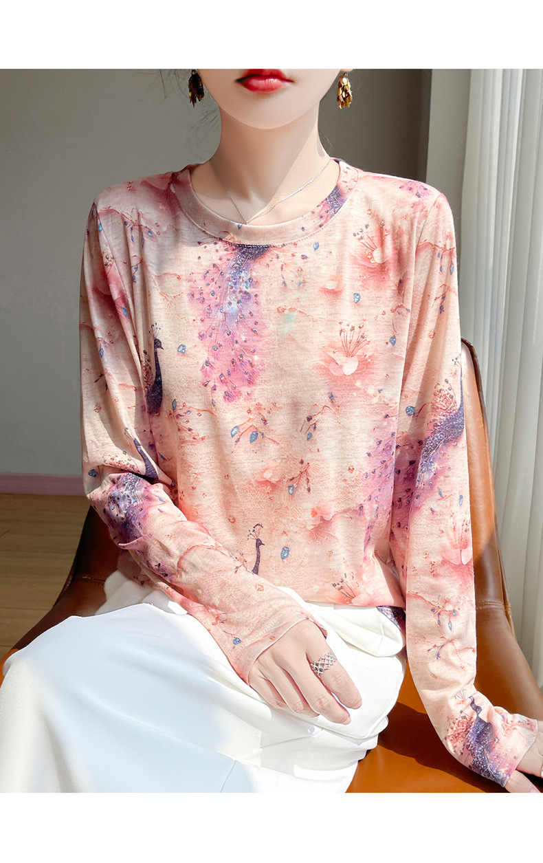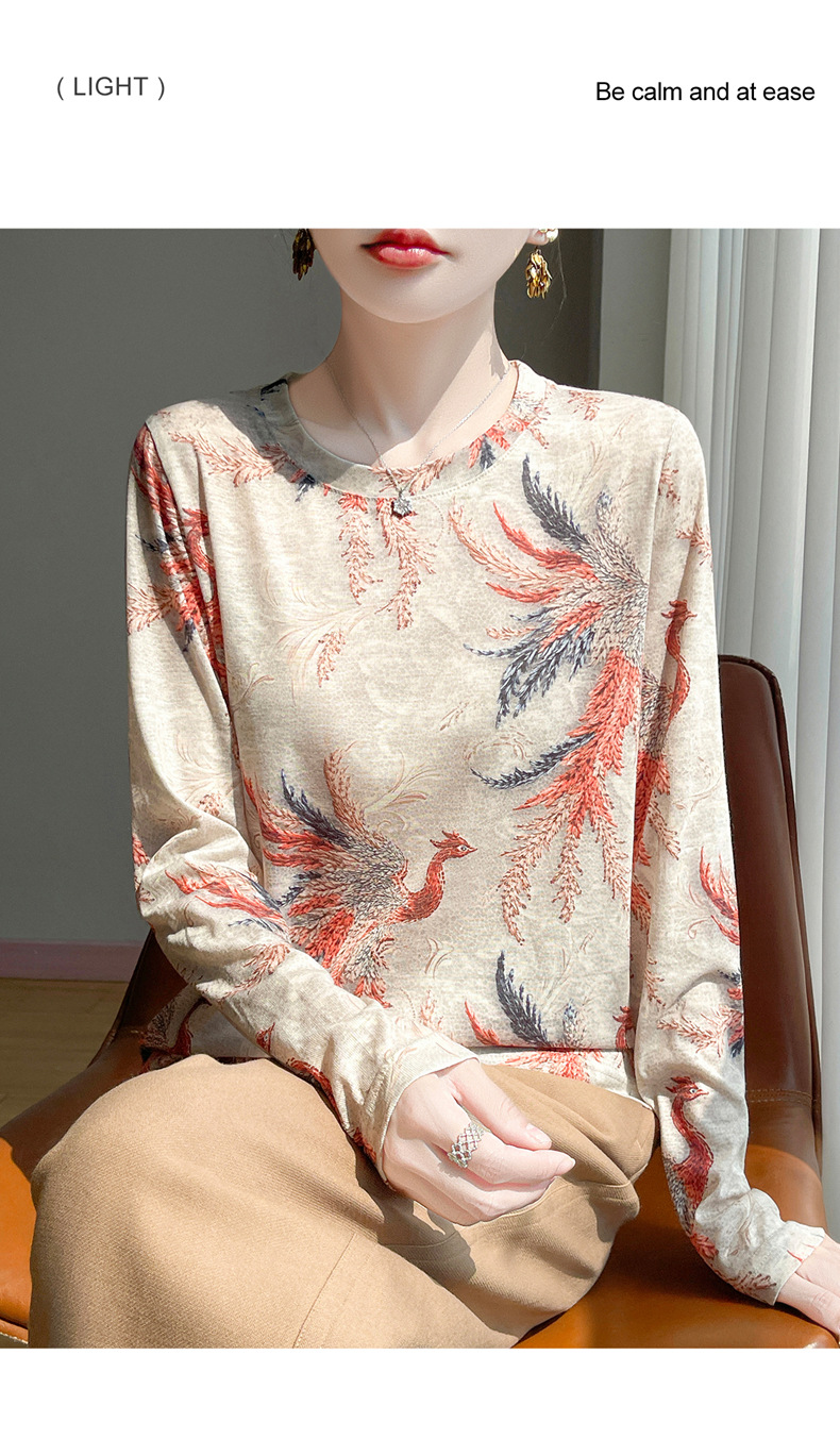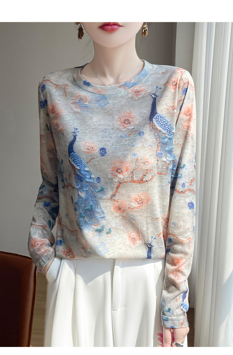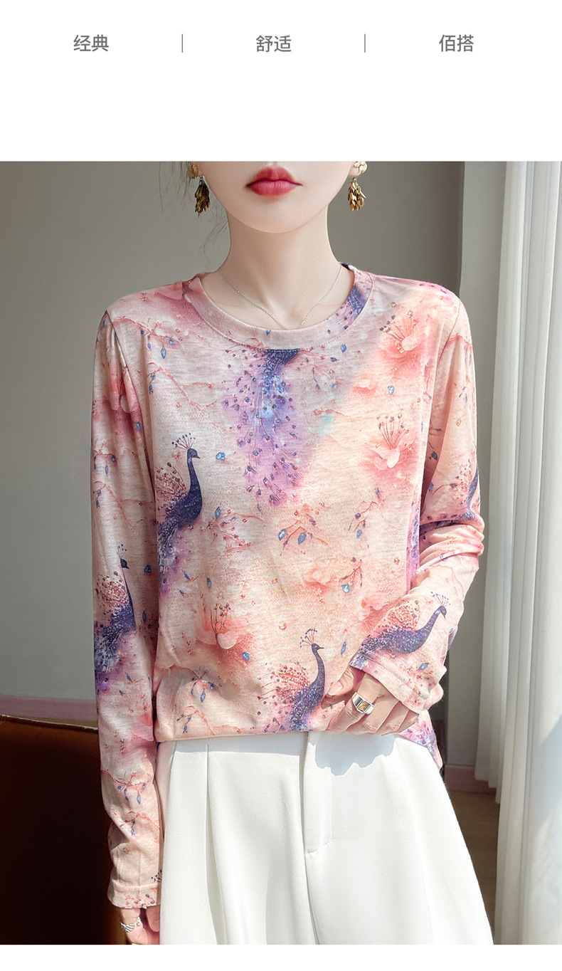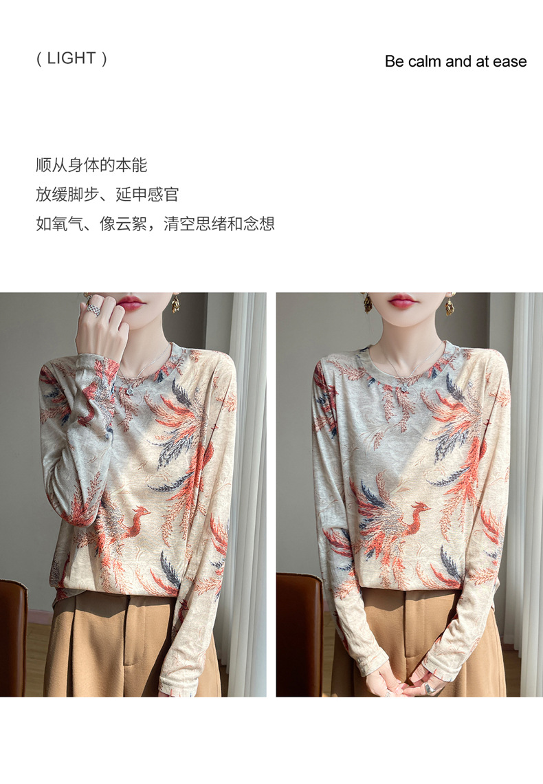 百媚生 早春新款圆领印花长袖T恤国风打底薄上衣R-M140