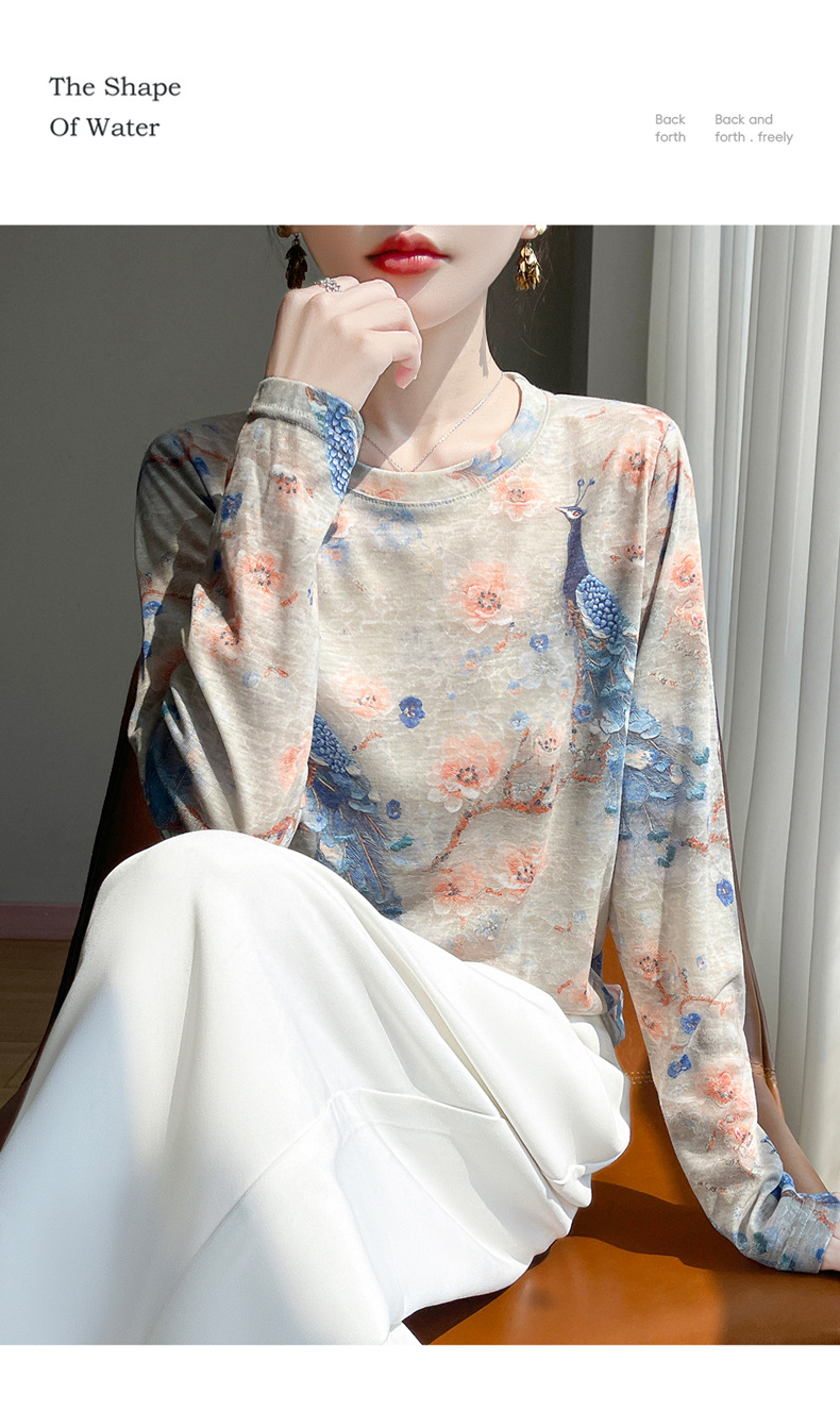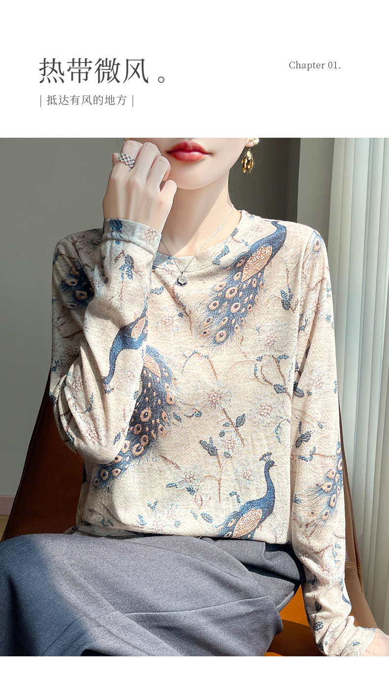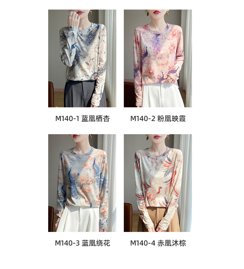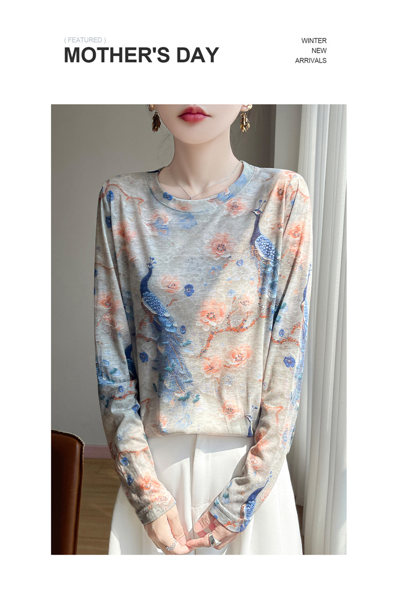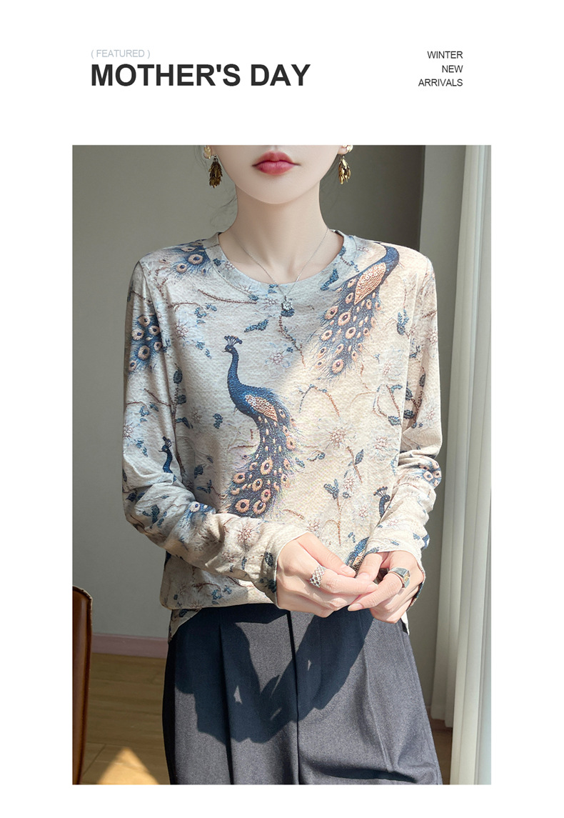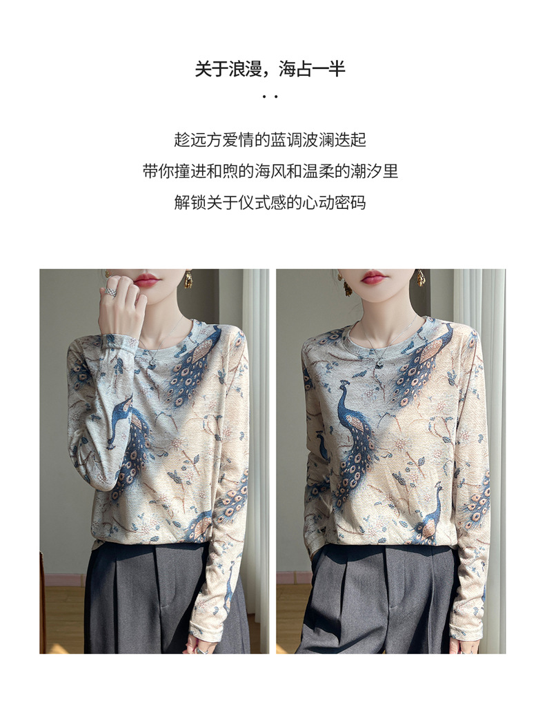 百媚生 早春新款圆领印花长袖T恤国风打底薄上衣R-M140