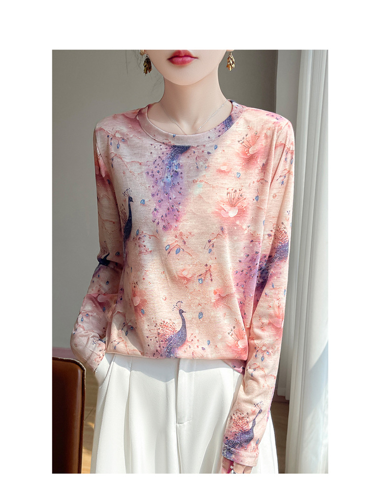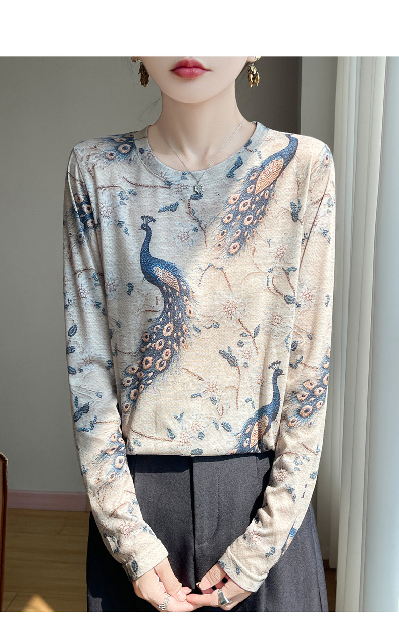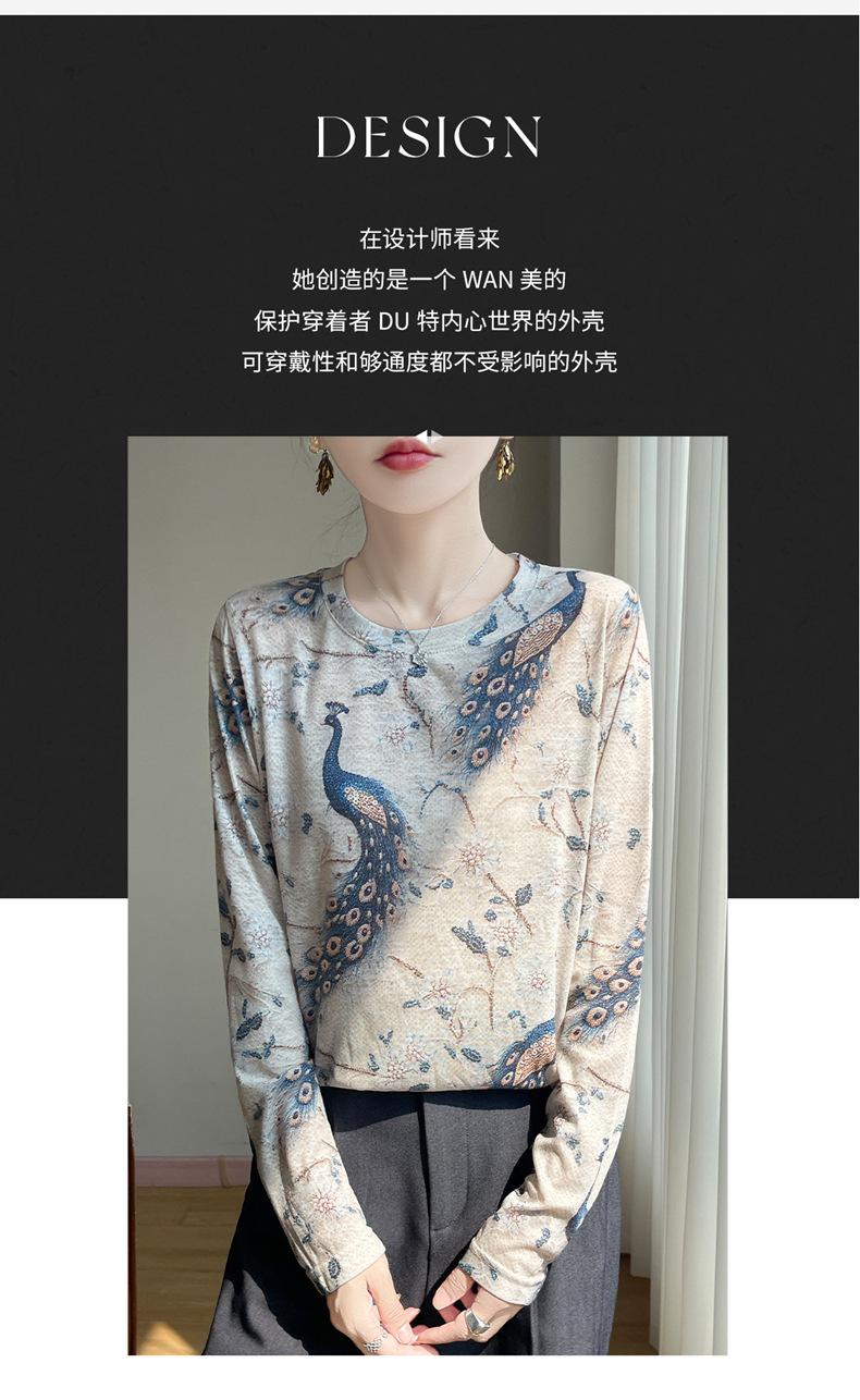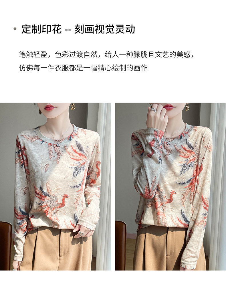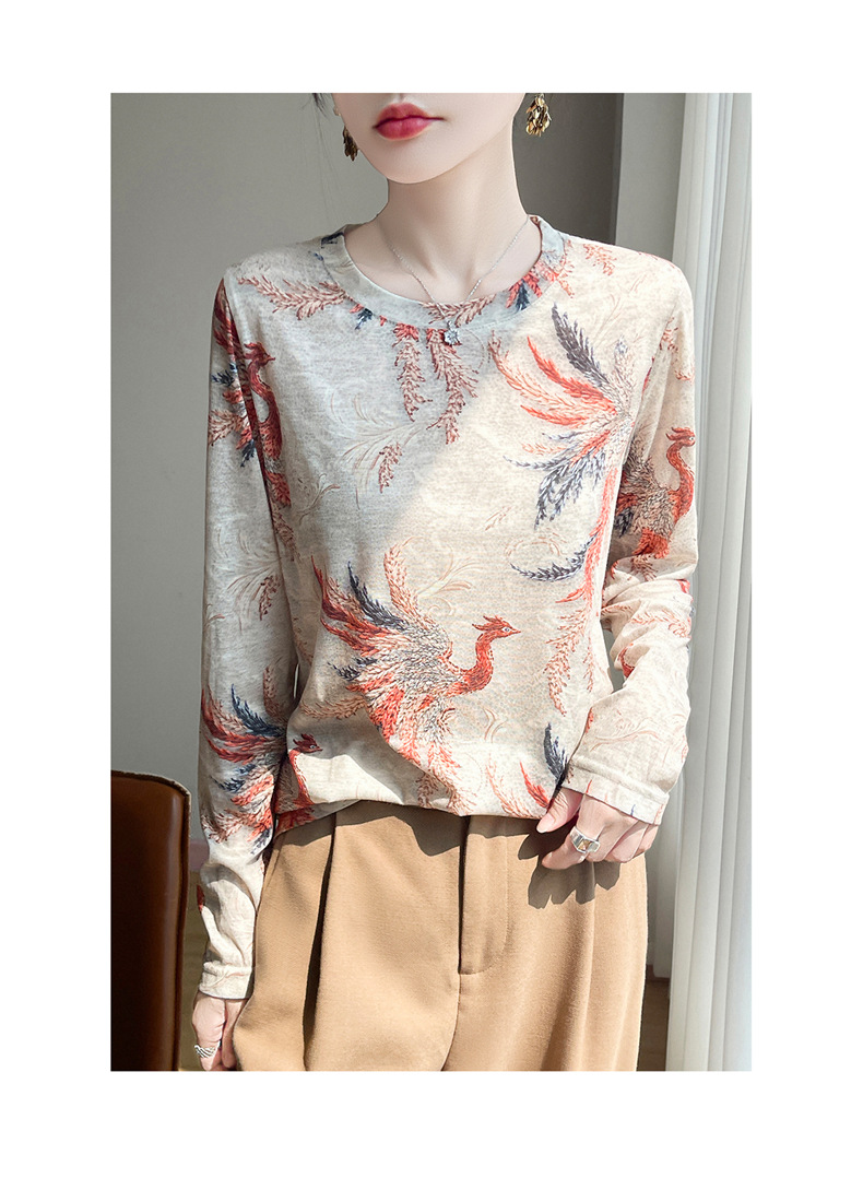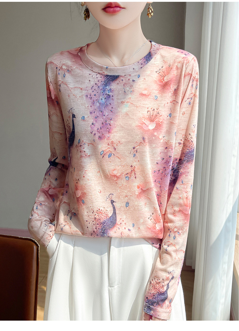 百媚生 早春新款圆领印花长袖T恤国风打底薄上衣R-M140