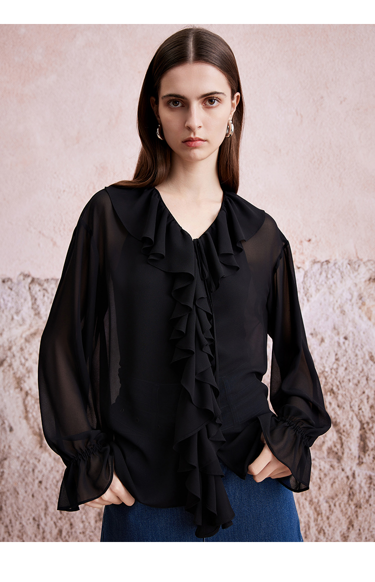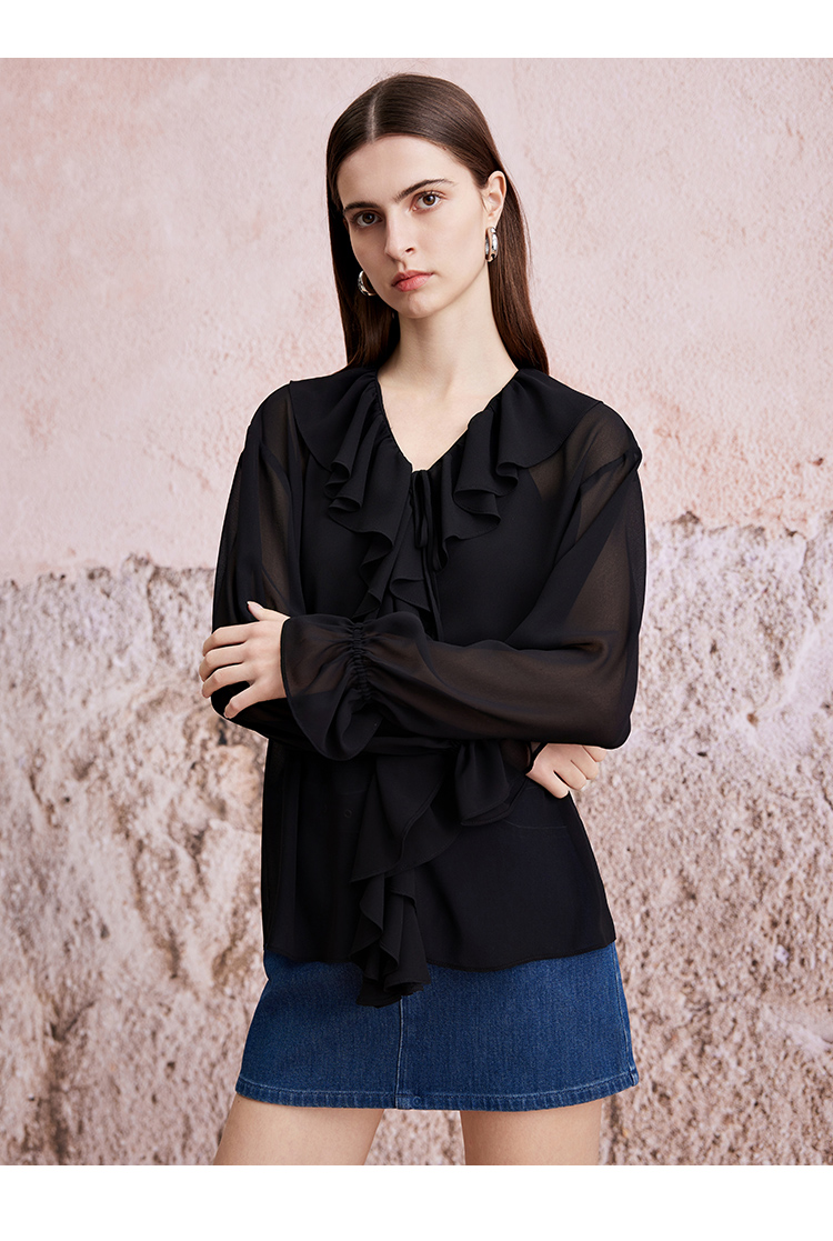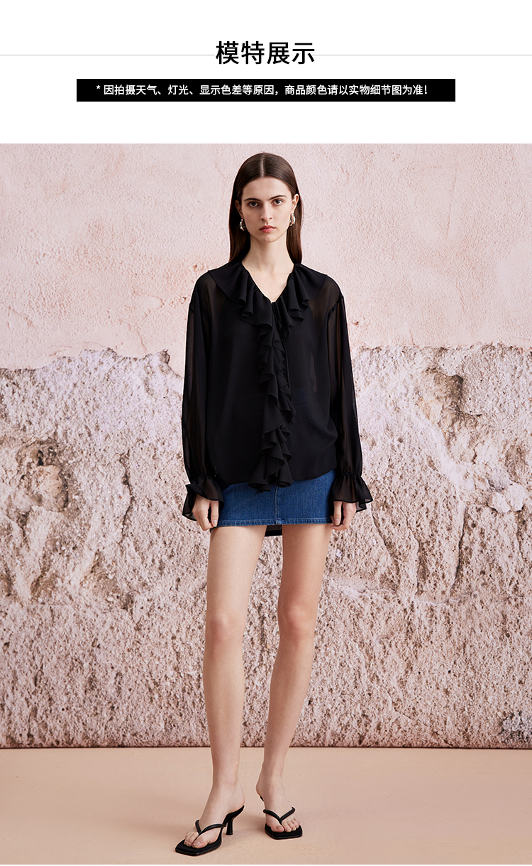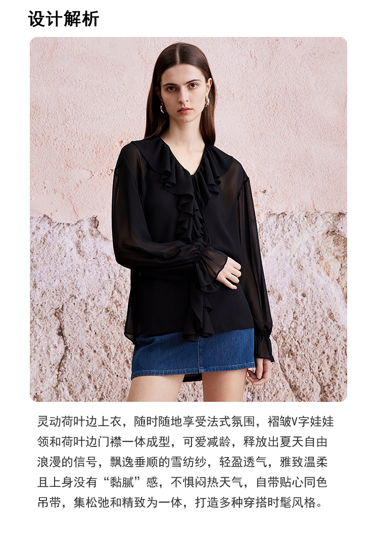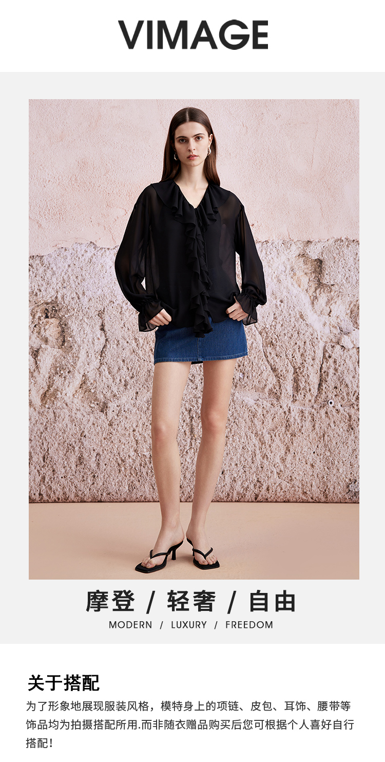 VIMAGE纬漫纪时尚荷叶边黑色网纱防晒两件套雪纺衫上衣夏新款V2113736