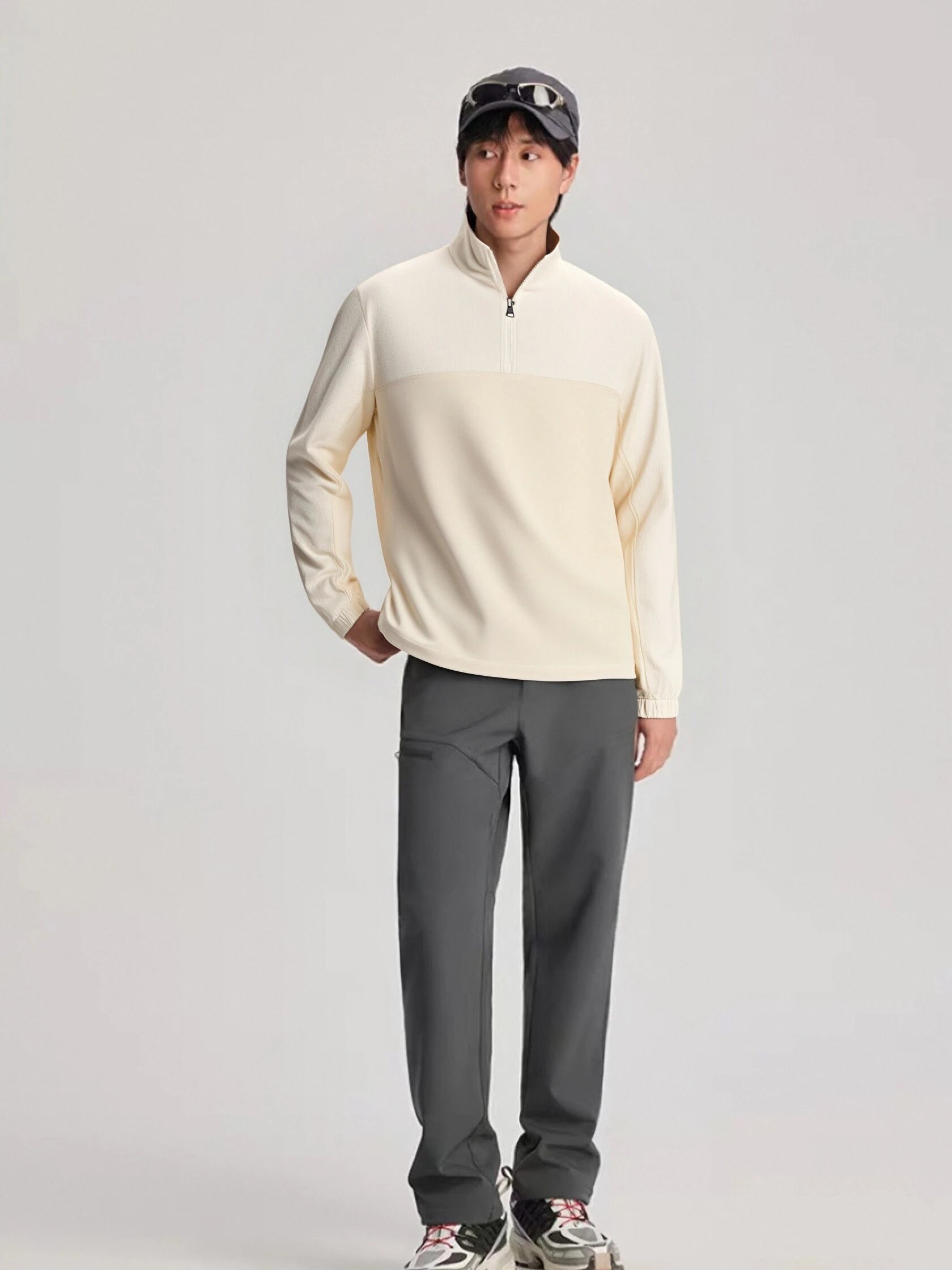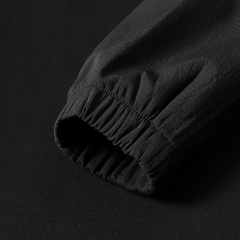 胸前袖子的撞色拼接也打薄了单调的穿搭,有点轻户外风格的感觉,独具自由感
