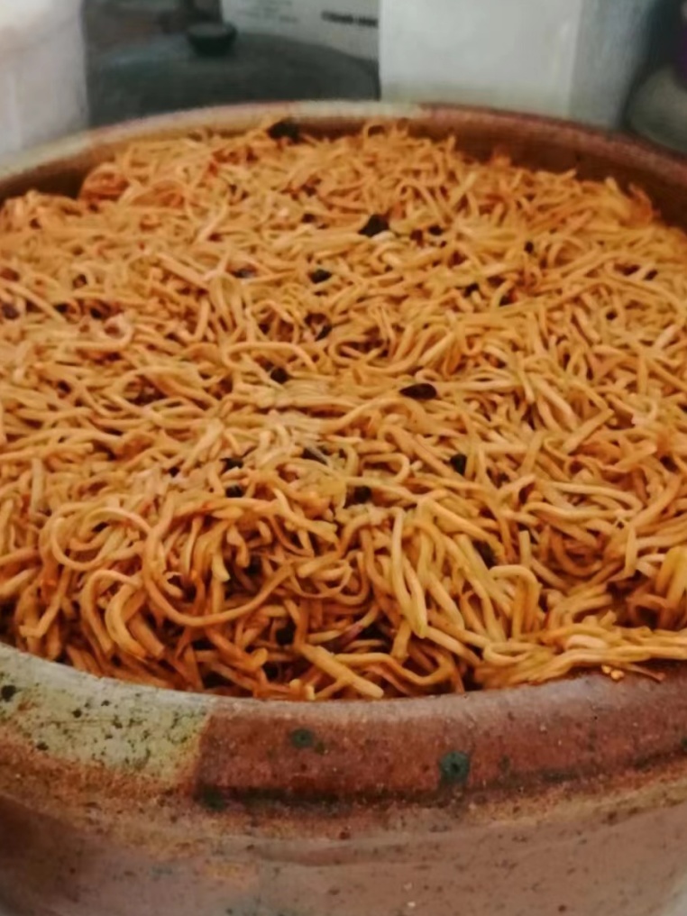 芥菜是崔师兄自家种植的老品种芥菜疙瘩,新鲜芥菜削皮后,人工切丝,晾晒数天到半干状态。然后调制腌芥菜用到的汤汁,分别将酱油、醋、白糖、菜籽油、八角、花椒、辣椒煮水化开,熬制一段时间,待放凉后加入到芥菜丝中,搅拌均匀。最后放置在陶缸中,腌制7天左右。