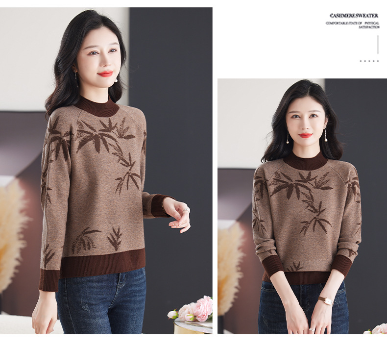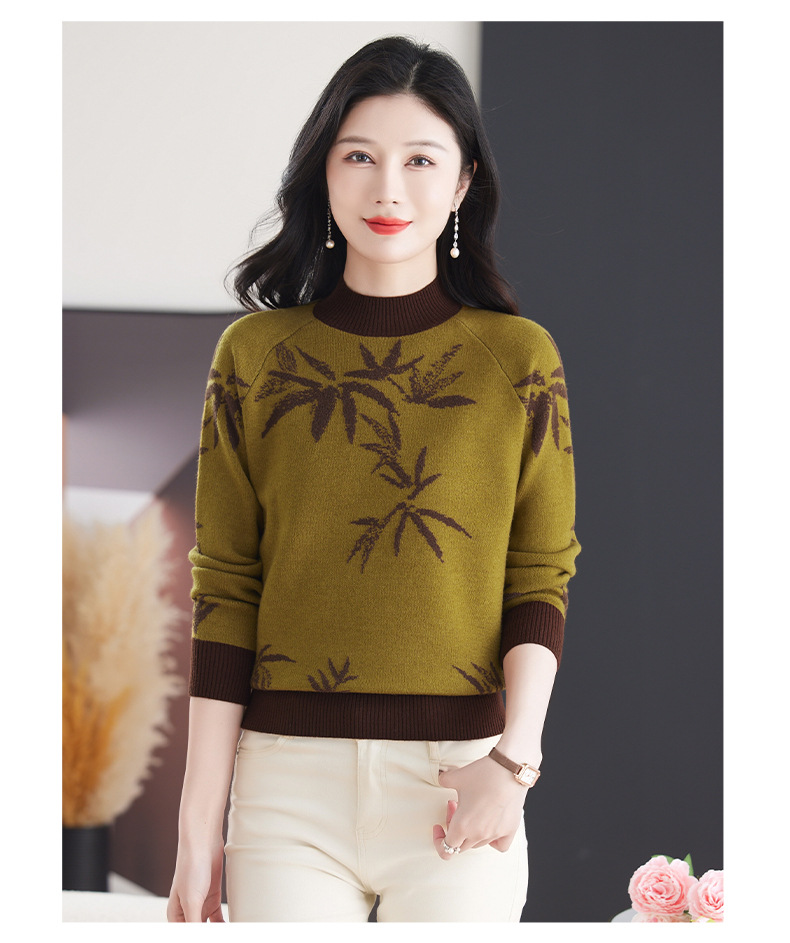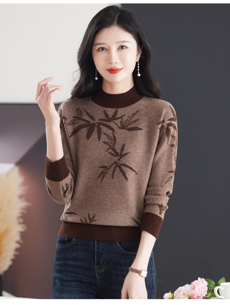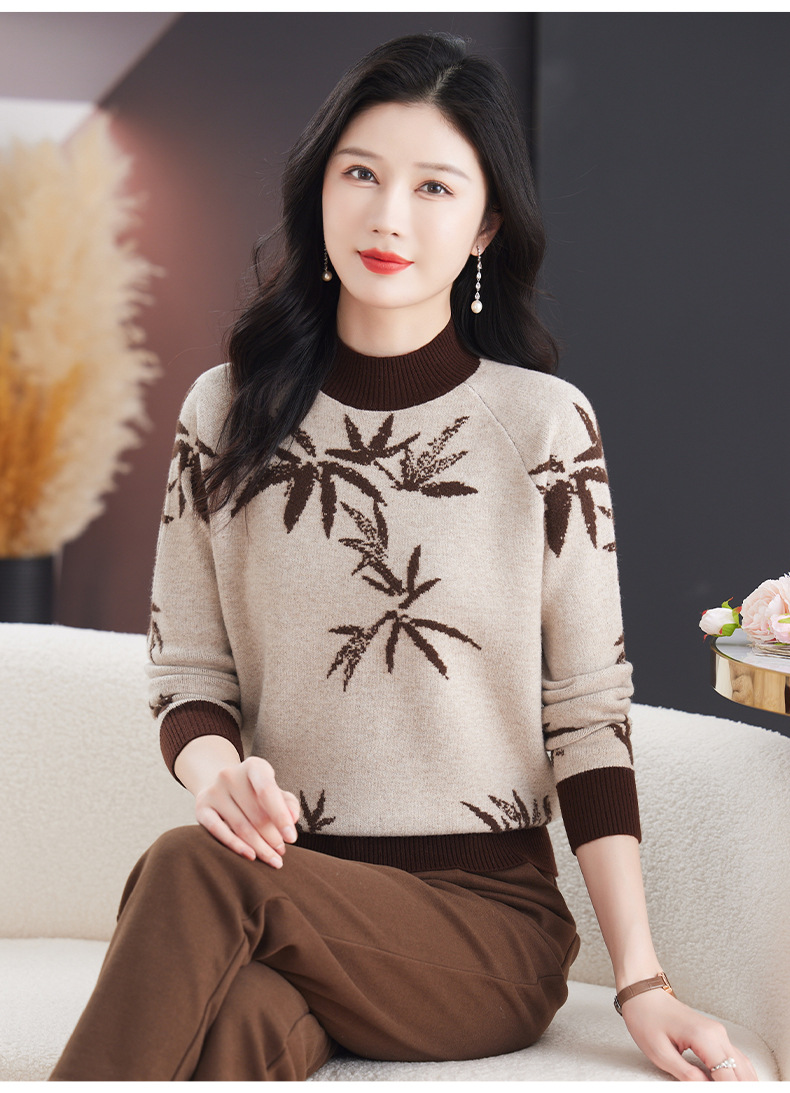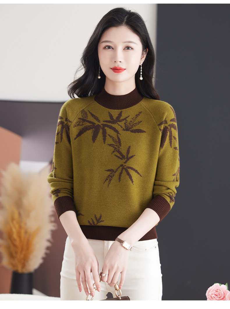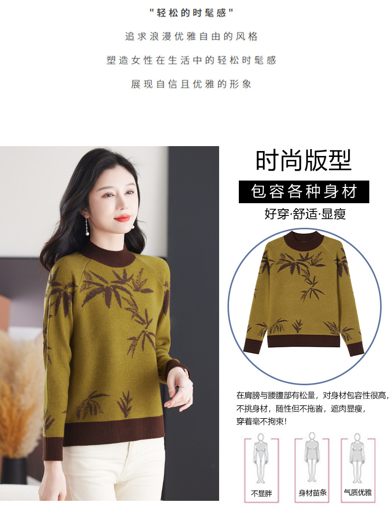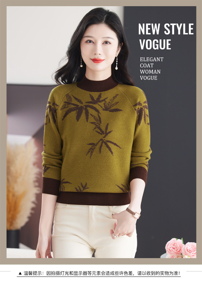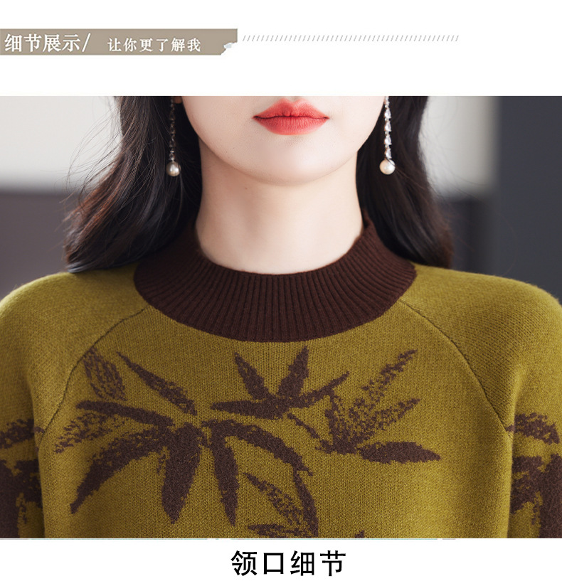 CC-103-7931新款时尚复古提花针织衫毛衣女士宽松厚款半高领百搭减龄上衣