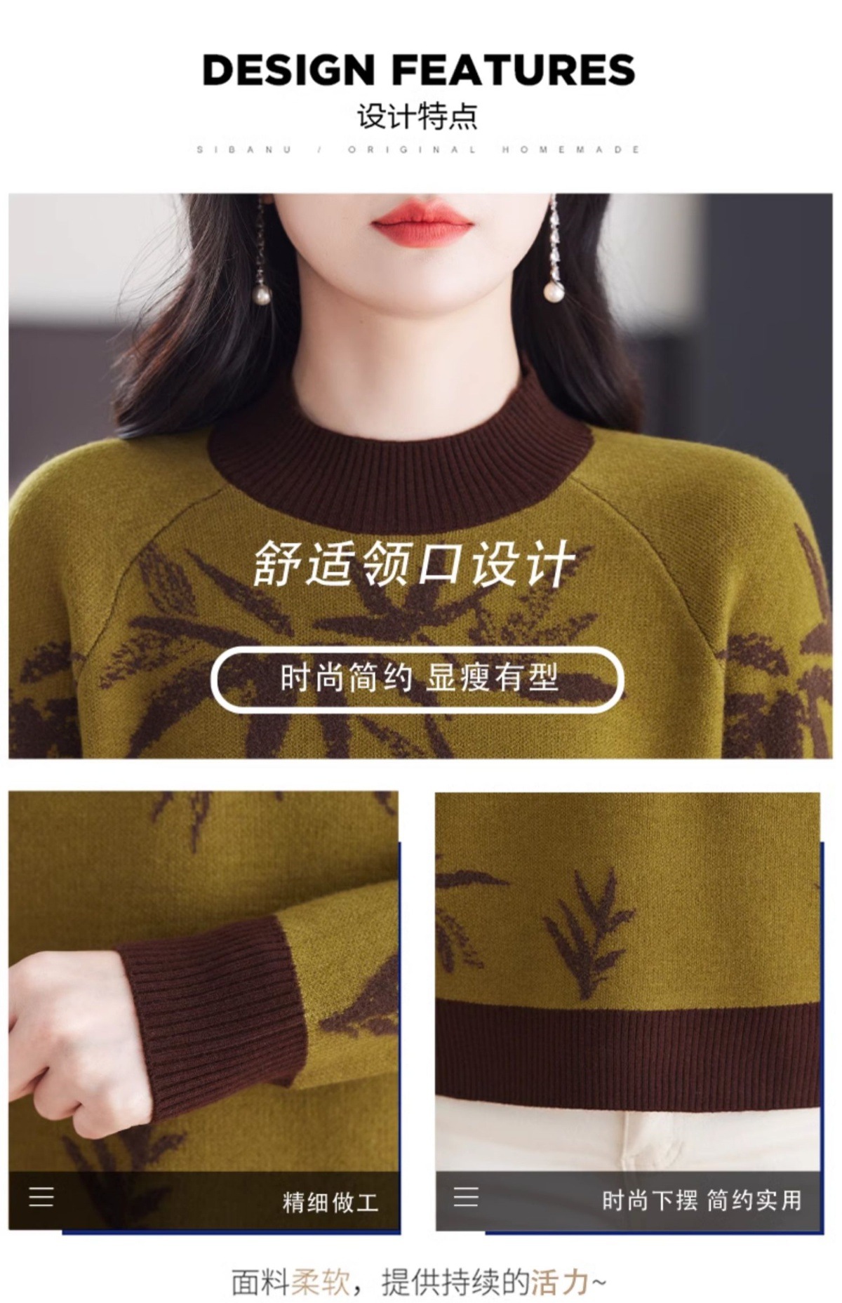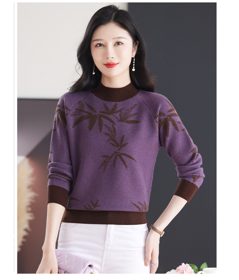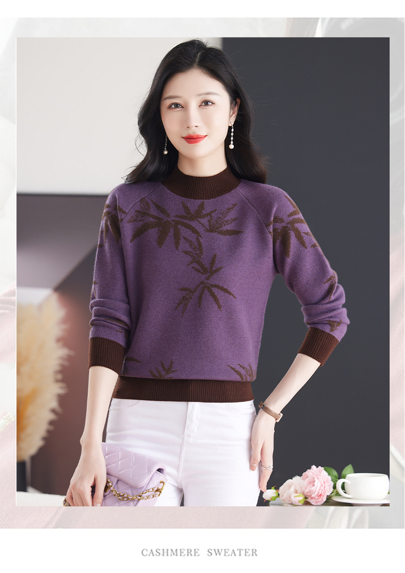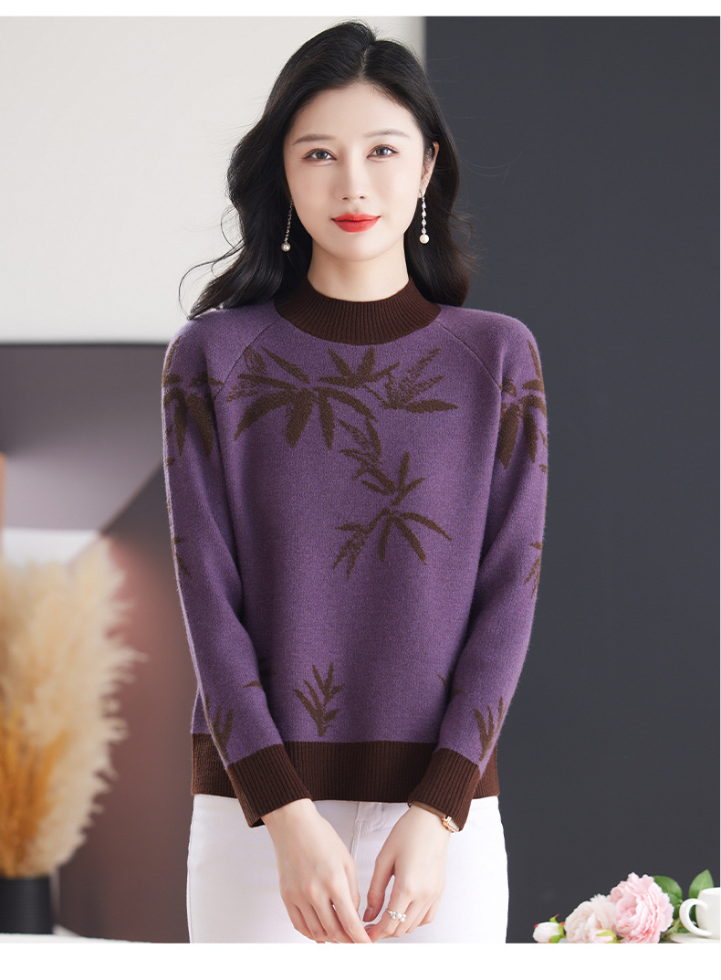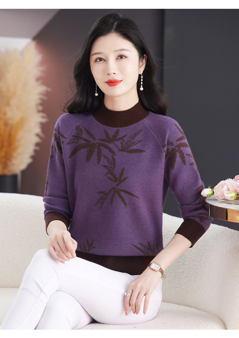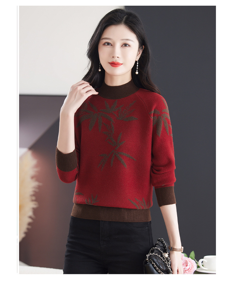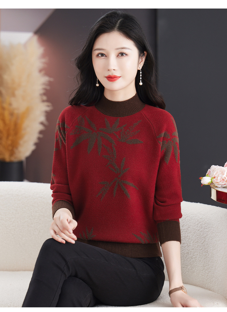 CC-103-7931新款时尚复古提花针织衫毛衣女士宽松厚款半高领百搭减龄上衣
