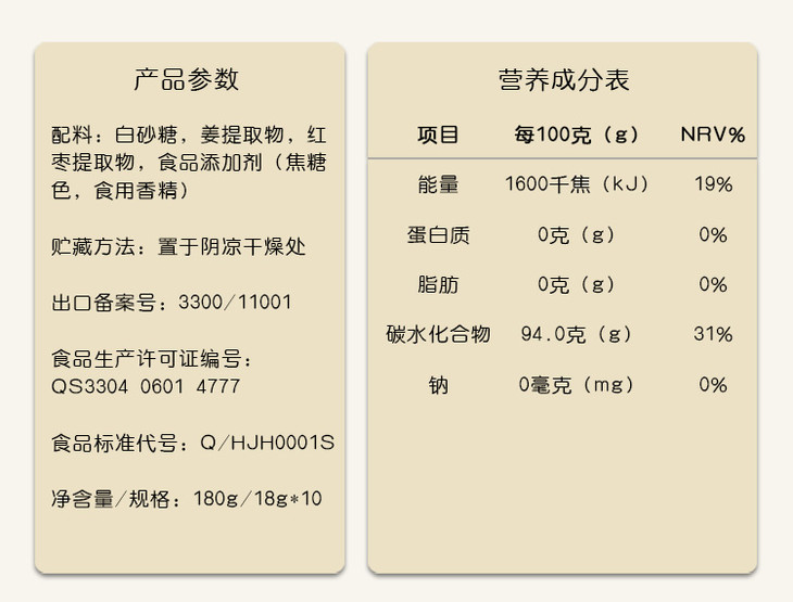 | 配料表:白砂糖、姜提取物、红枣提取物 | |