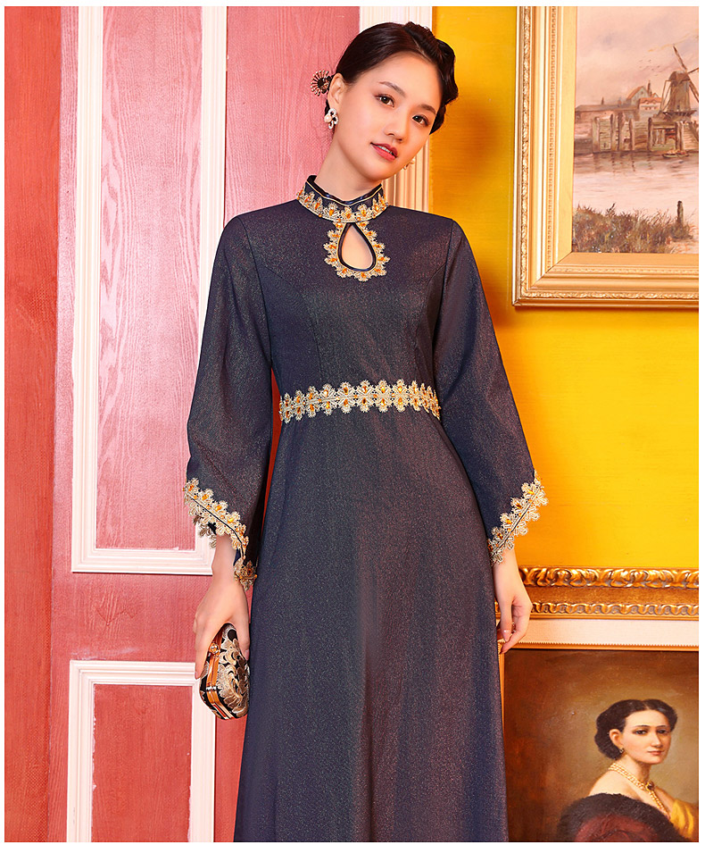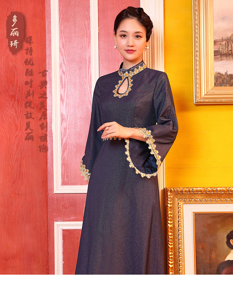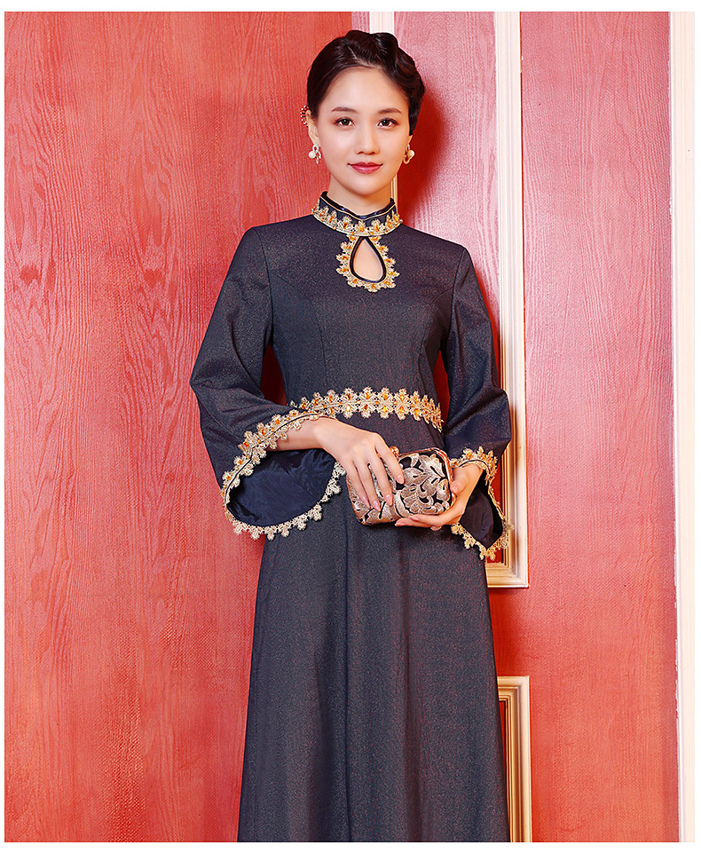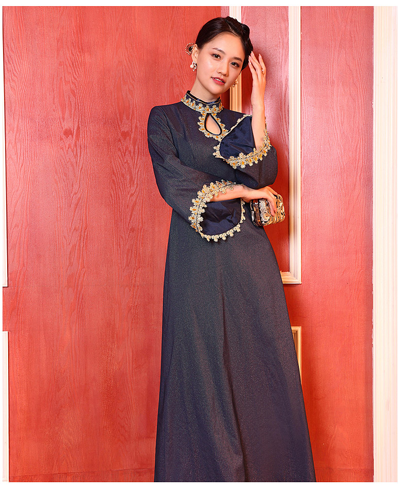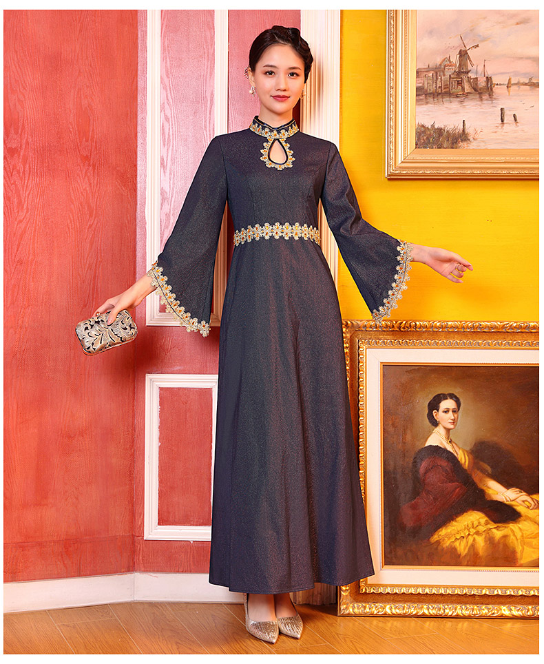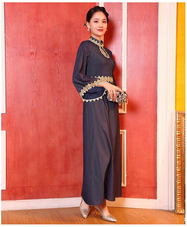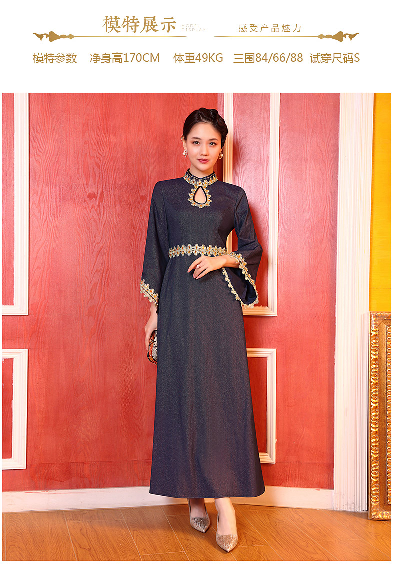 DLQ-A2758新款高端名媛气质修身立领钉珠花边长款礼服裙