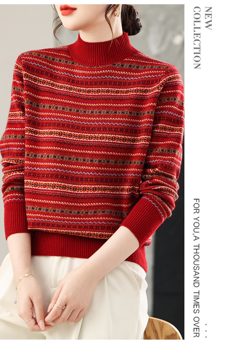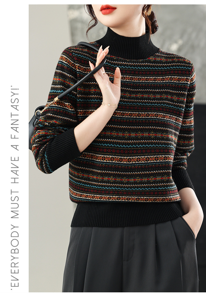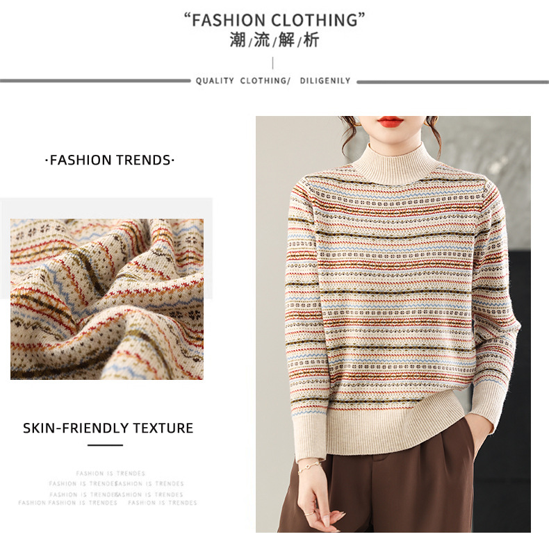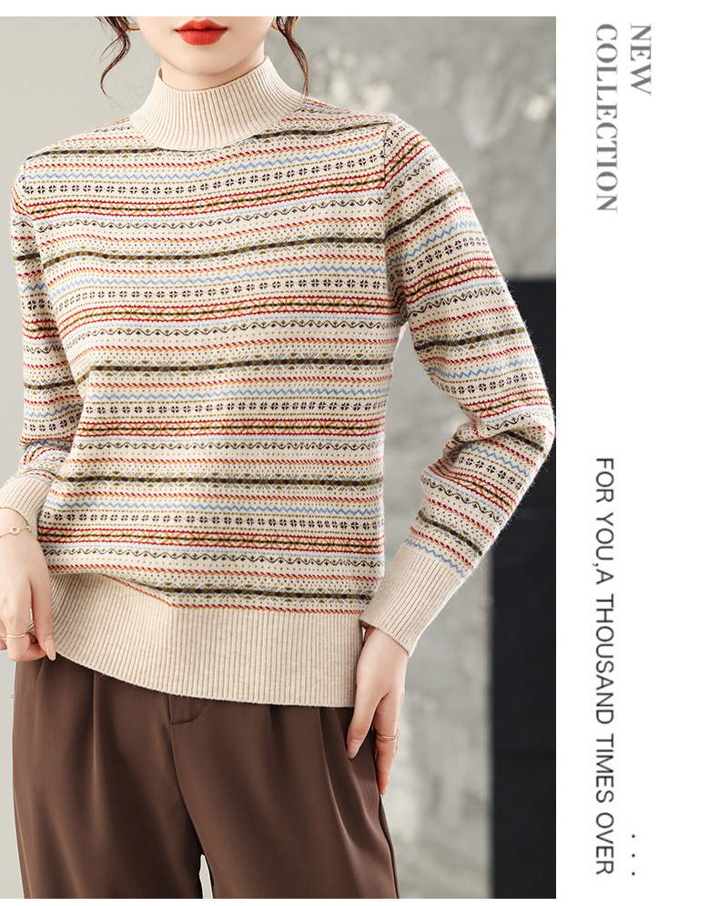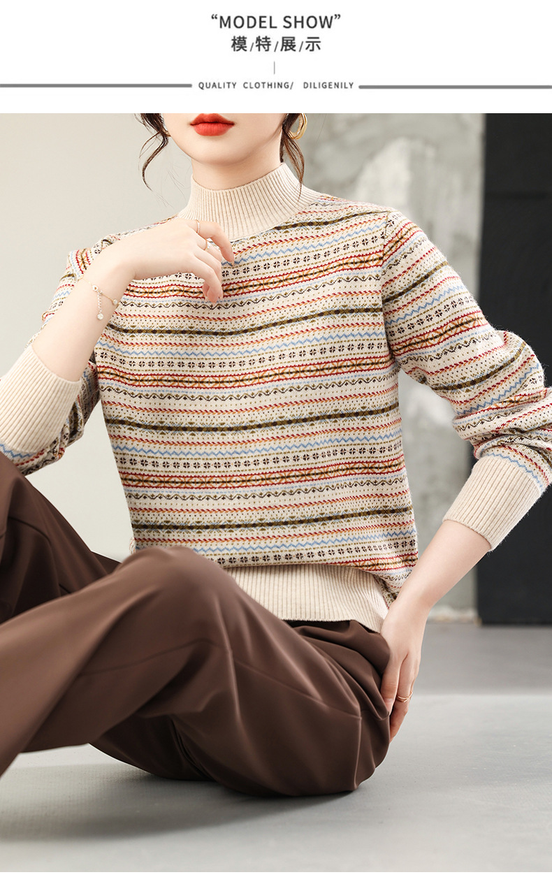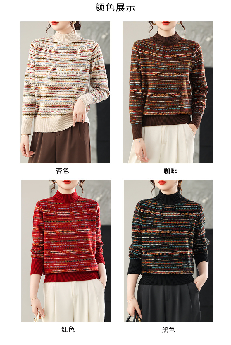 CC 25348复古条纹针织衫漂亮减龄上衣半高领宽松大码