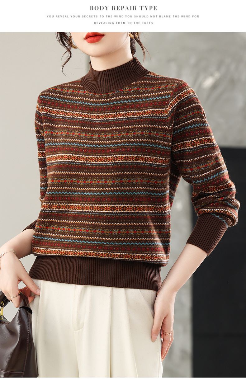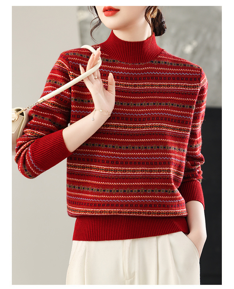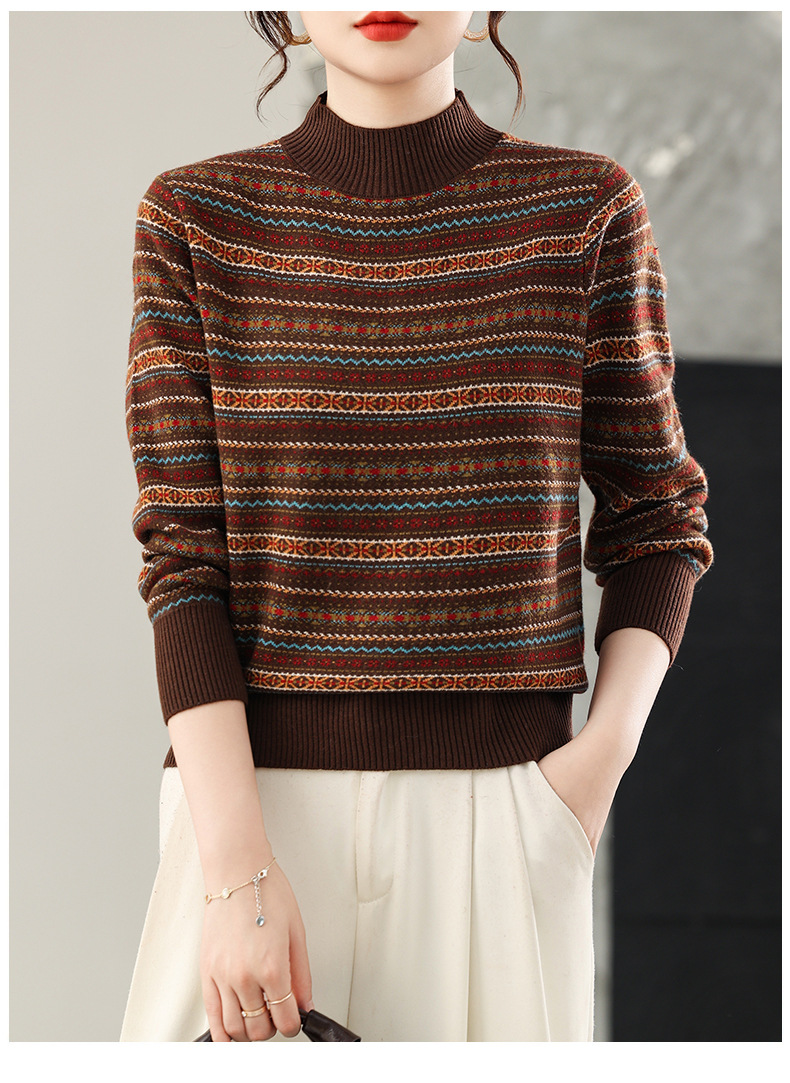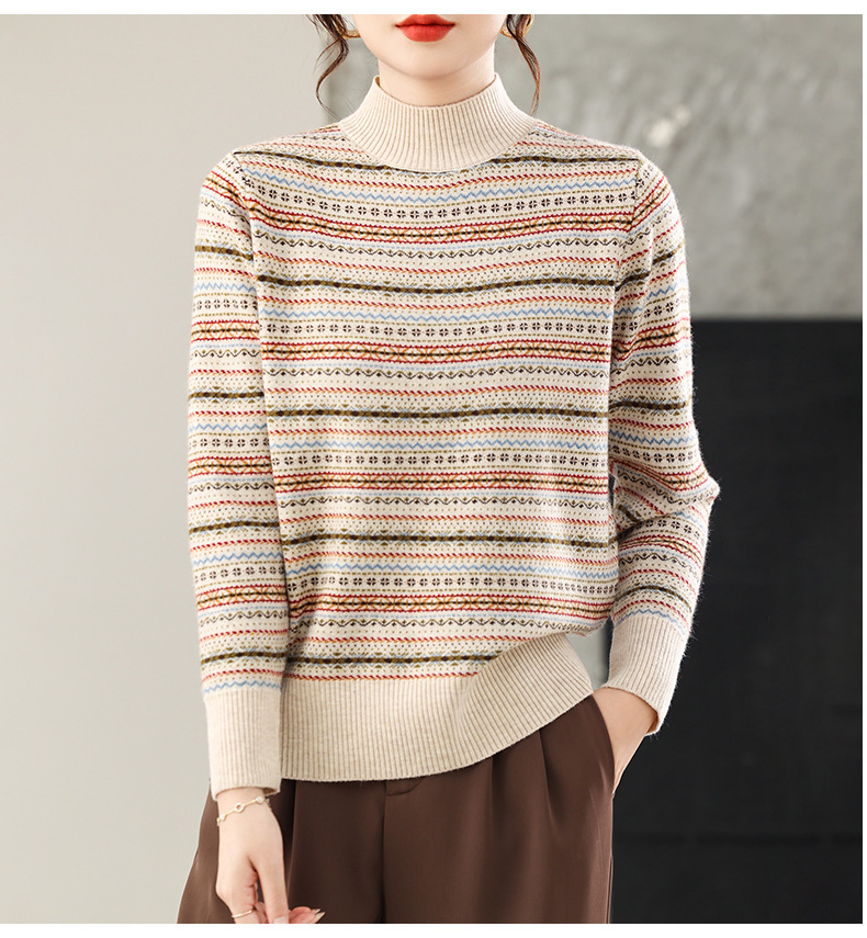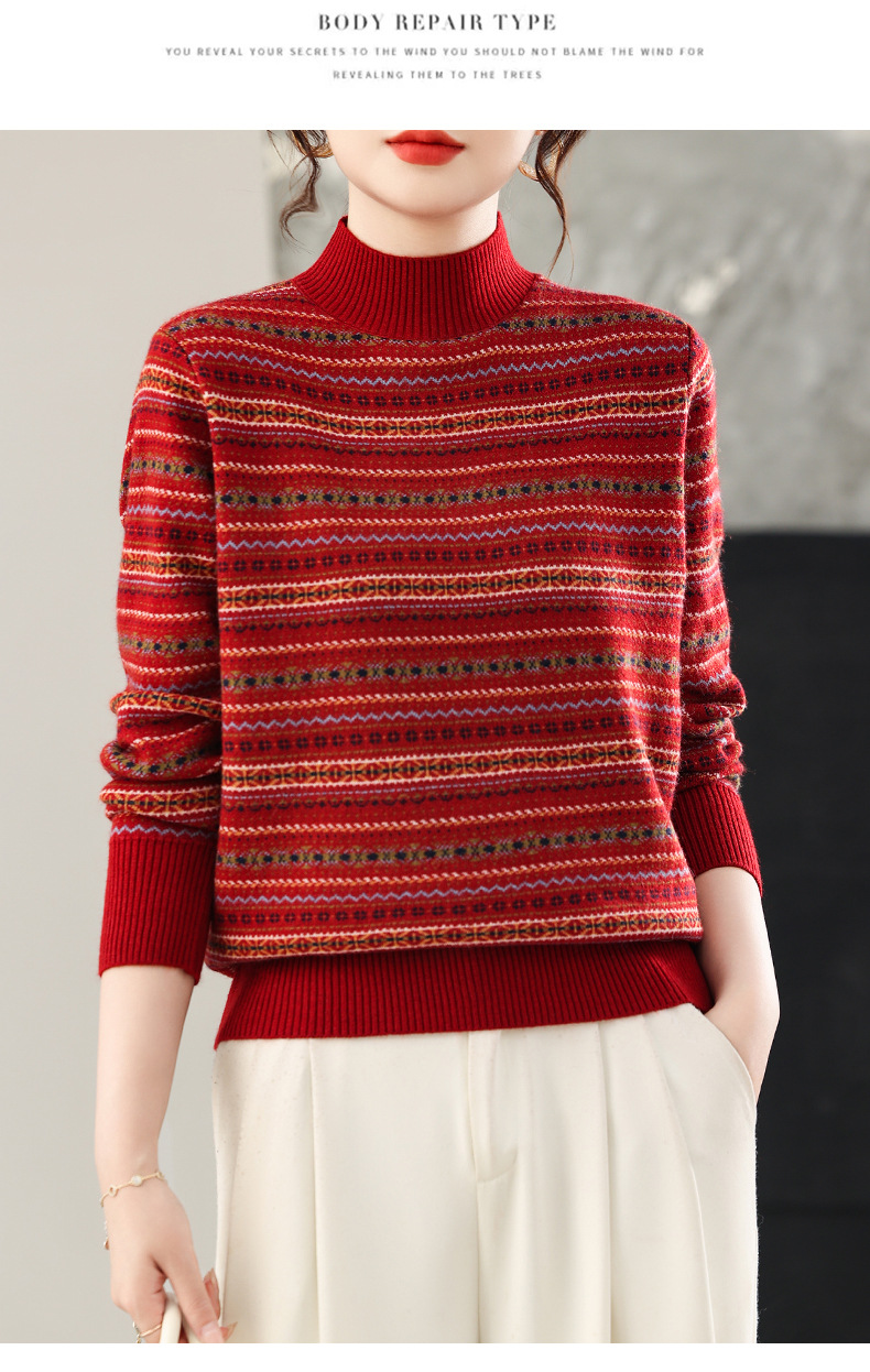CC 25348复古条纹针织衫漂亮减龄上衣半高领宽松大码