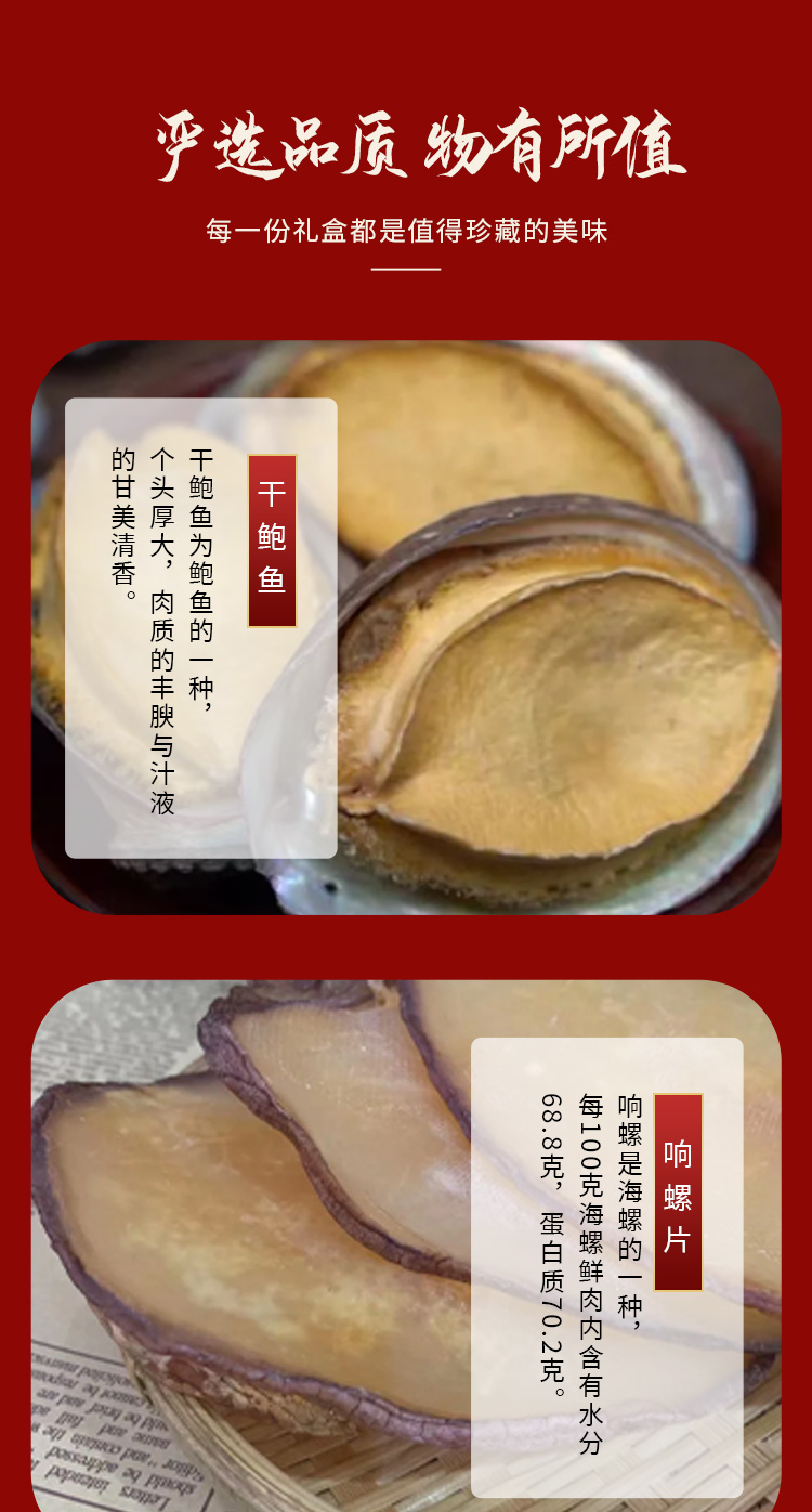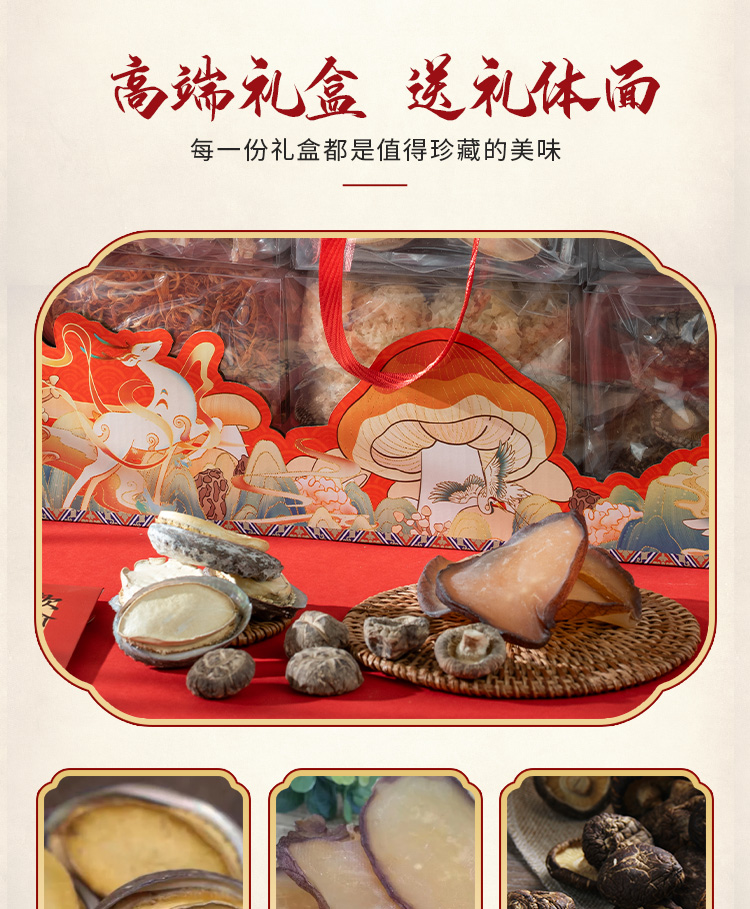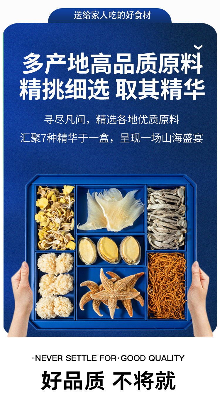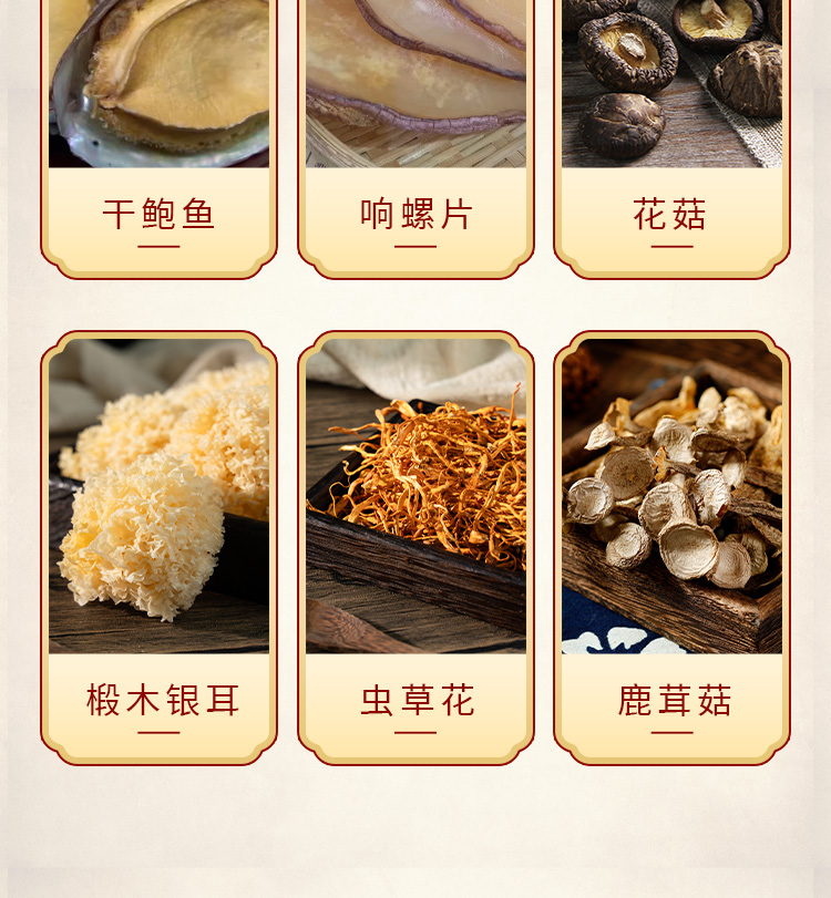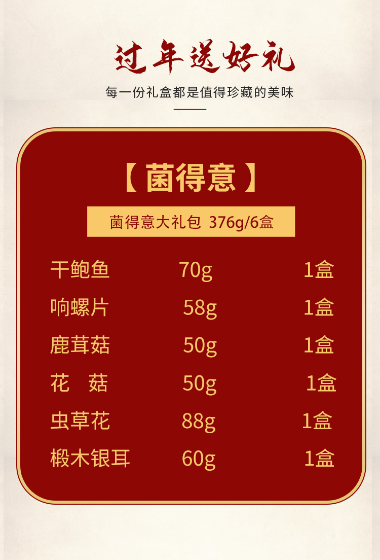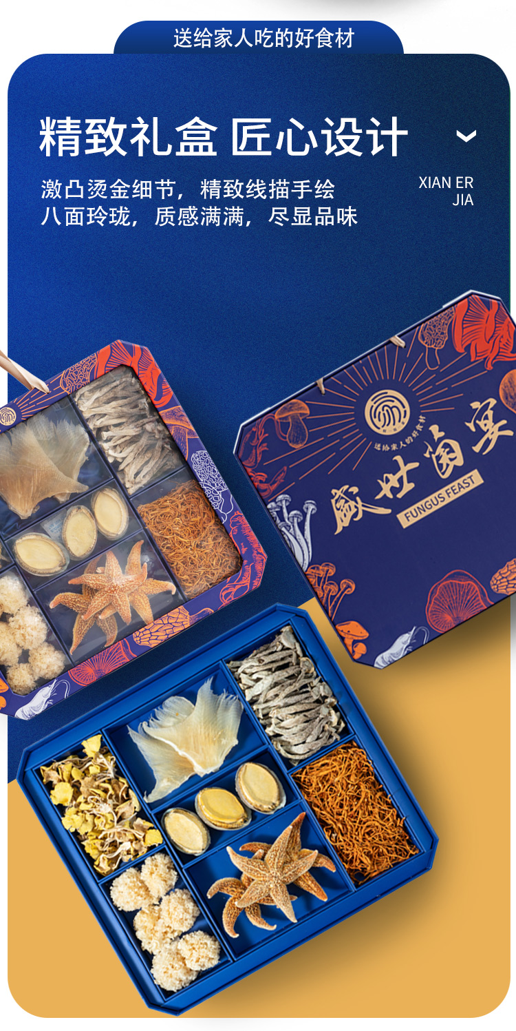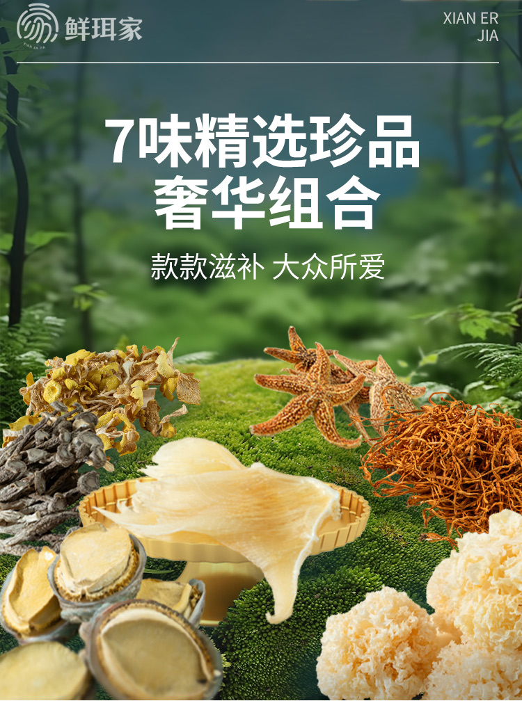 | 【品名】鲜珥家盛世菌宴/山珍海味礼盒 【规格】 盛世菌宴礼盒:冻干鲍鱼75g、鱼翅77g、虫草花50g、鹿茸菇50g、鸡油菌23g、海星55g、椴木银耳54g 【保质期】12个月 【储存方法】请置于常温阴凉、通风干燥处 【产地】福建宁德 【发货地】福建宁德 【发货快递】申通、圆通、邮政、韵达 【不发货区域】新疆、西藏、港澳台地区不发 【补邮费地区】青海+10元/件,内蒙、甘肃、宁夏+5元/件,北京+2元/件 【发货时效】48小时,周末节假日顺延 |