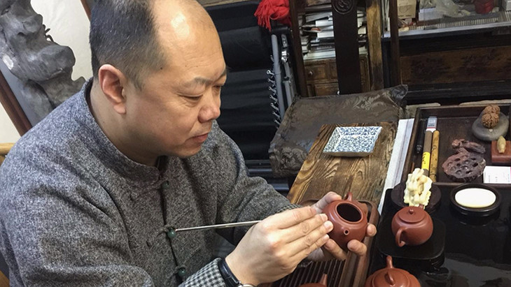 终于练就了在柔软的紫砂胚体上雕刻的高超本领,