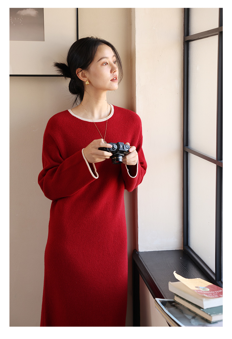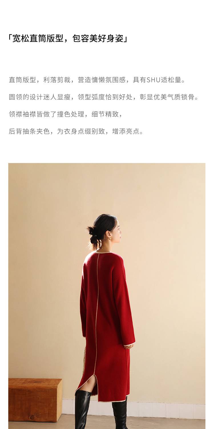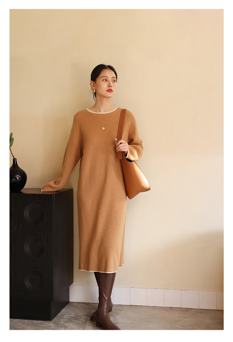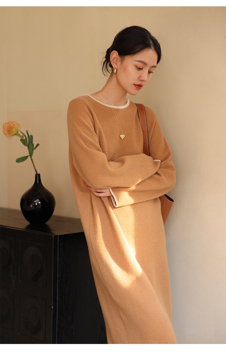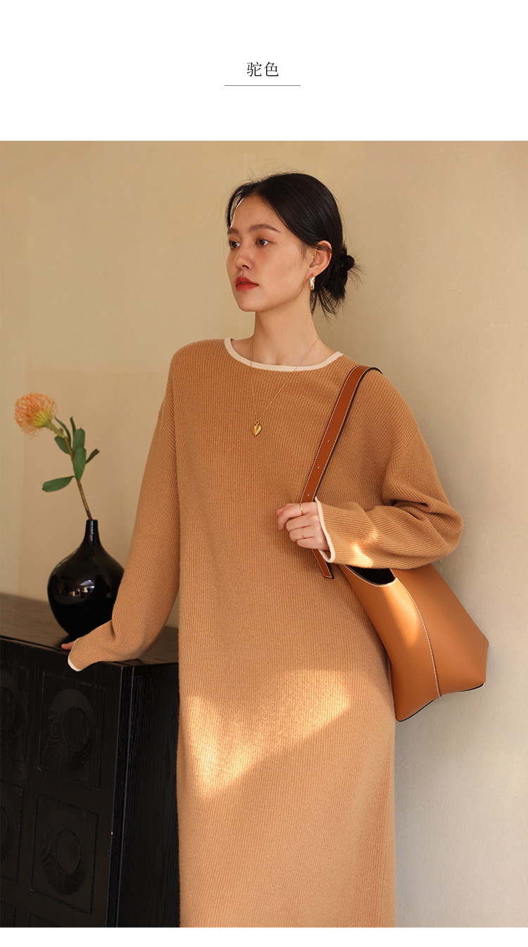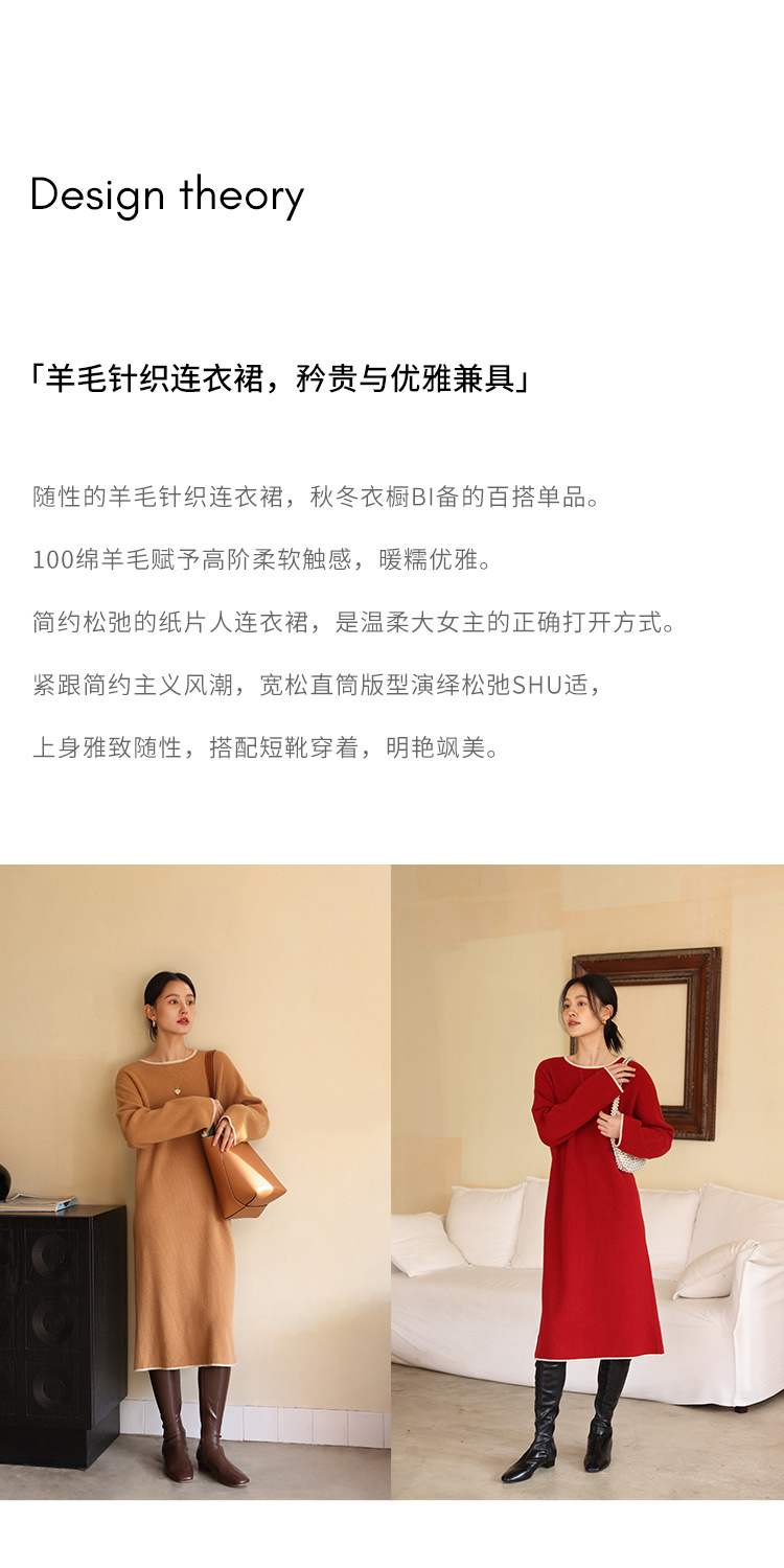 HeyDress100绵羊毛针织连衣裙冬季法式复古宽松慵懒感撞色气质裙